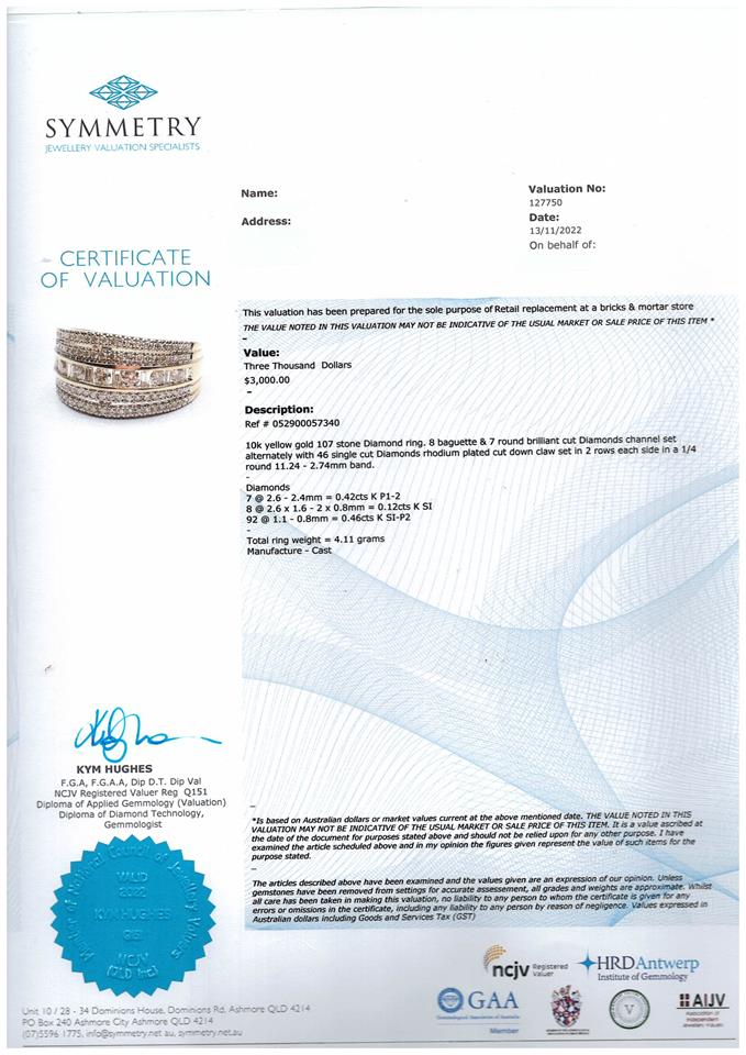 Diamond Dress ring with round brilliant cut, baguette cut, and round single cut Diamonds totalling 1.00ct. 10ct yellow gold. Ring size O. Weight: 4.2g With Valuation Certificate #052900057340.