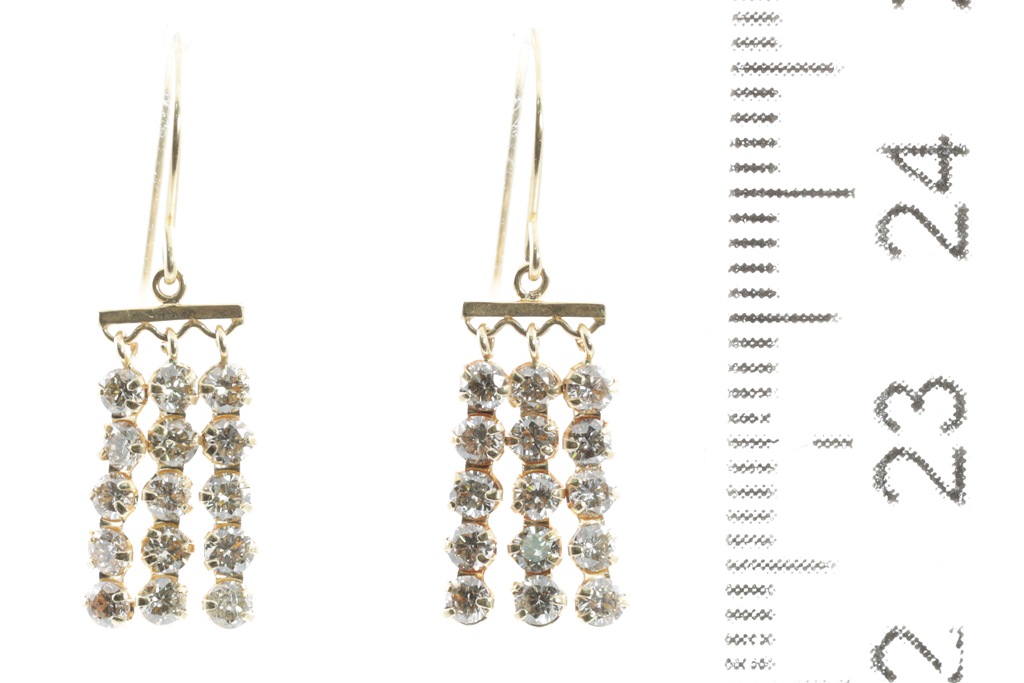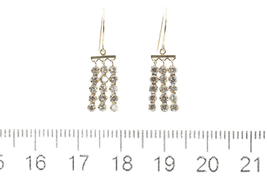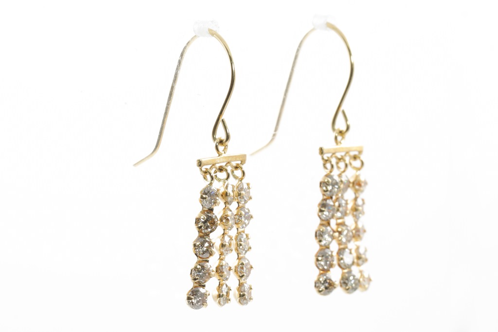 Diamond 3 row shepherds hook drop earrings with round Diamonds totalling 1.00ct (Estimated grading: J-K SI). 18ct yellow gold with silicon backs. Weight: 1.0g (Pre-owned)