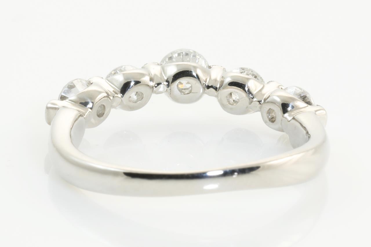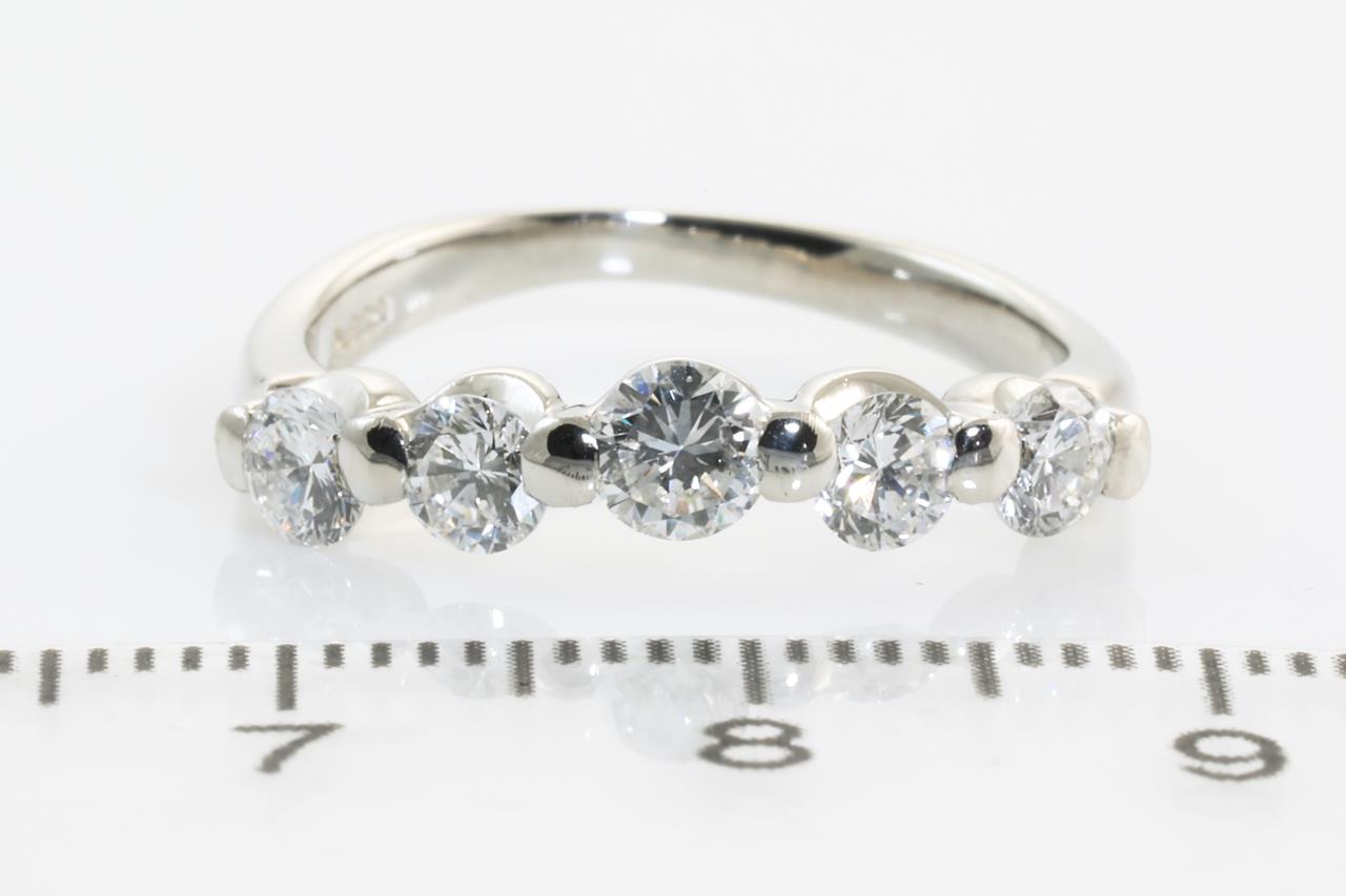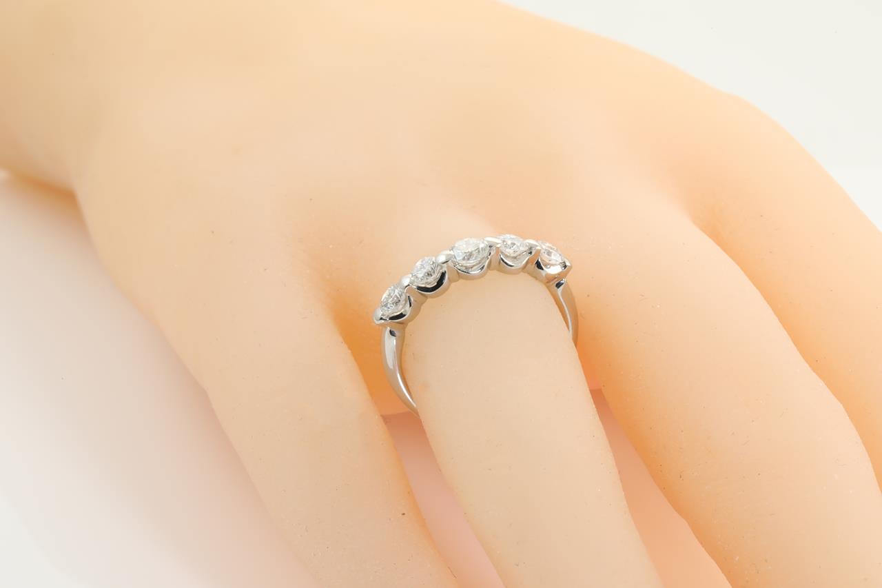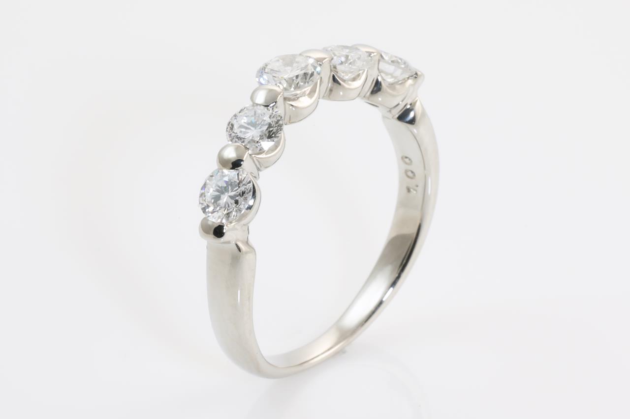 Diamond eternity ring with 5 round Diamonds totalling 1.00cts (Estimated grading: H SI). Platinum. Ring size: M1/2 - Note this ring can only be resized up by a maximum of 3 sizes, down by ring clip. Weight: 4.8g (Pre-owned)