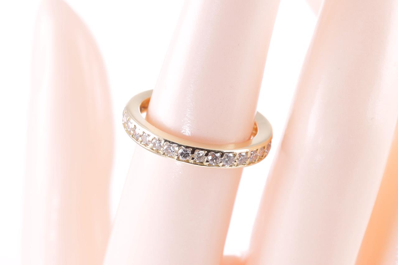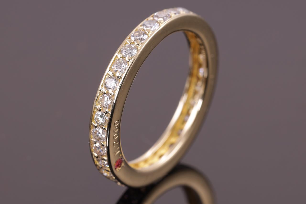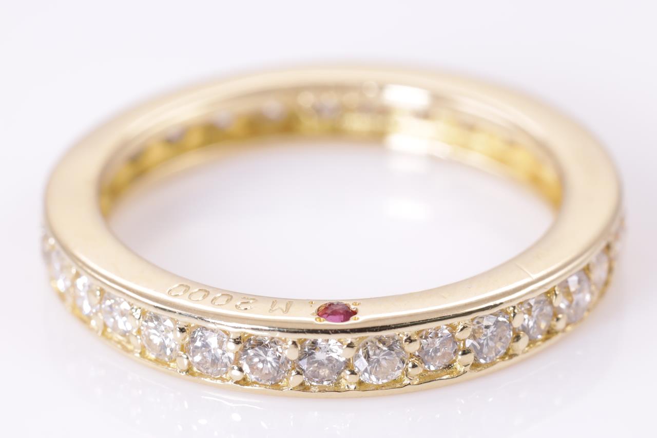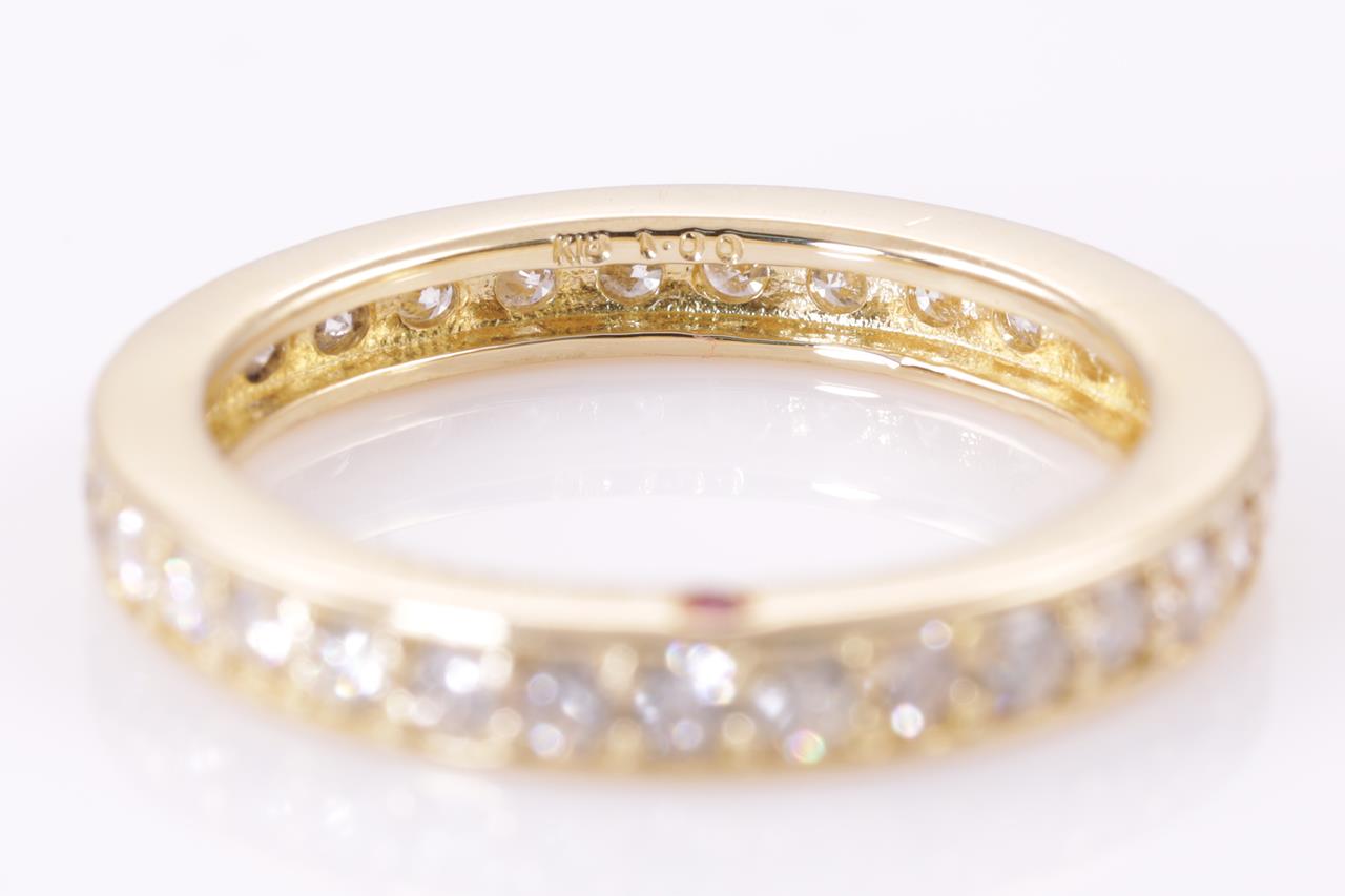 Diamond full hoop eternity Ring with round Diamonds totalling 1.00cts (Estimated grading: G-H P1-P2) and a round Ruby of approximately 0.02ct. 18ct yellow gold. Ring size N - ring resizing is not recommended. Weight: 3.7g (Pre-owned)