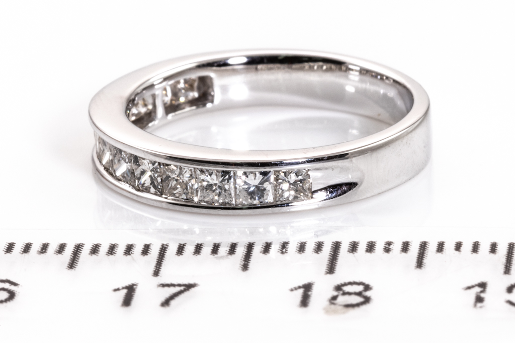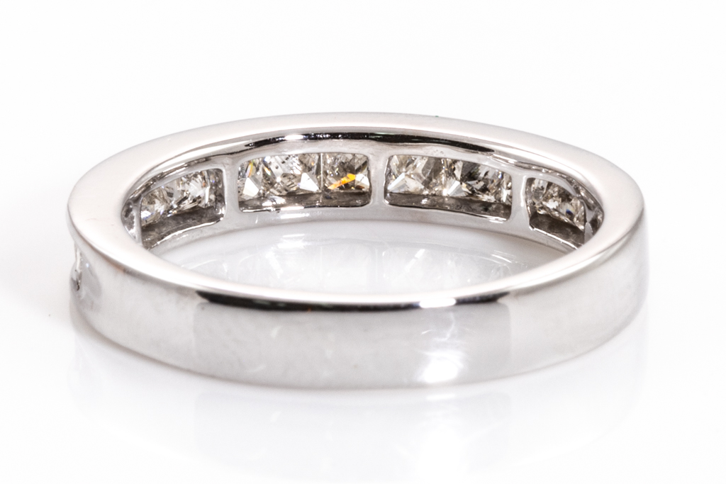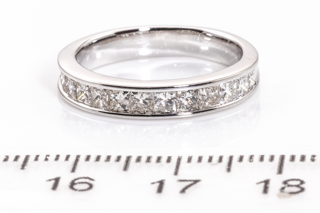 Diamond half hoop eternity ring with 13 princess cut Diamonds totalling 1.00cts (Estimated grading I-J SI-P1). 18ct white gold. Ring size L1/2 - ring risizing is not recommended. Weight: 3.9g. (Pre-owned)