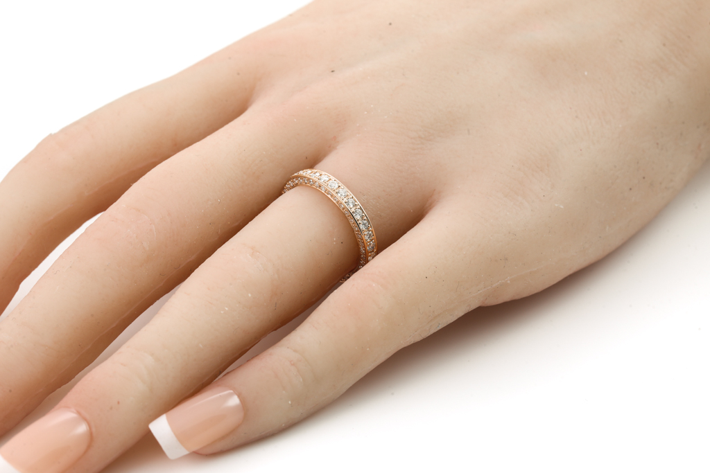 Diamond full hoop eternity ring with round Diamonds totalling 1.00cts (Estimated grading: H SI). 18ct rose gold. Ring size L1/2 - ring resizing is not recommended. Weight: 4.1g. (Pre-owned)