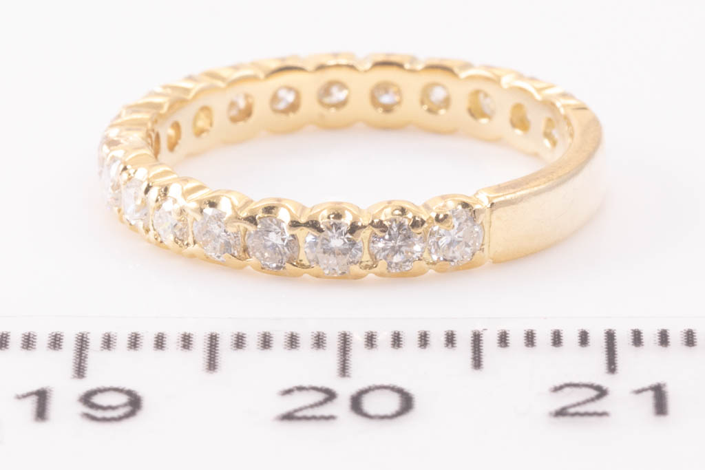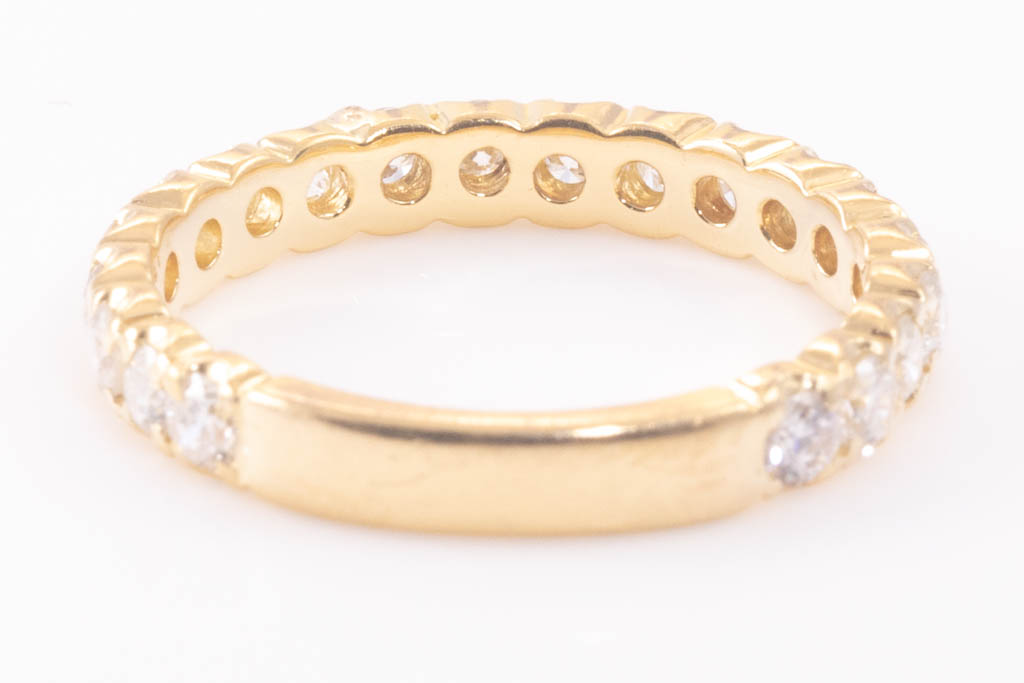 Diamond eternity ring with round Diamonds totalling 1.00cts (Estimated grading: H-I SI-P1). 18ct yellow gold. Ring size K1/2 - ring resizing is not recommended. Weight: 2.8g (Pre-owned)