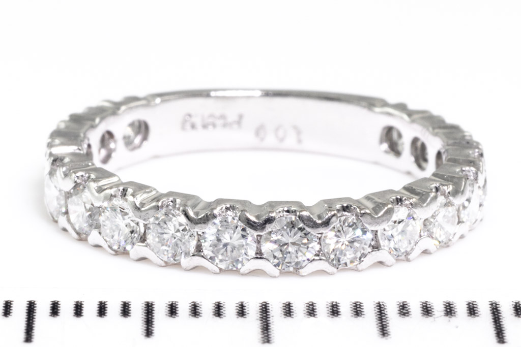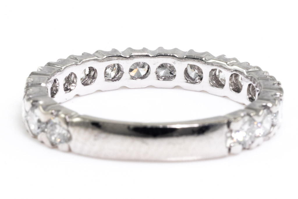 Diamond eternity ring with round Diamonds totalling 1.00cts (Estimated grading: G SI). Platinum. Ring size K- ring resizing is not recommended. Weight: 3.6g. (Pre-owned)