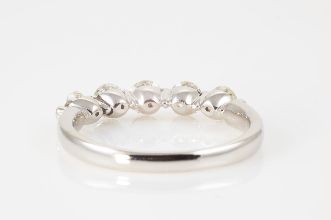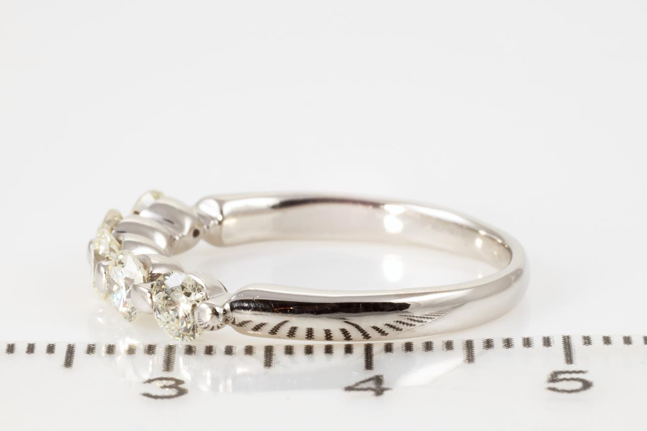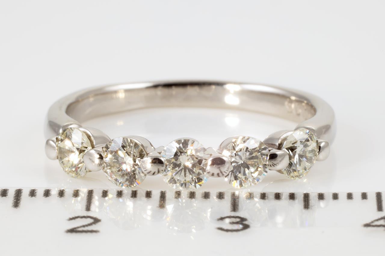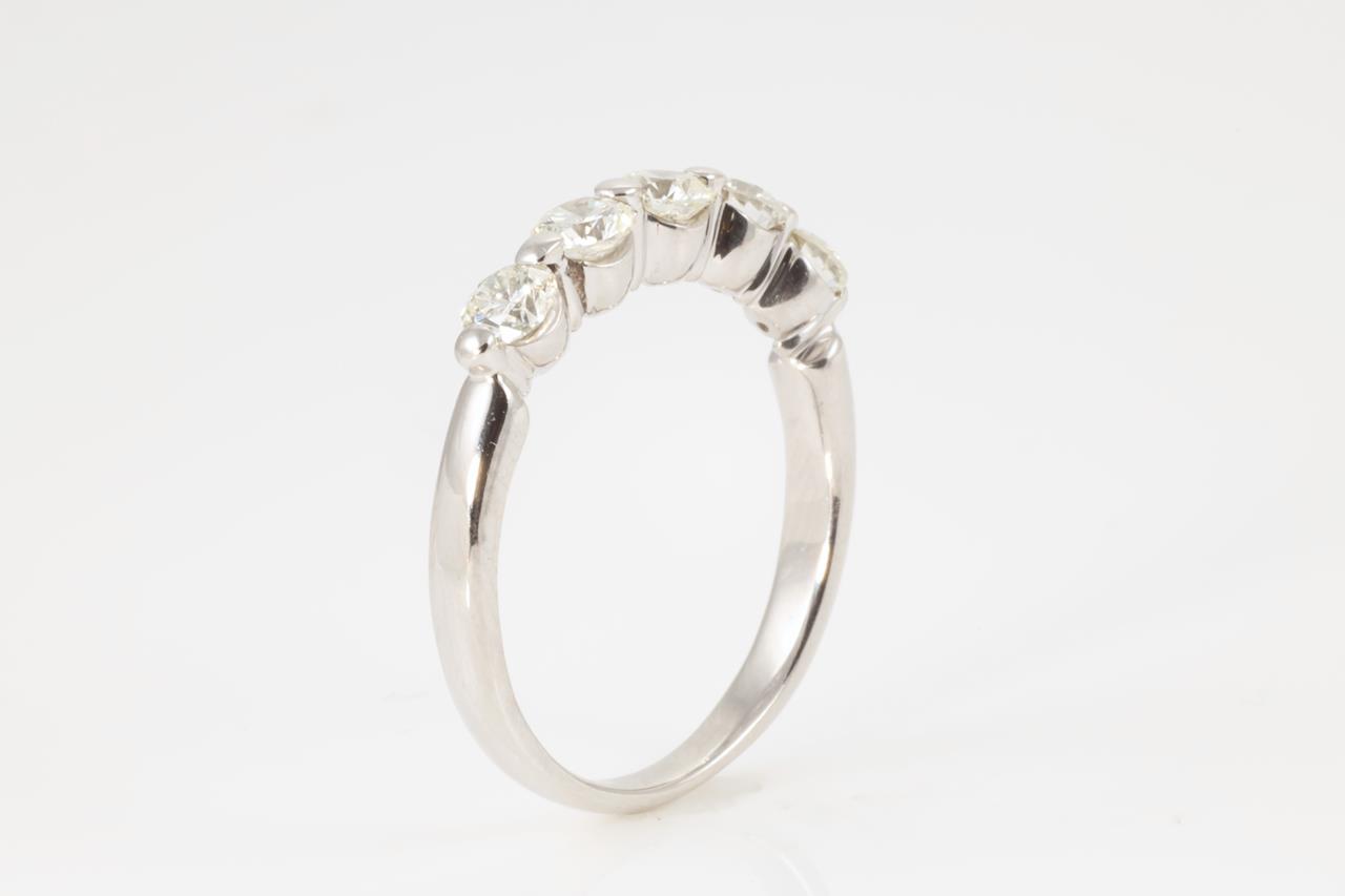 Diamond eternity ring with 5 round Diamonds totalling 1.00cts (Estimated grading: K SI). Platinum. Ring size O - cannot be resized up, down with ring clip. Weight: 4.8g (Pre-owned).