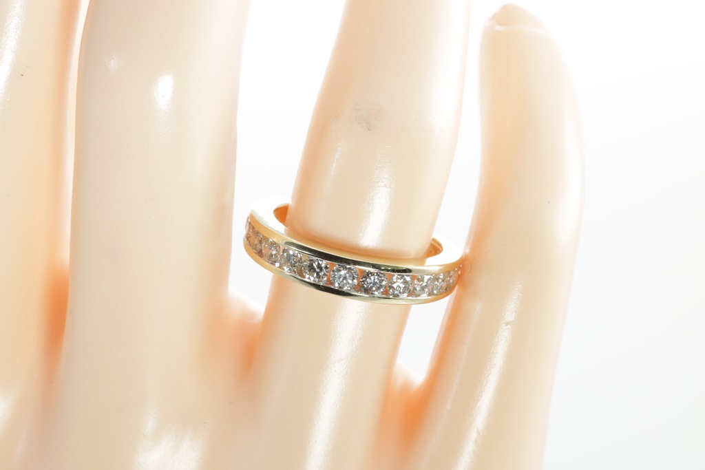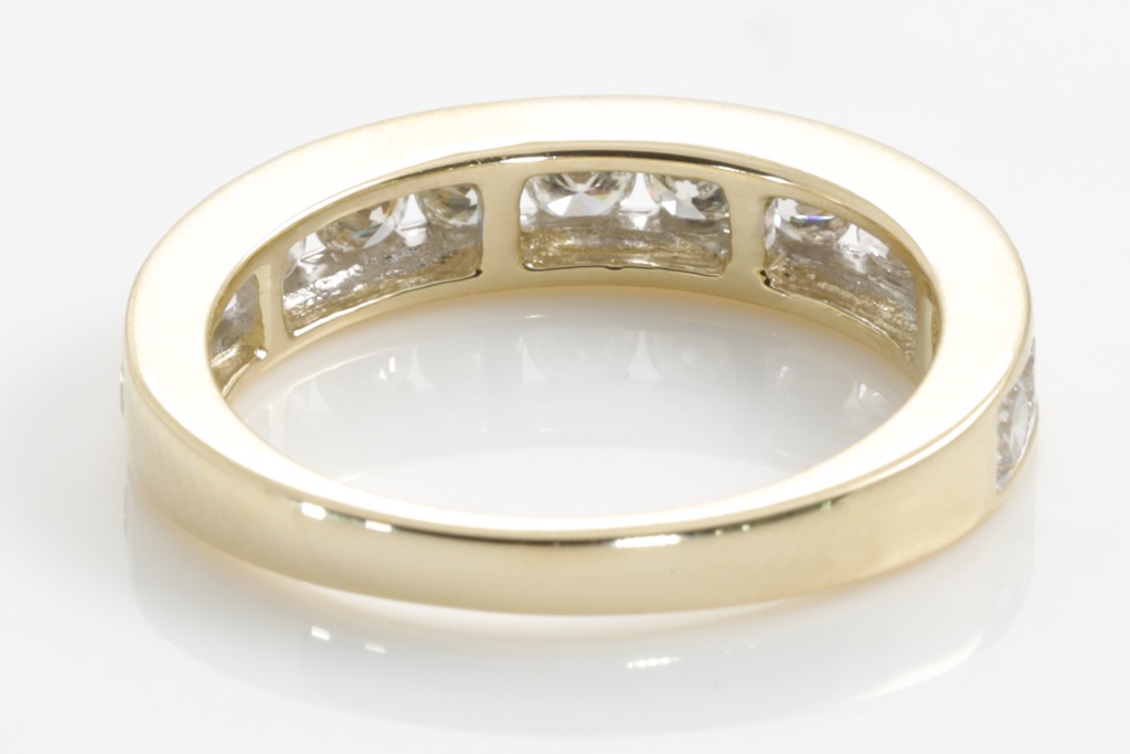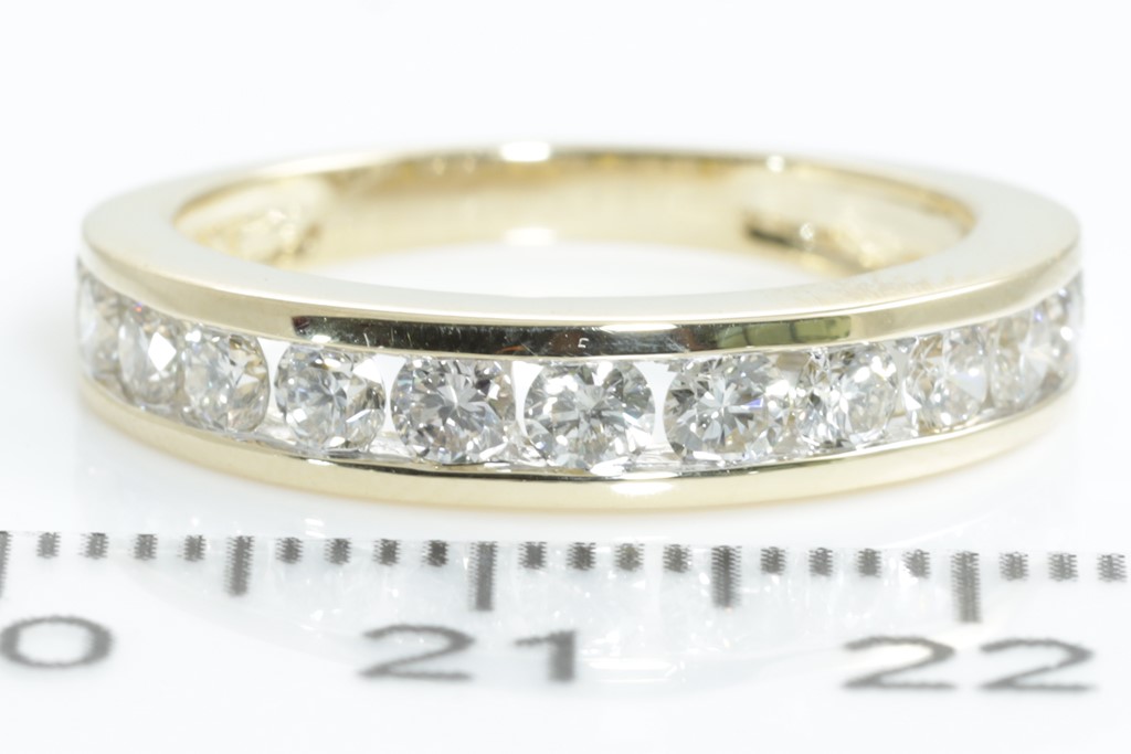 Diamond half hoop eternity ring with round Diamonds totalling 1.00cts (Estimated grading: H SI). 14ct yellow gold. Size: M1/2 - can be resized up by a maximum of 3 sizes, down with ring clip. Weight: 3.4g. (New)
