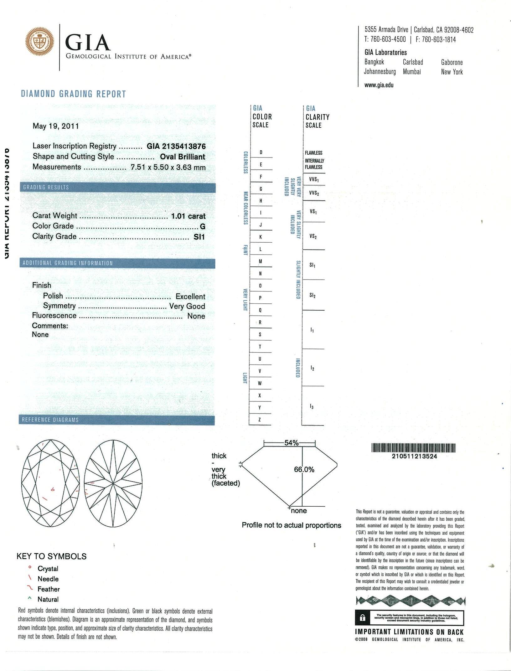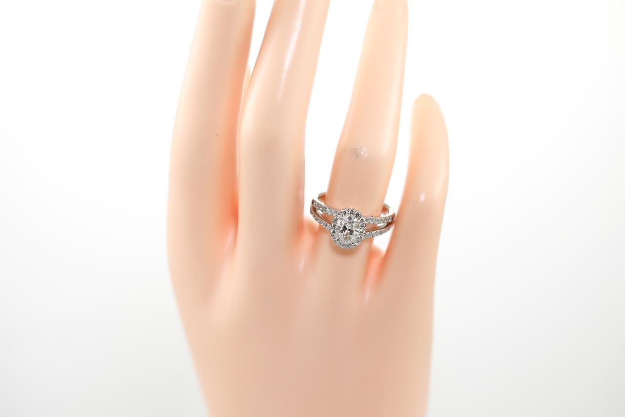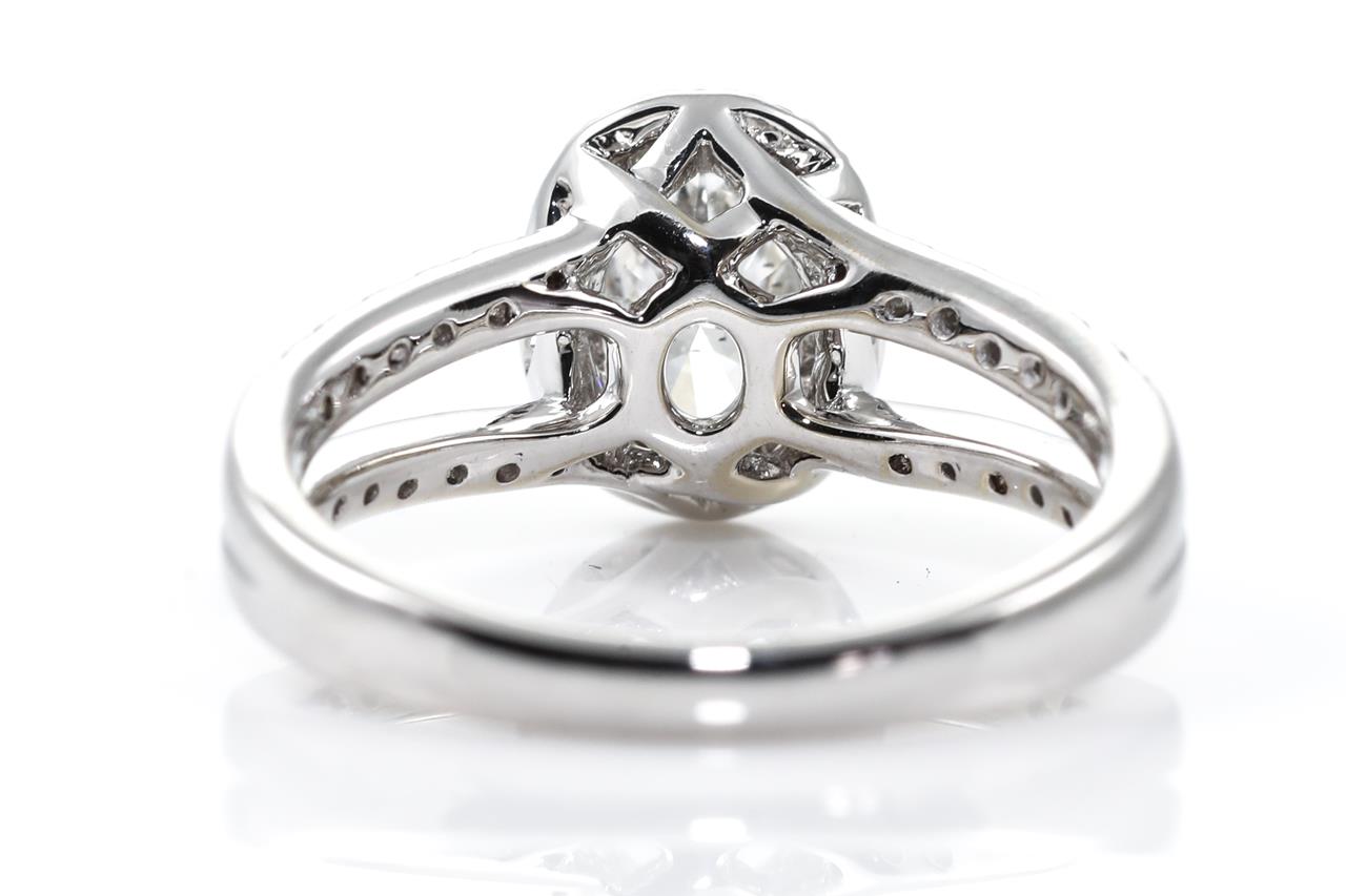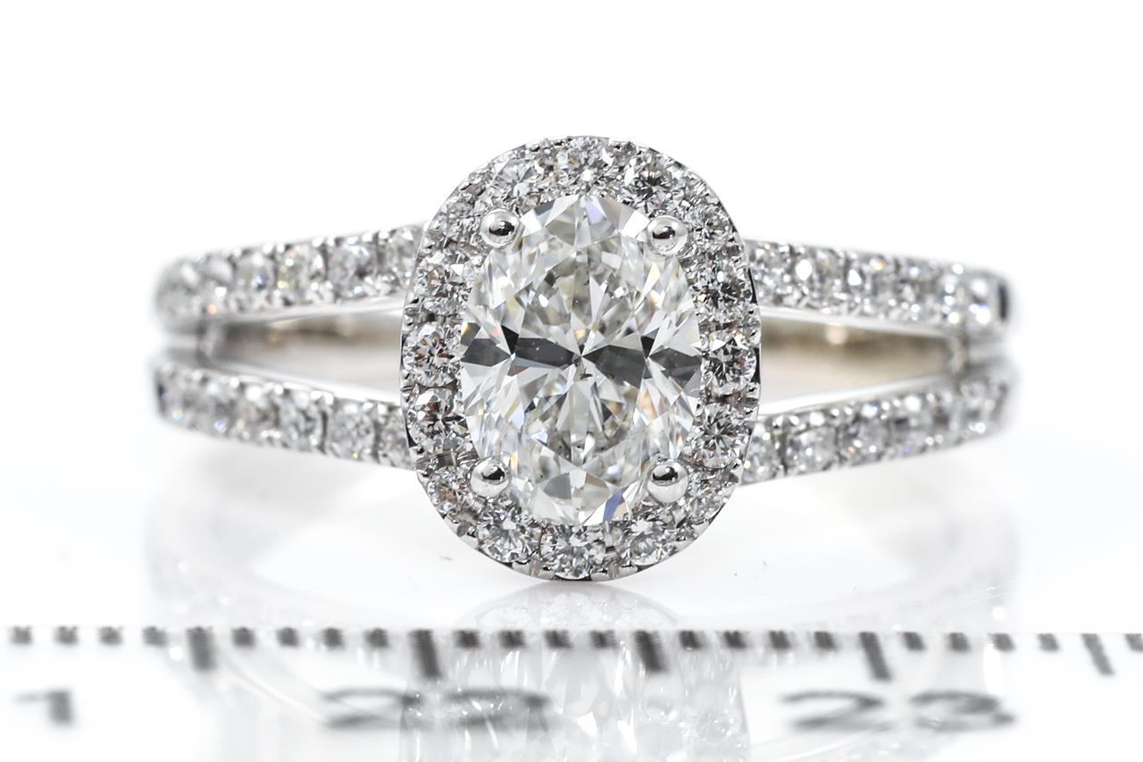Diamond halo ring with centre oval cut Diamond of 1.01ct (With GIA report graded as G SI1 #2135413876) and round Diamonds totalling approximately 0.44cts (Estimated grading: G SI). 18ct white gold. Ring size L. weight 5.2g. (As New)