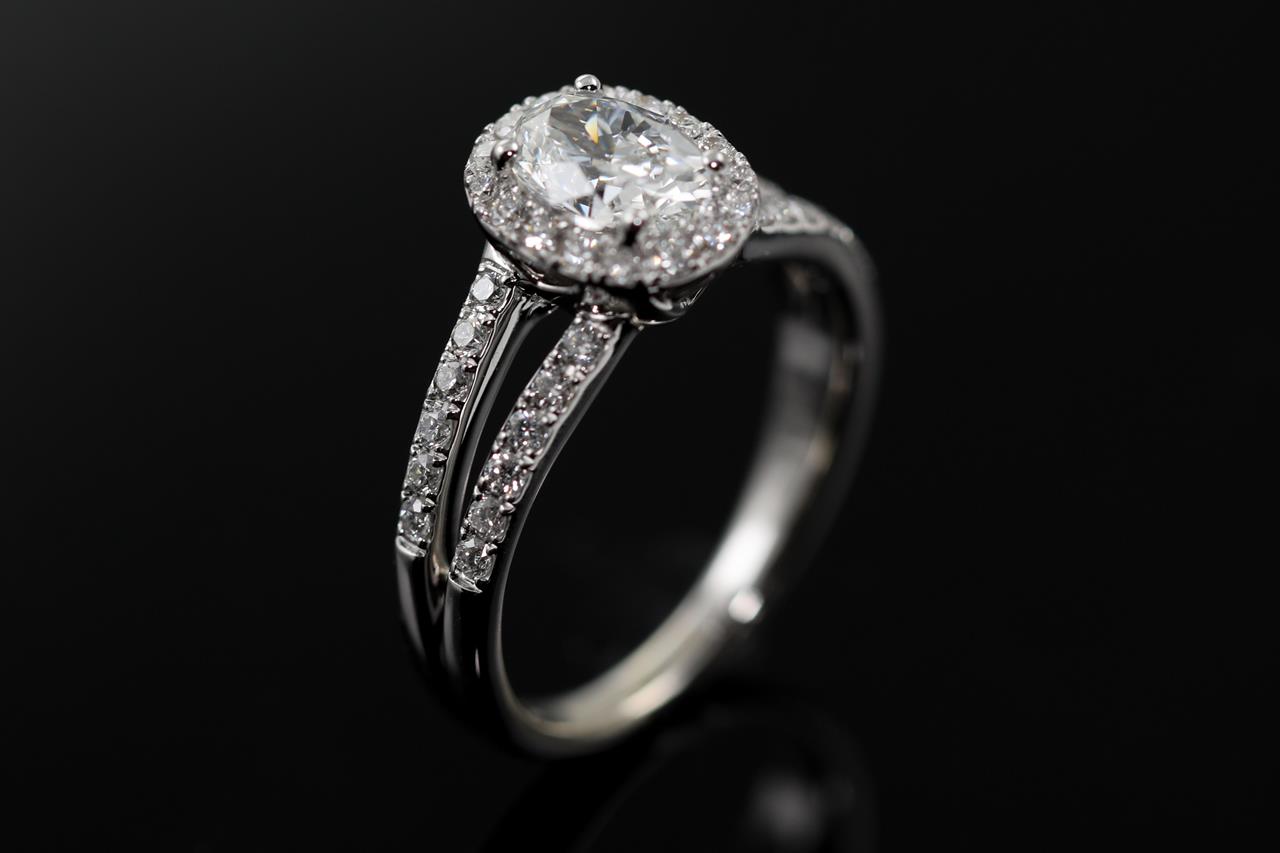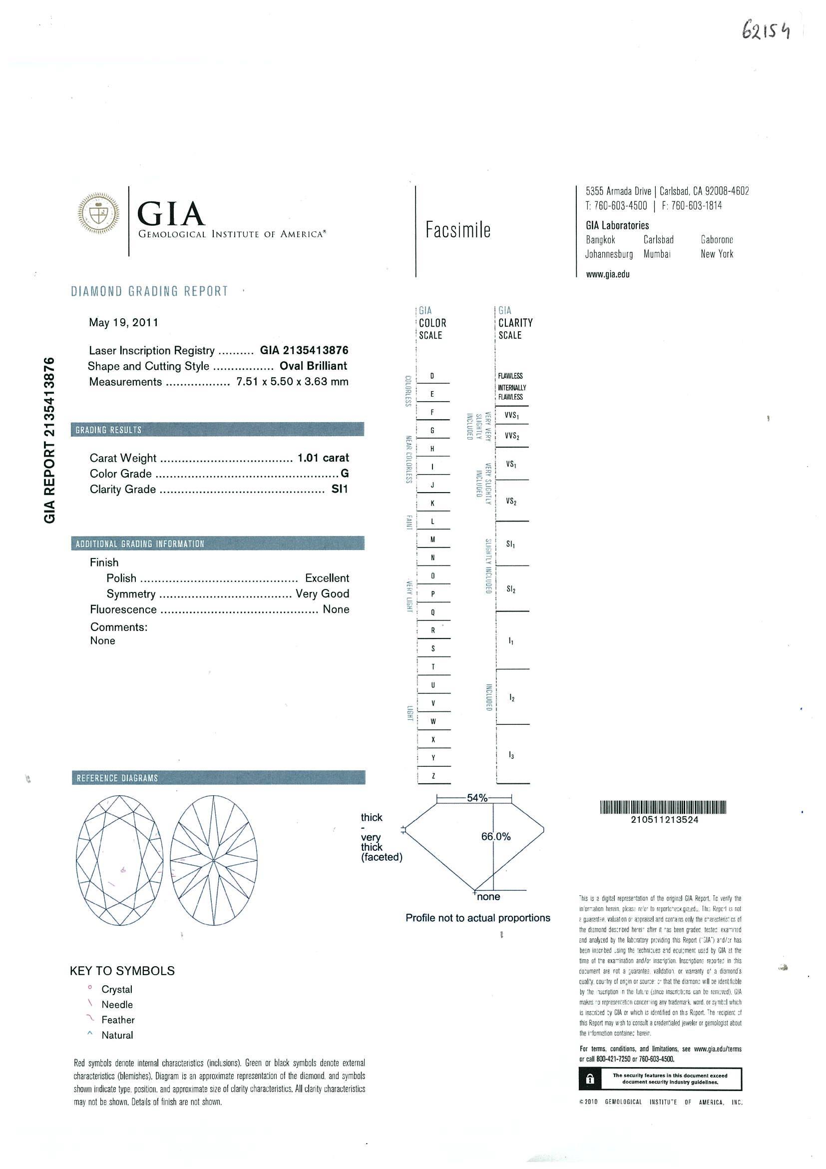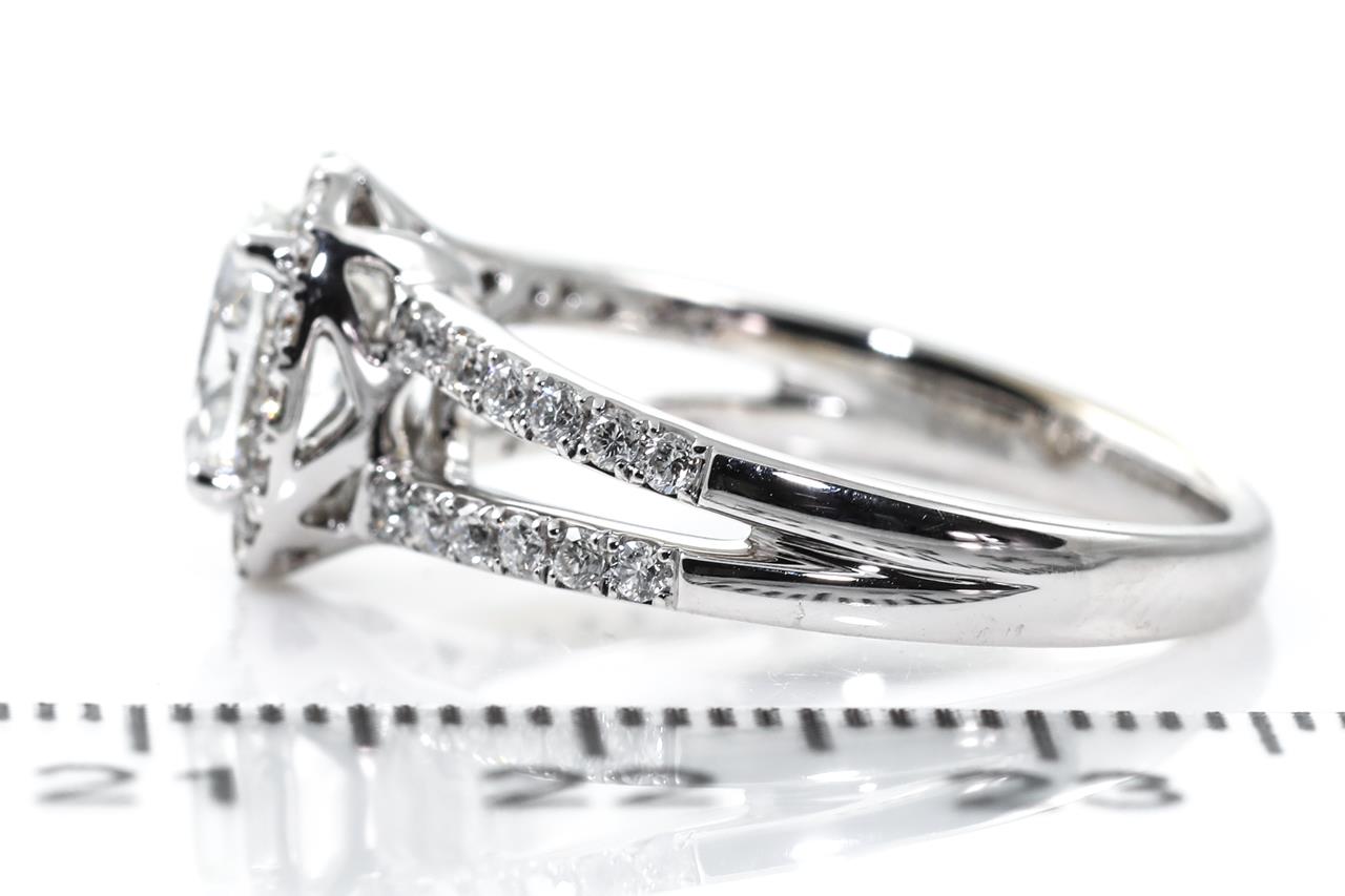 Diamond halo ring with centre oval cut Diamond of 1.01ct (With GIA report graded as G SI1 #2135413876) and round Diamonds totalling approximately 0.44cts (Estimated grading: G SI). 18ct white gold. Ring size L. weight 5.2g. (As New)