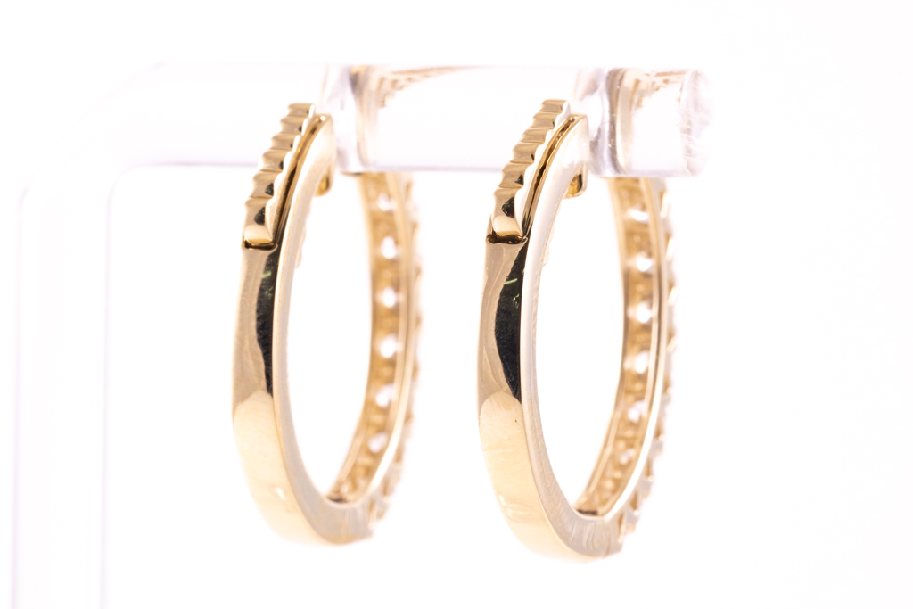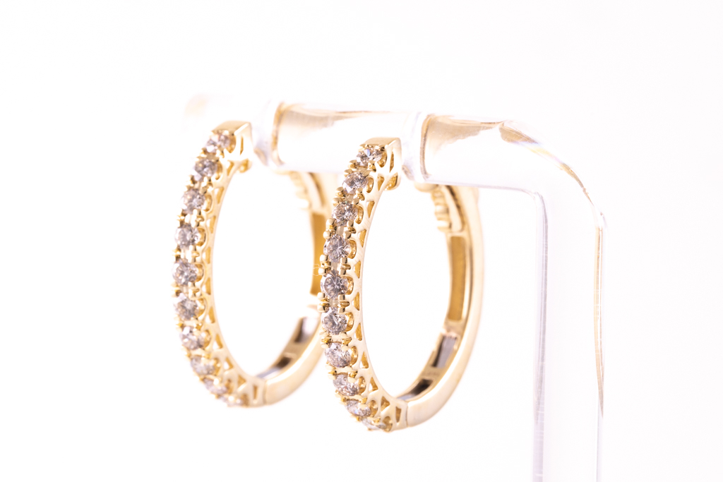 Diamond hoop earrings with 20 round Diamonds totalling 1.00cts (Estimated grading: H-I SI). 14ct yellow gold. Weight: 8.0g. (New)