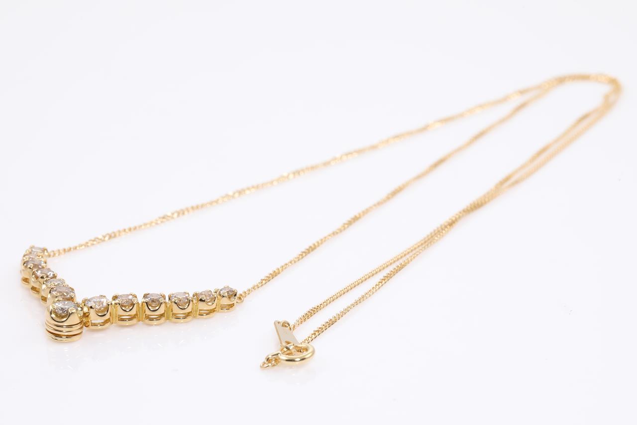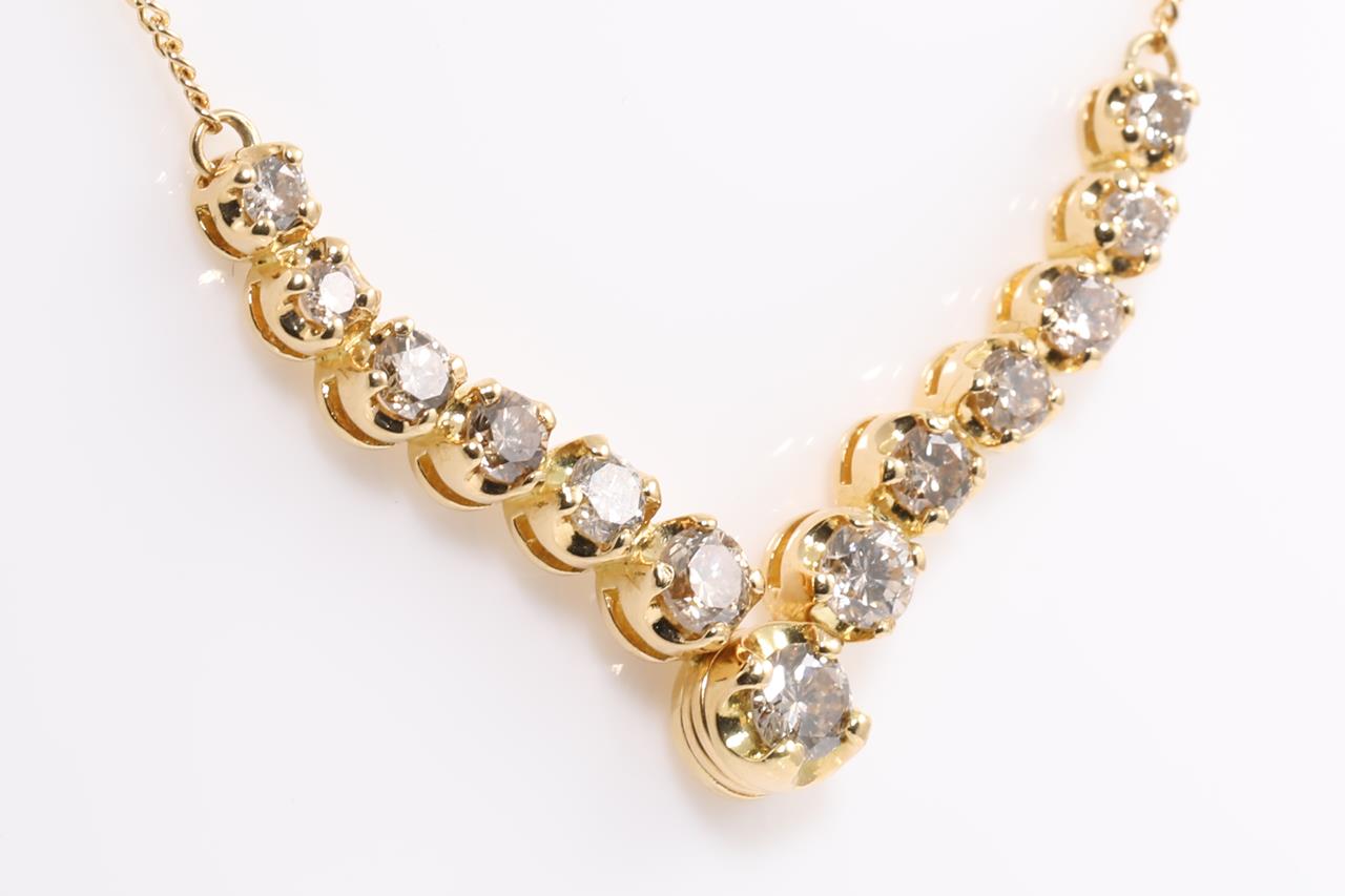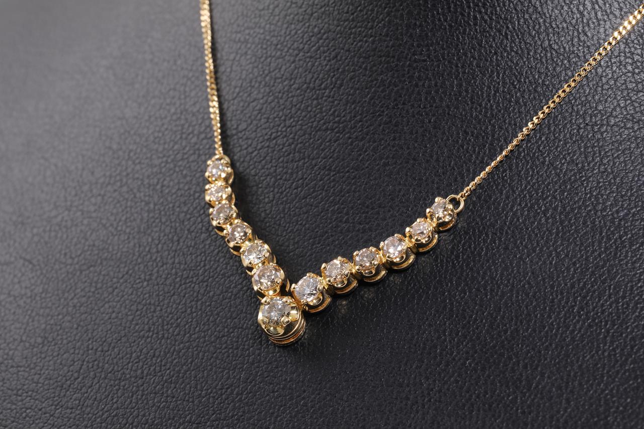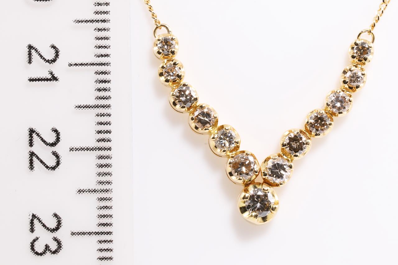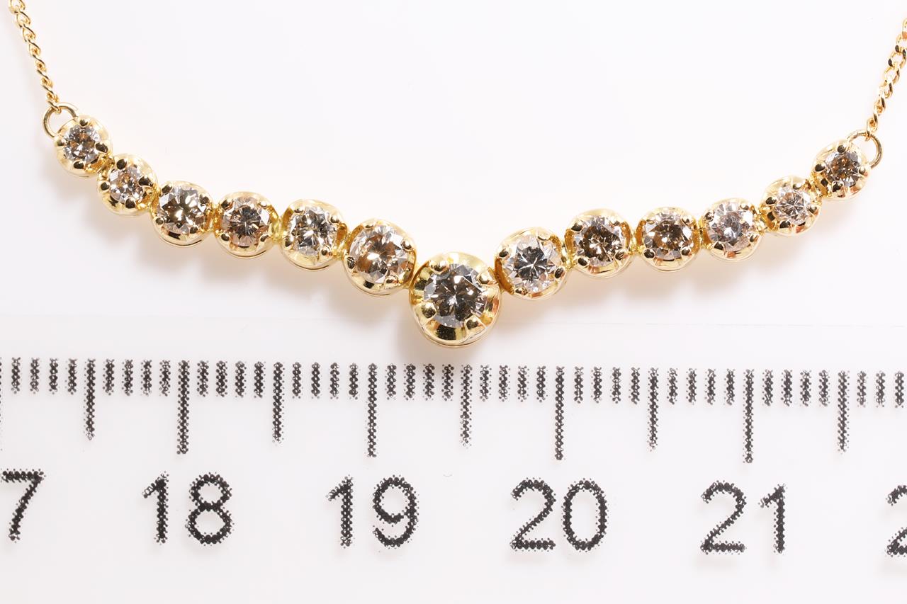 Diamond necklace with 13 graduated round Diamonds totalling 1.00cts (Estimated grading: Light Brown P1). 18ct yellow gold with 45cm chain. Weight: 5.1g (Pre-owned)