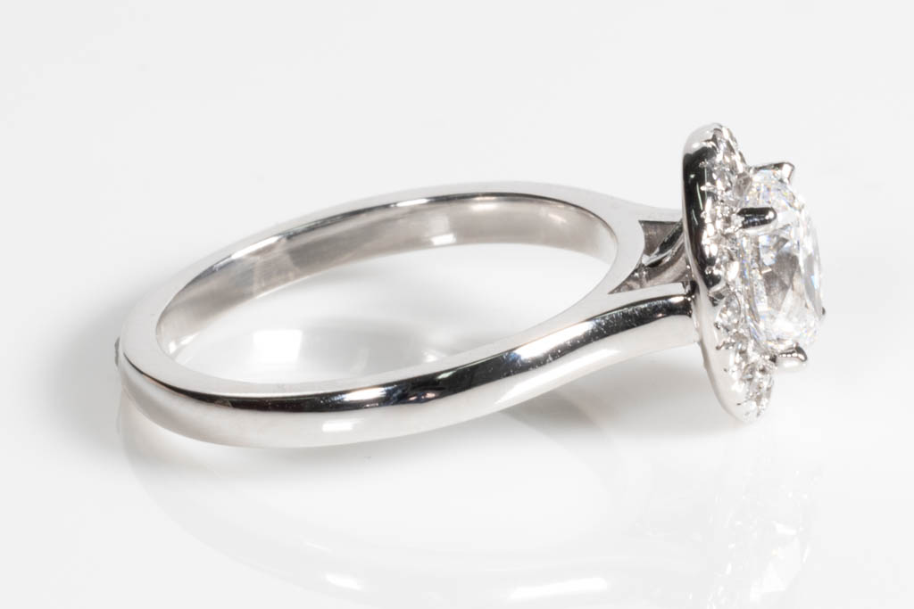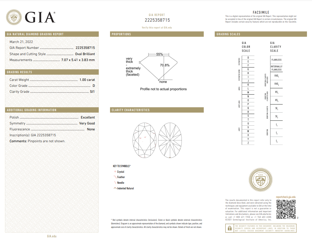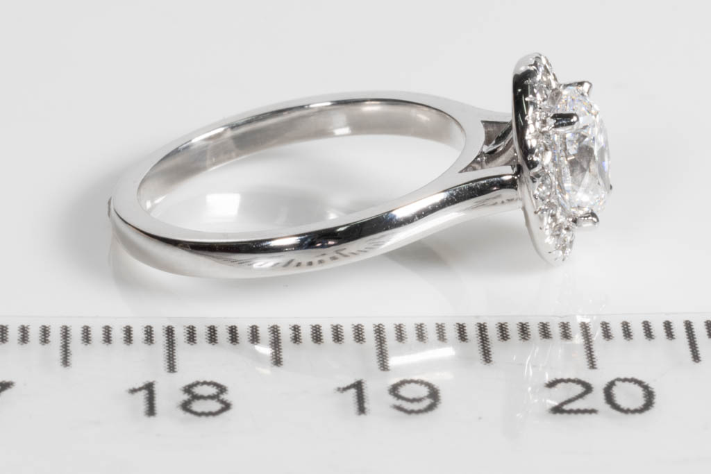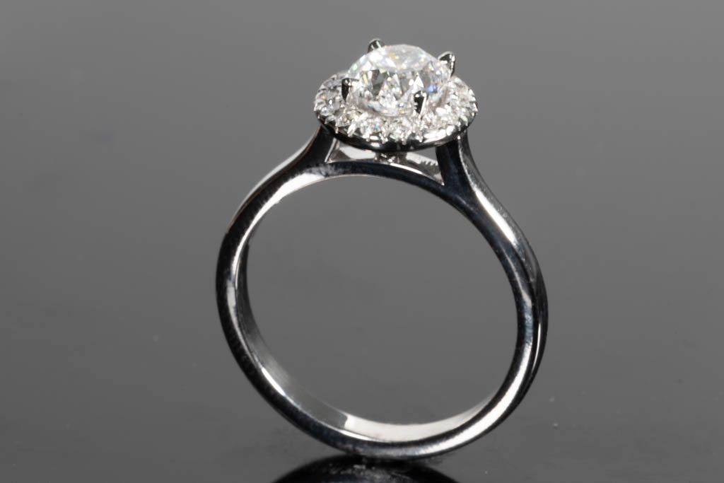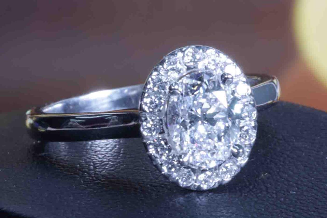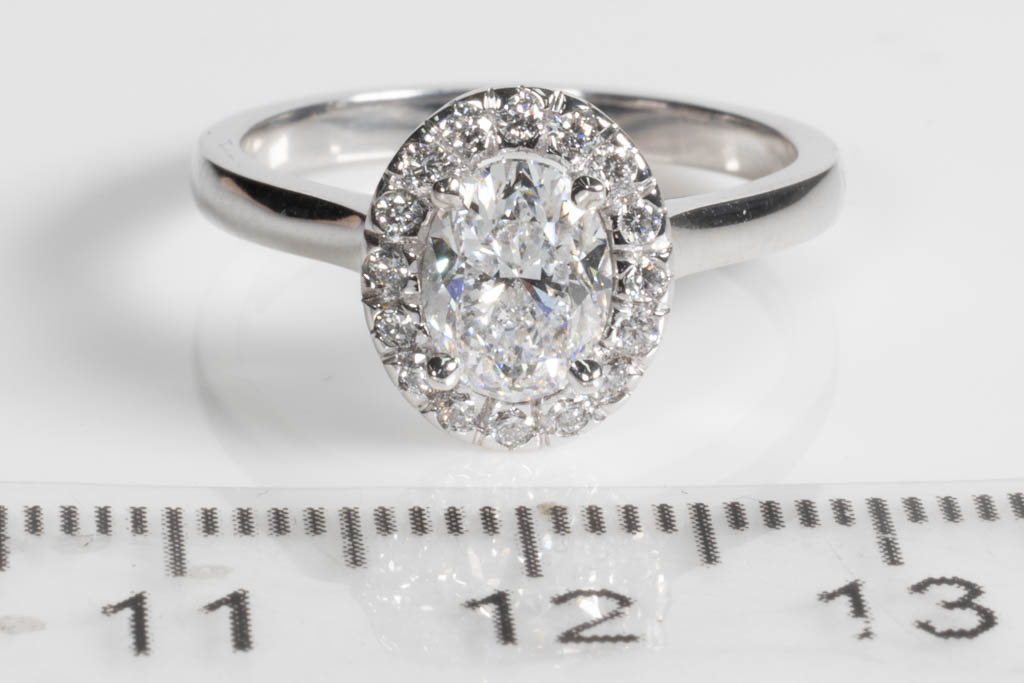 Diamond halo ring with a centre oval shape Diamond of 1.00ct (With GIA report graded as D SI1 #2225358715) and surrounding diamonds totalling 0.17cts. 18ct white gold. Ring size L. Weight 4.4g (New)
