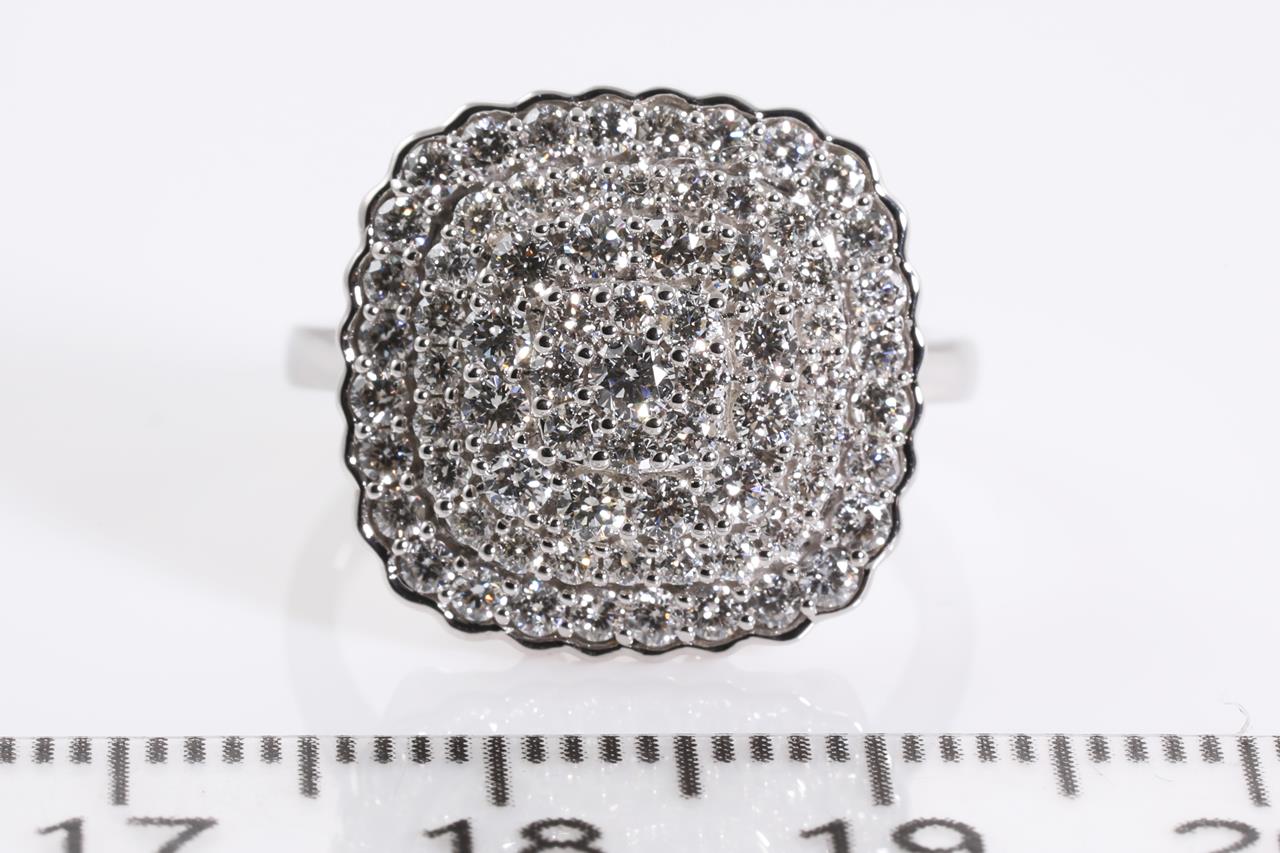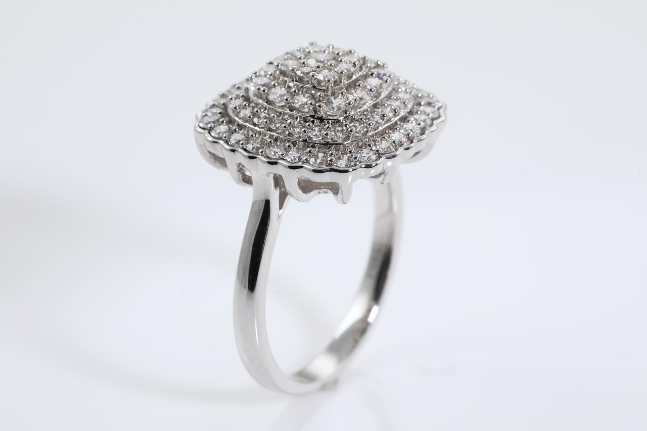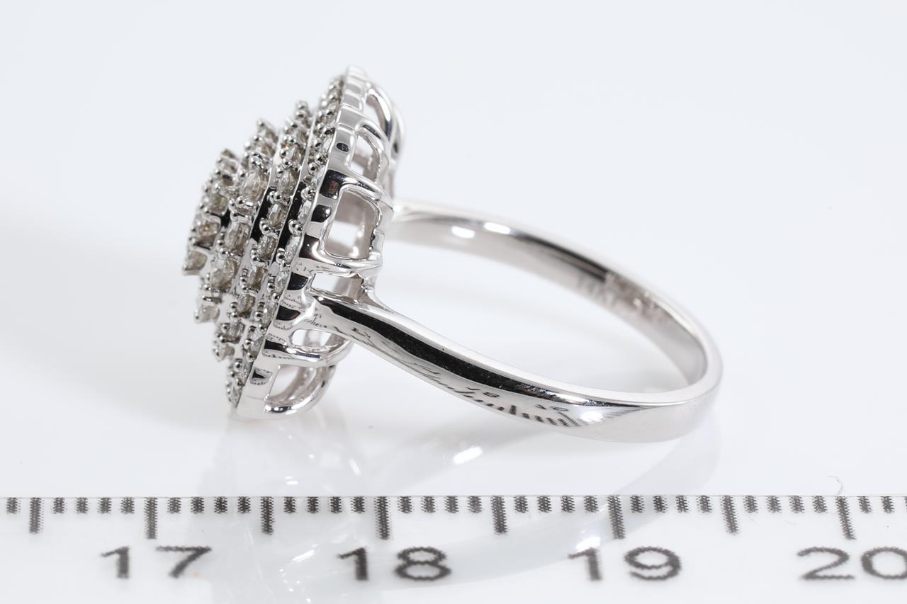 Diamond dress ring with 73 round Diamonds totalling 1.00cts (Estimated grading: H SI). 14ct white gold. Ring size L. Weight: 4.6g (New)