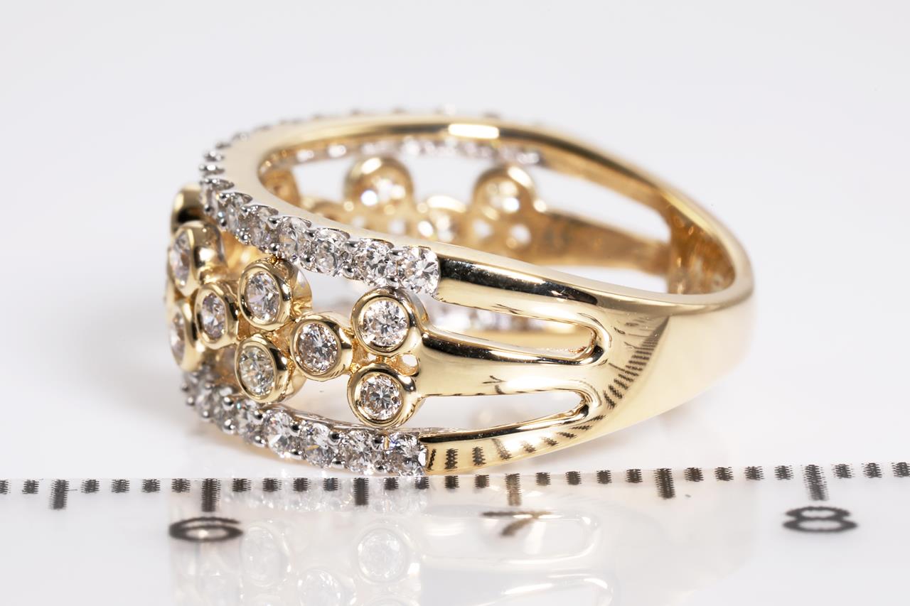 Diamond dress ring with 58 round Diamonds totalling 1.00cts (Estimated grading: H SI). 14ct yellow and white gold. Ring size L - cannot be resized up, down with ring clip. Weight: 4.0g (New)