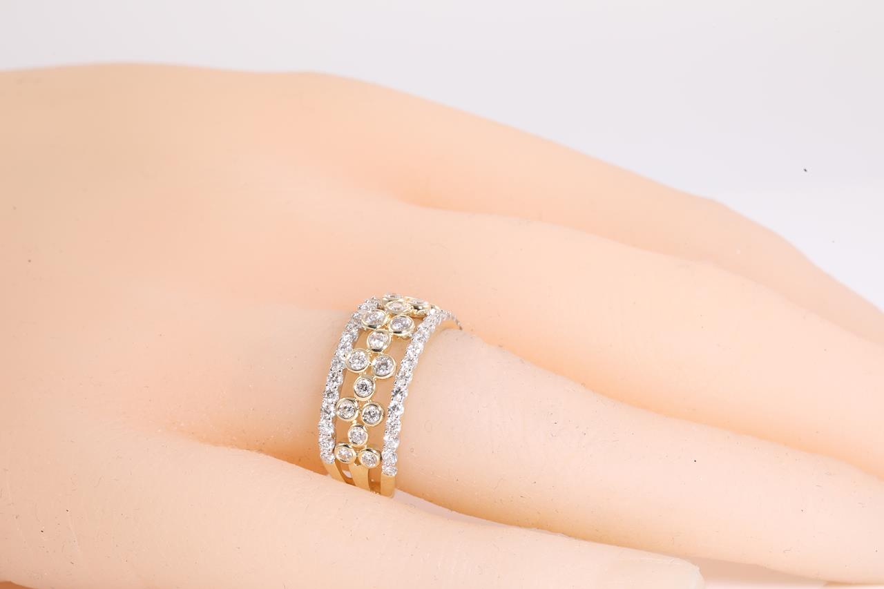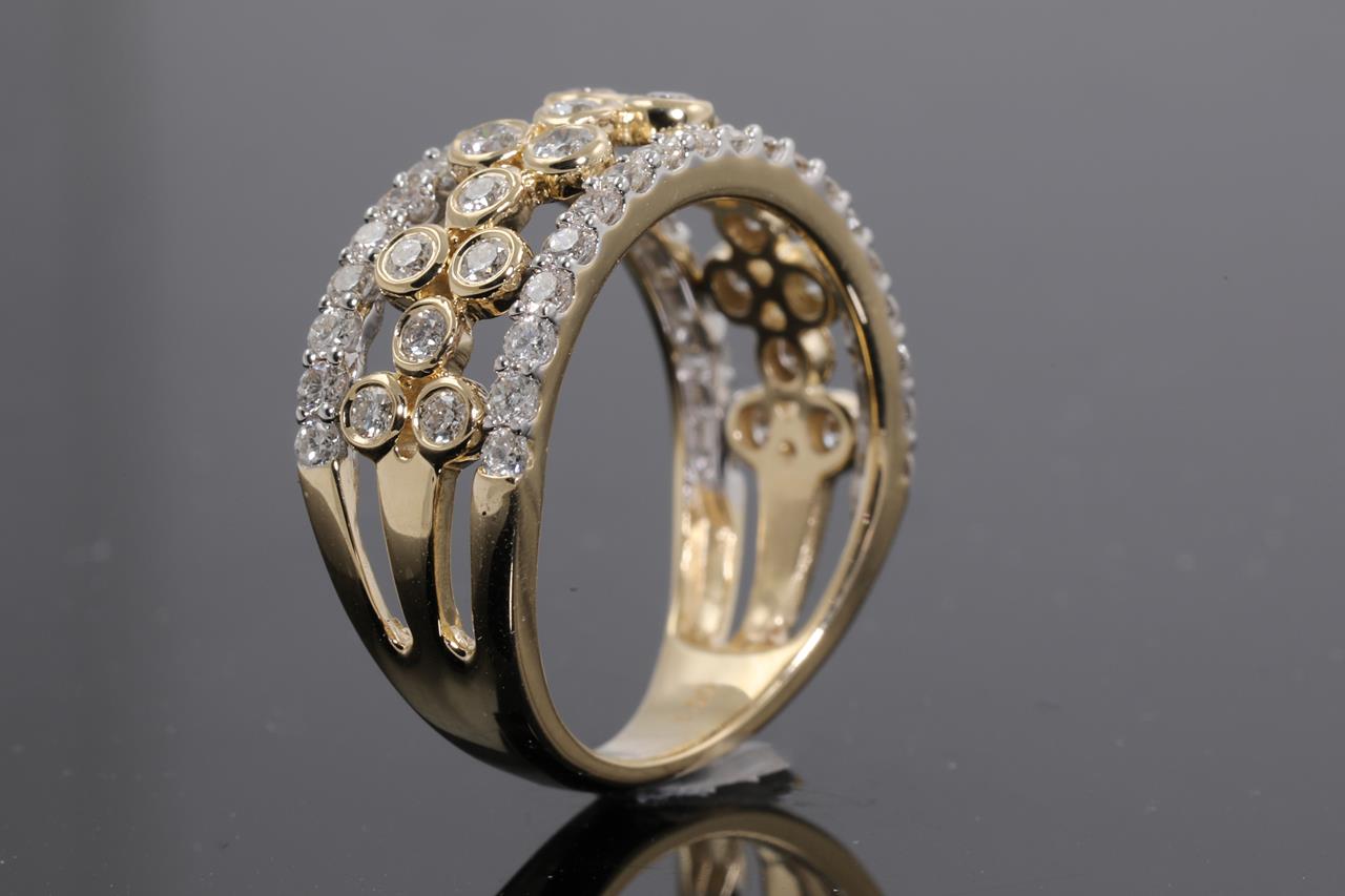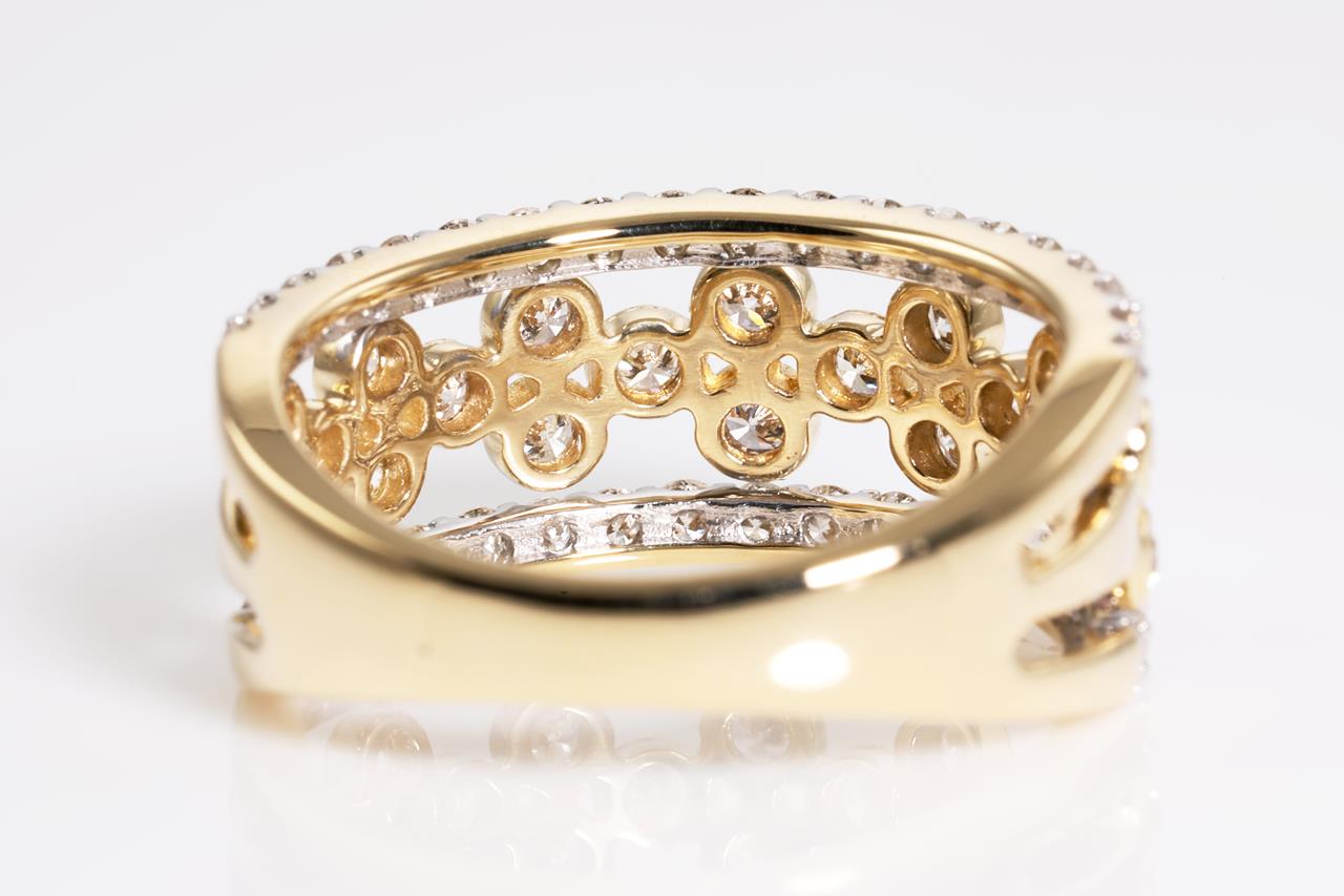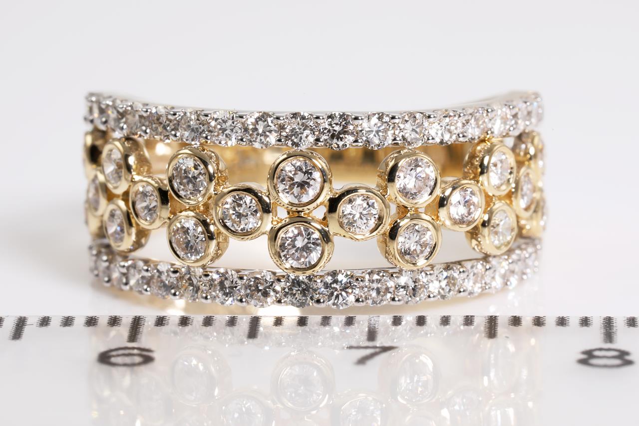 Diamond dress ring with 58 round Diamonds totalling 1.00cts (Estimated grading: H SI). 14ct yellow and white gold. Ring size L - cannot be resized up, down with ring clip. Weight: 4.0g (New)