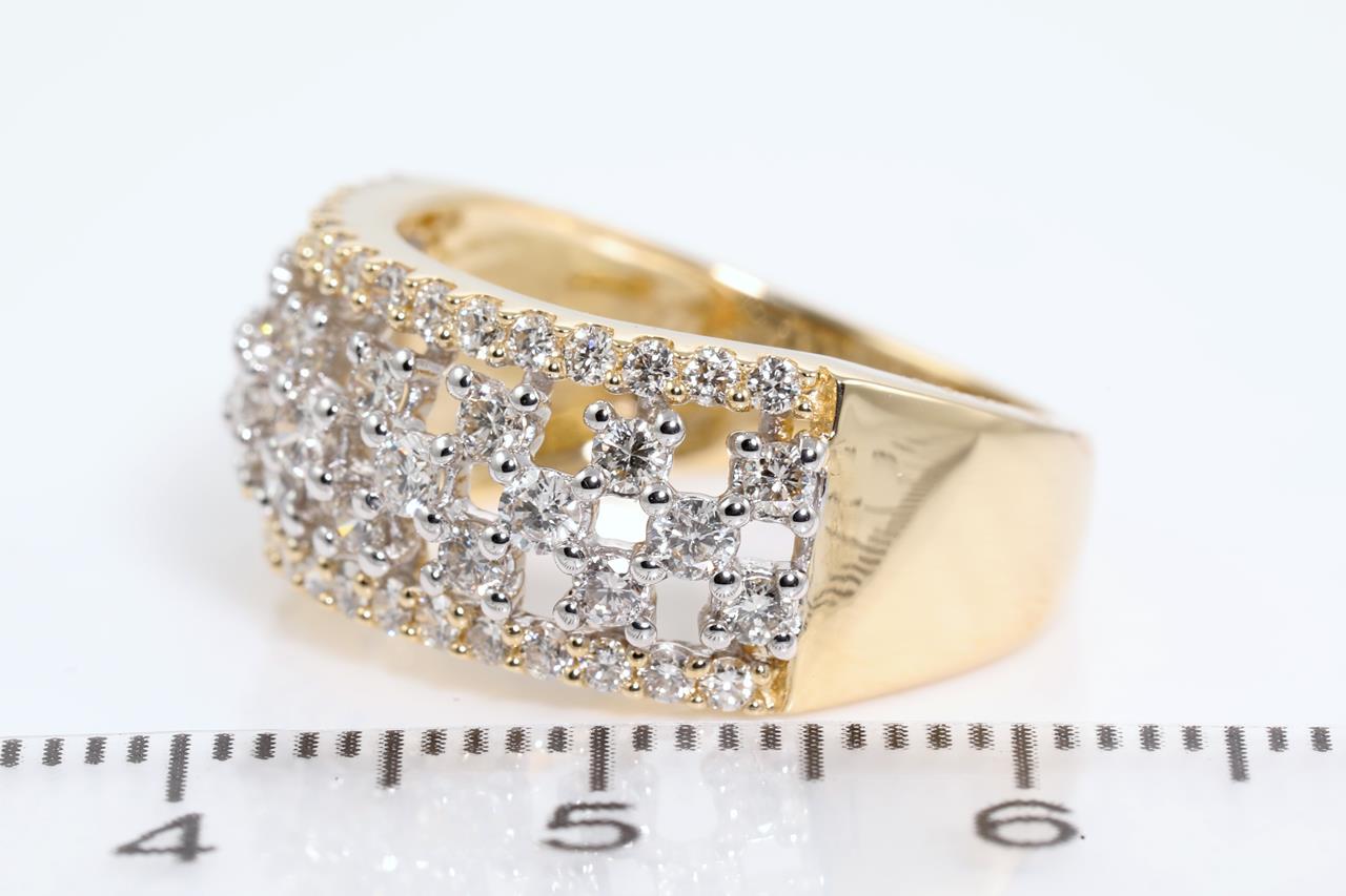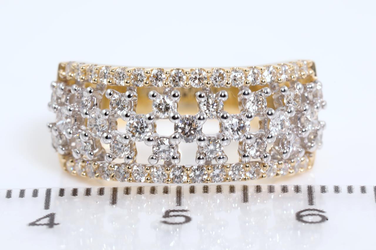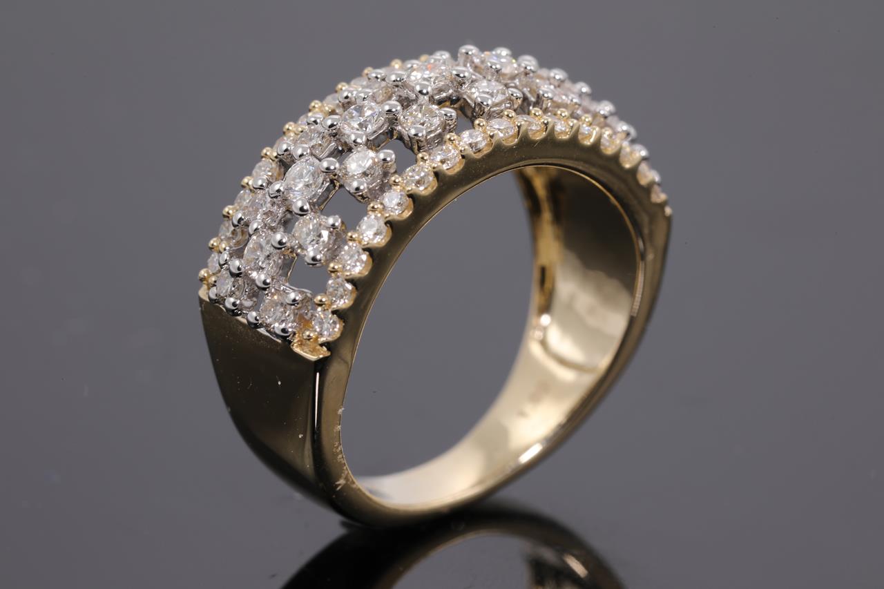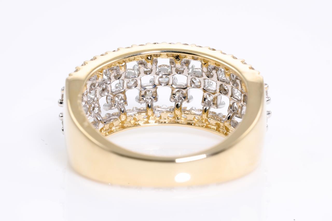 Diamond dress ring with round Diamonds totalling 1.00cts (Estimated grading: H SI). 14ct yellow and white gold. Ring size L - cannot be resized up, down with ring clip. Weight: 4.9g (New)