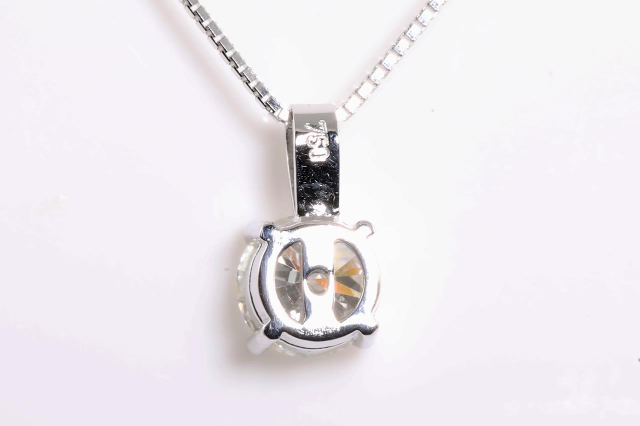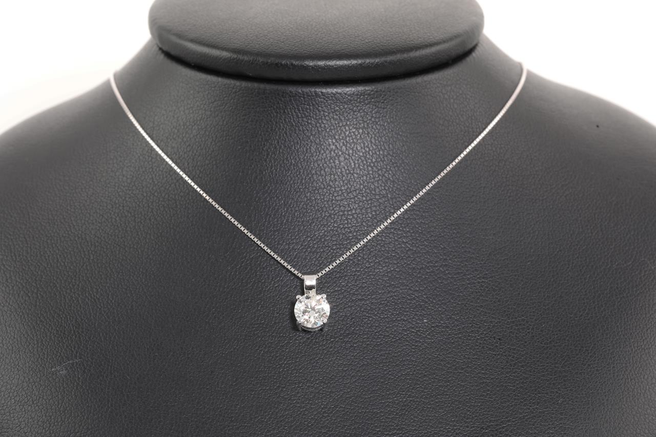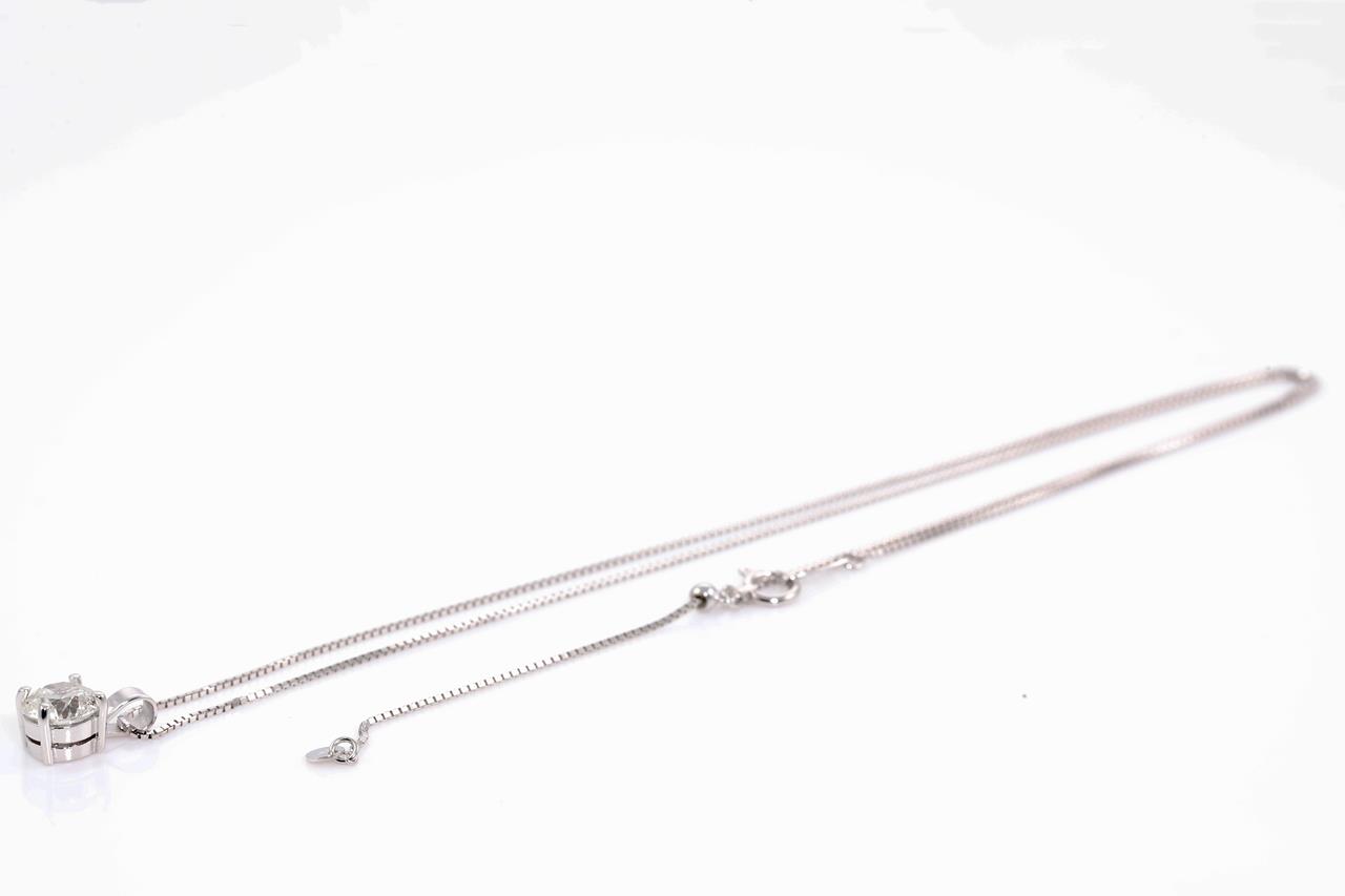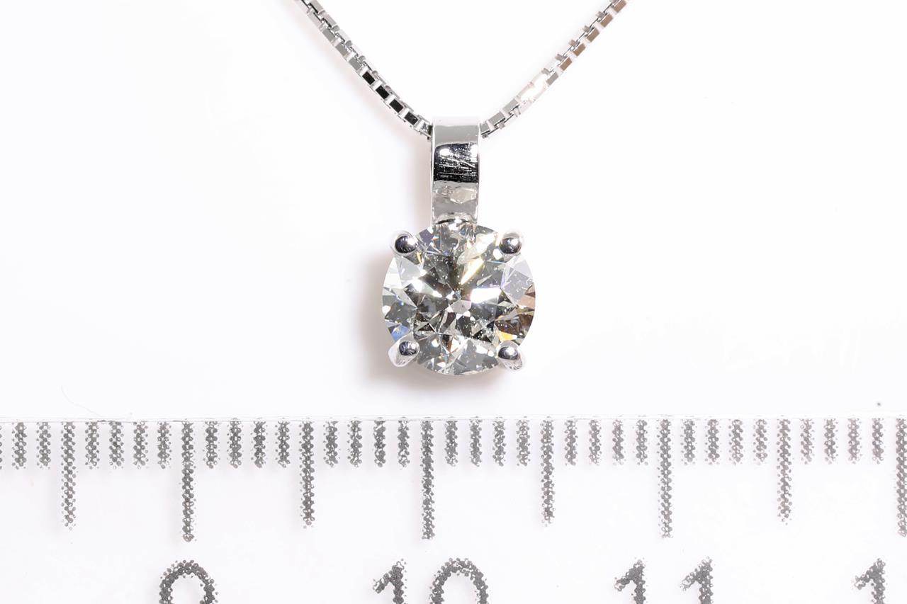 Diamond solitaire pendant with a round Brilliant Cut Diamond of 1.00ct (Estimated grading: H P1). 18ct white gold with adjustable 44cm chain. Weight: 2.8g. With Certificate #414438. (New)