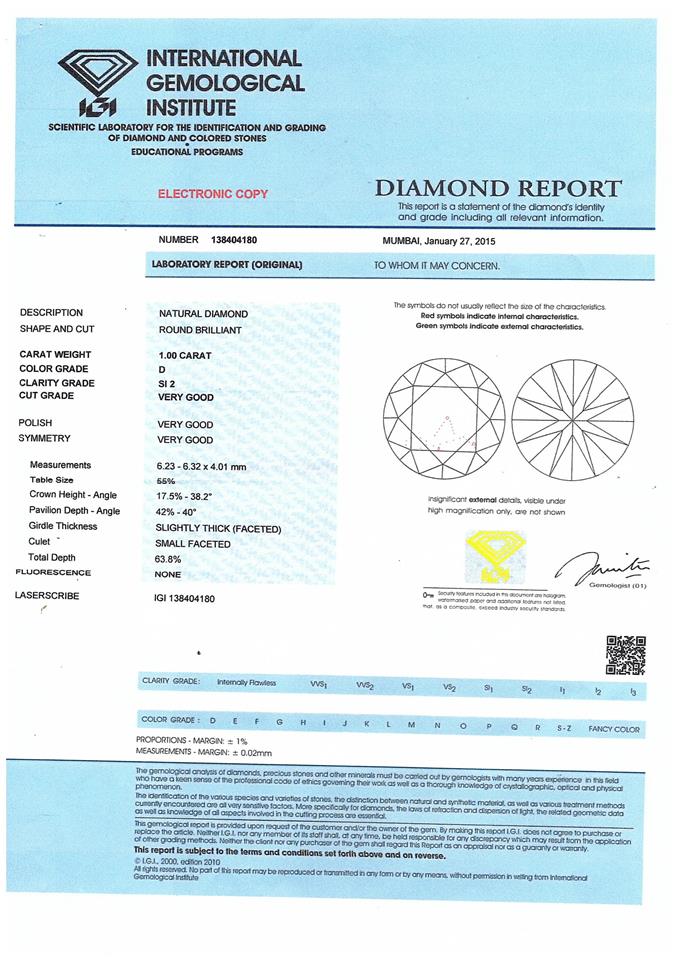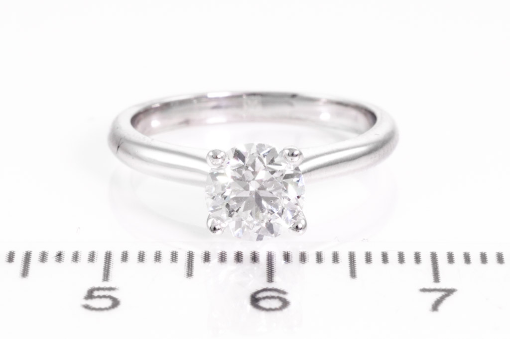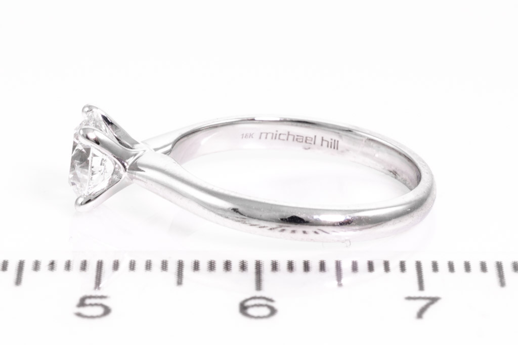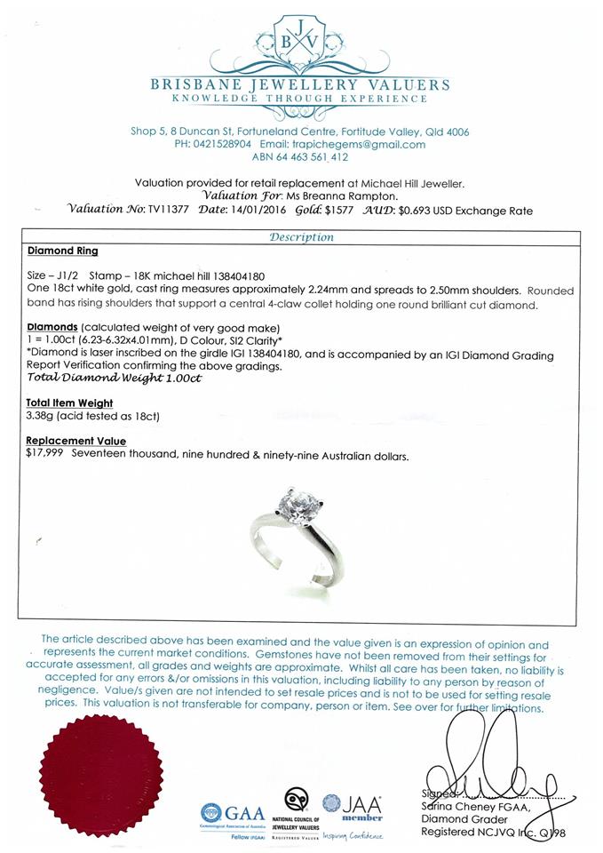 Michael Hill Diamond Solitaire ring with round brilliant cut Diamond of 1.00ct (with copy of IGI graded as D SI2 #138404180). 18ct white gold. Ring size J. With Valuation Certificate dated 14/01/2016. Weight: 3.2g (Pre-owned)