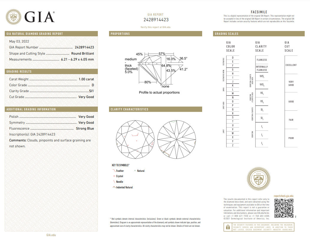 Diamond solitaire ring with round brilliant cut Diamond of 1.00ct (with GIA report graded as D SI1 #2428914423). 18ct white gold. Ring size: M. Weight: 4.5g. (New)