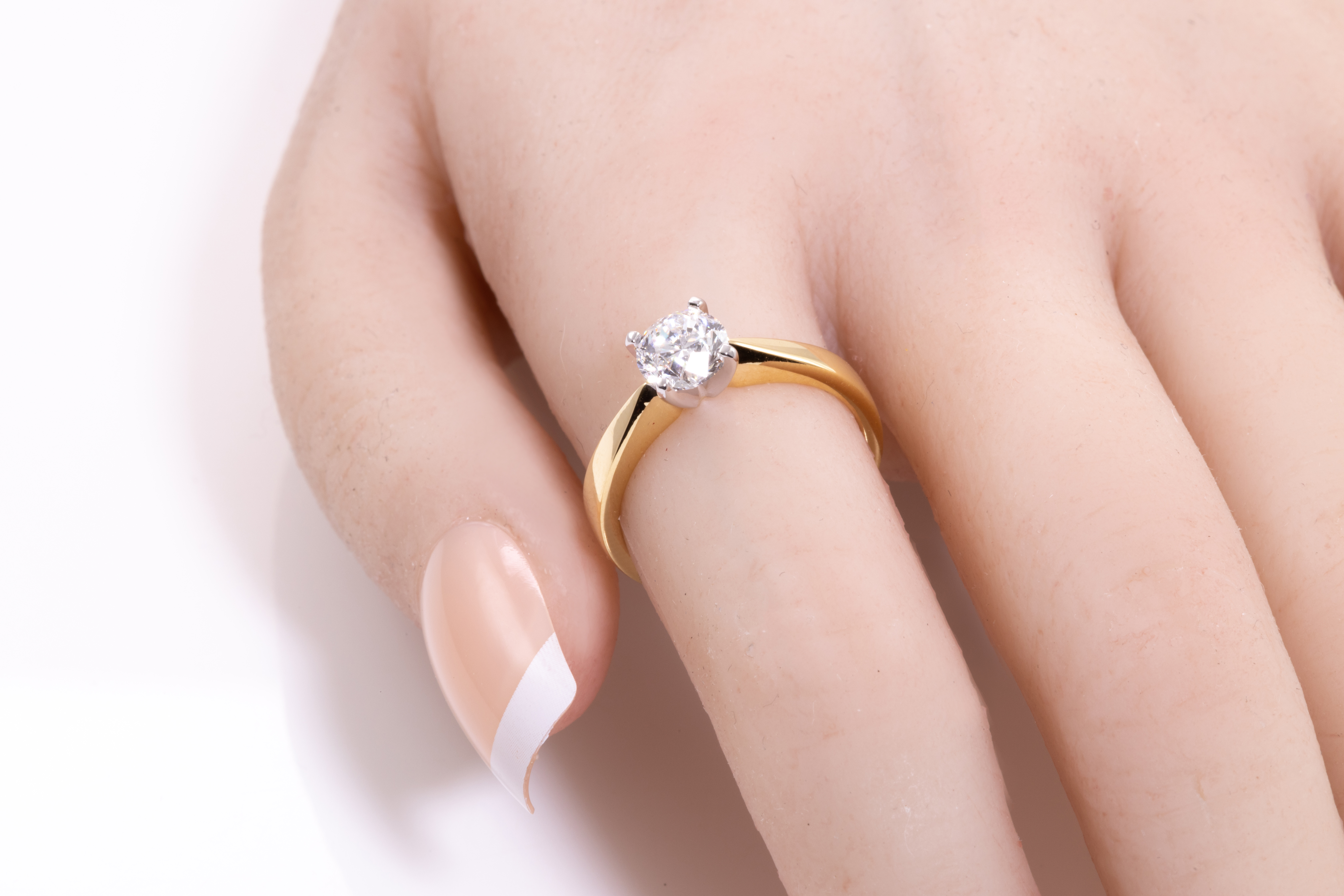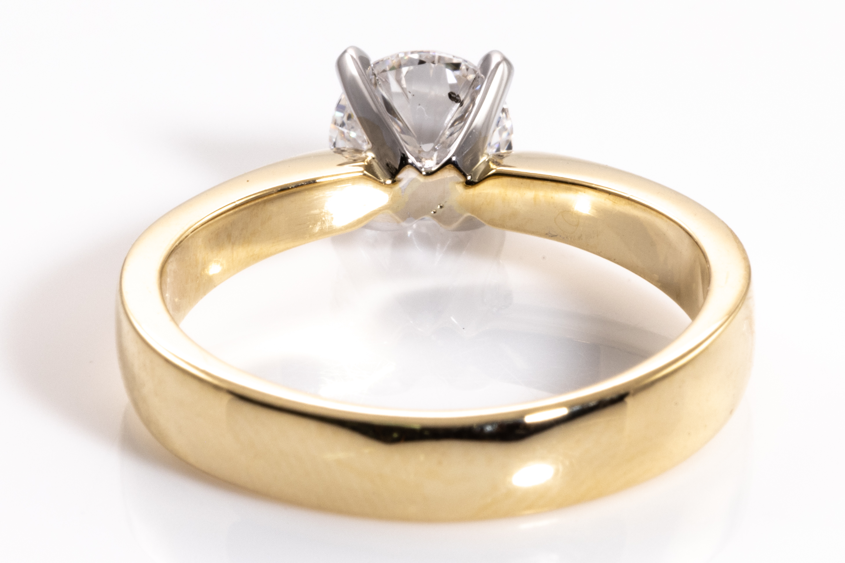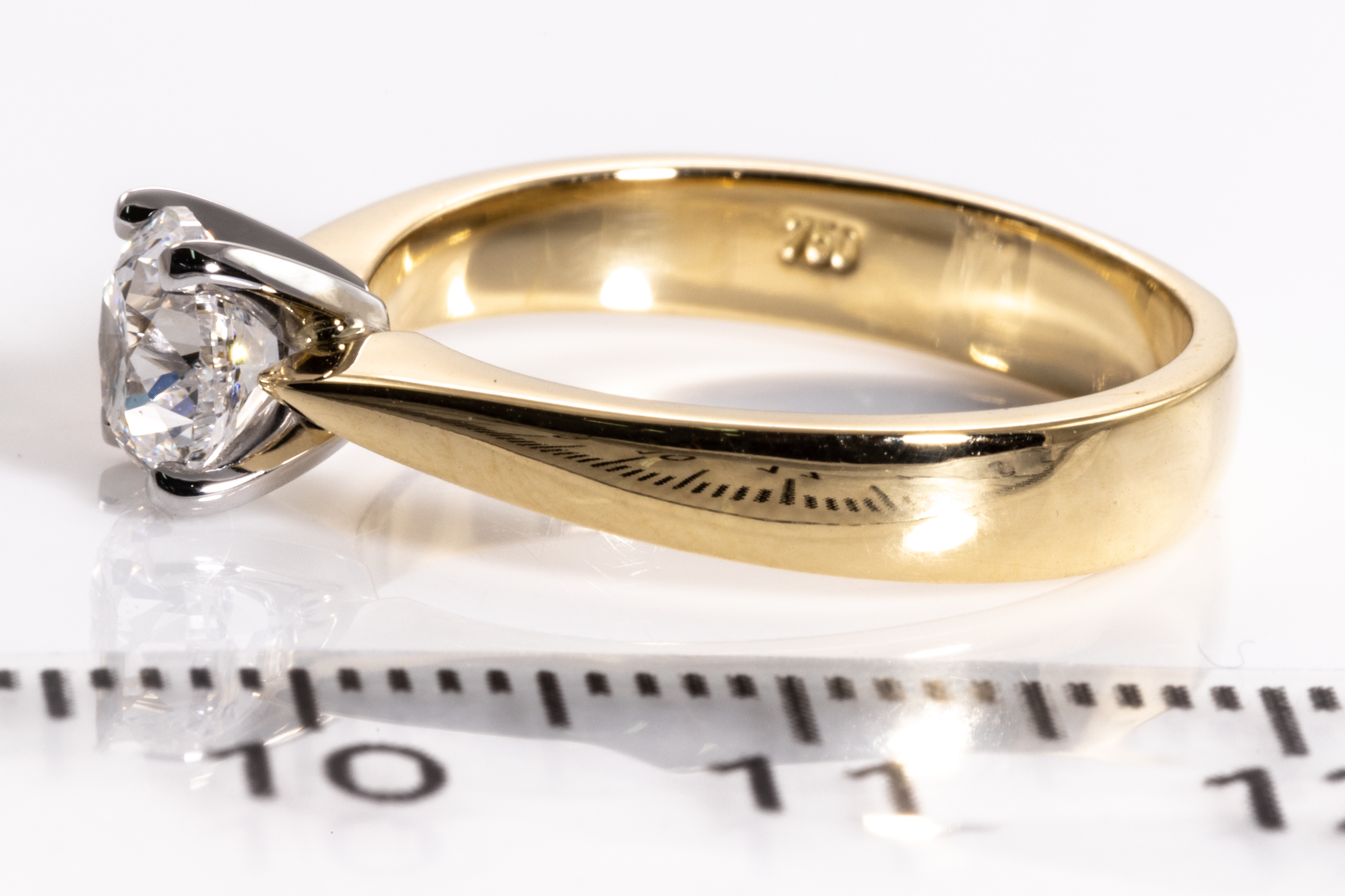 Diamond solitaire ring with round brilliant cut Diamond of 1.00ct (with GIA report graded as D SI1 #7432597615). 18ct yellow and white gold. Ring size: M1/2. Weight: 5.0g. (New)
