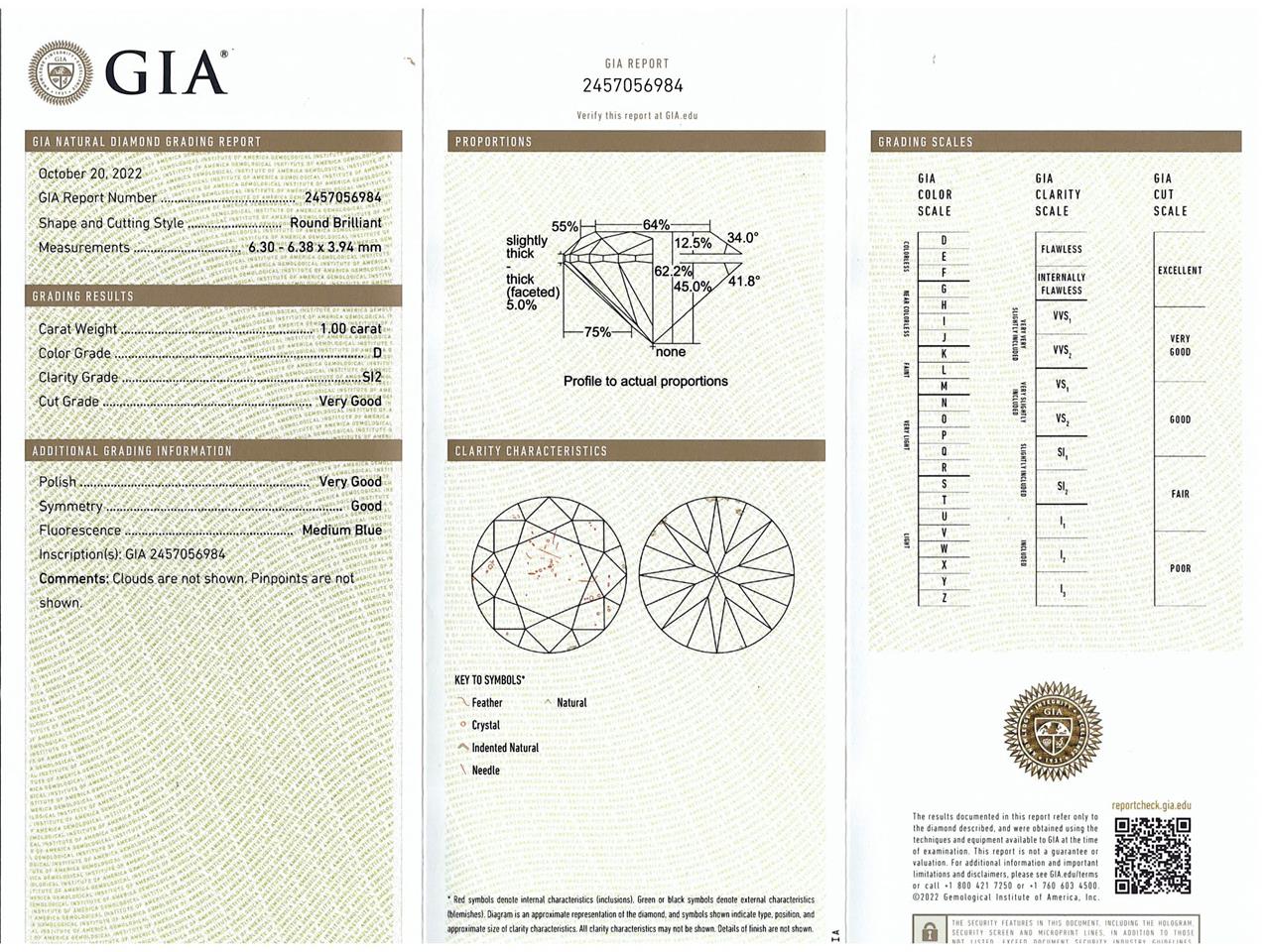 Diamond solitaire ring with round brilliant cut Diamond of 1.00ct (with GIA report graded as D SI2 #2457056984). 18ct white gold. Ring size: N. Weight: 4.6g. (New)