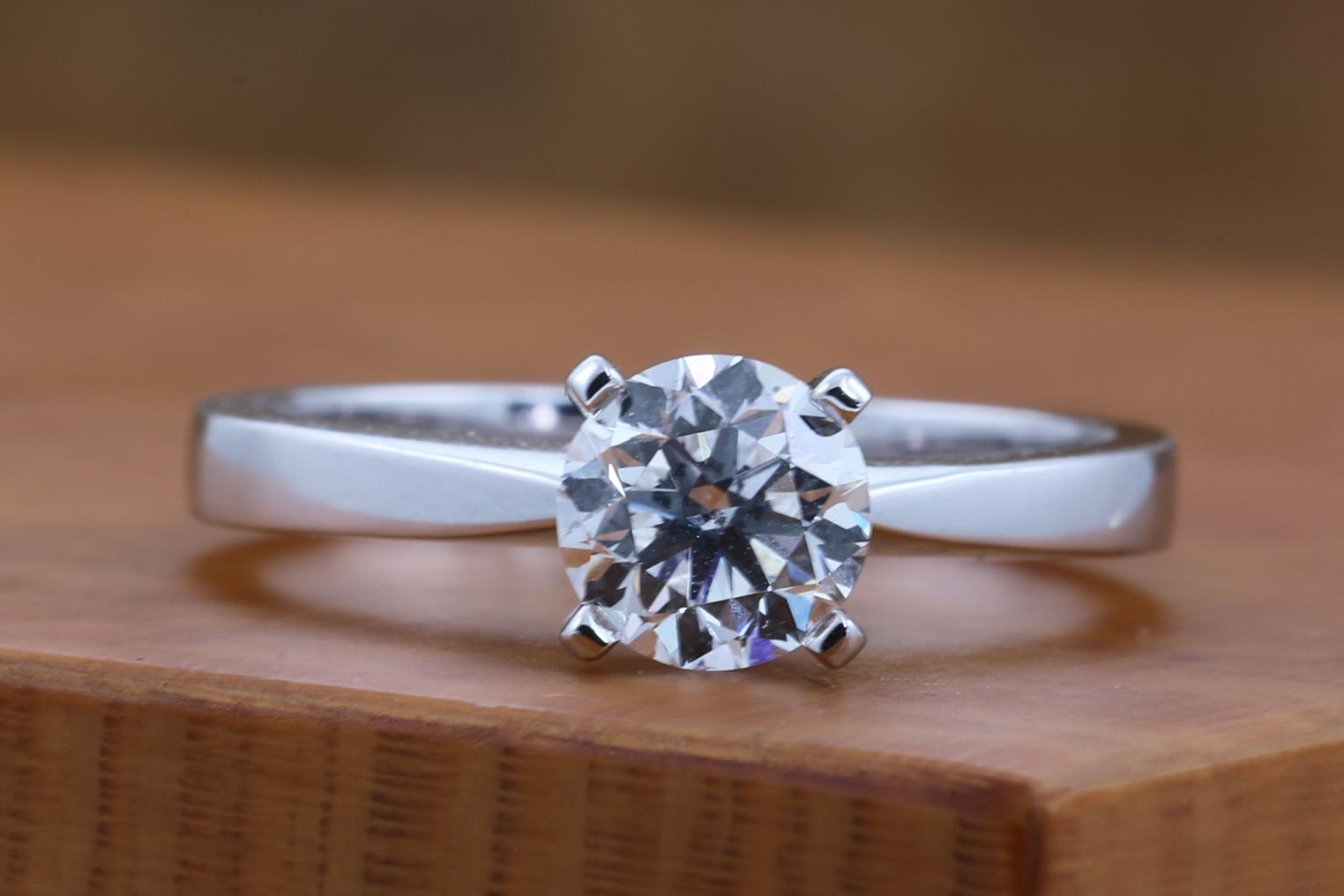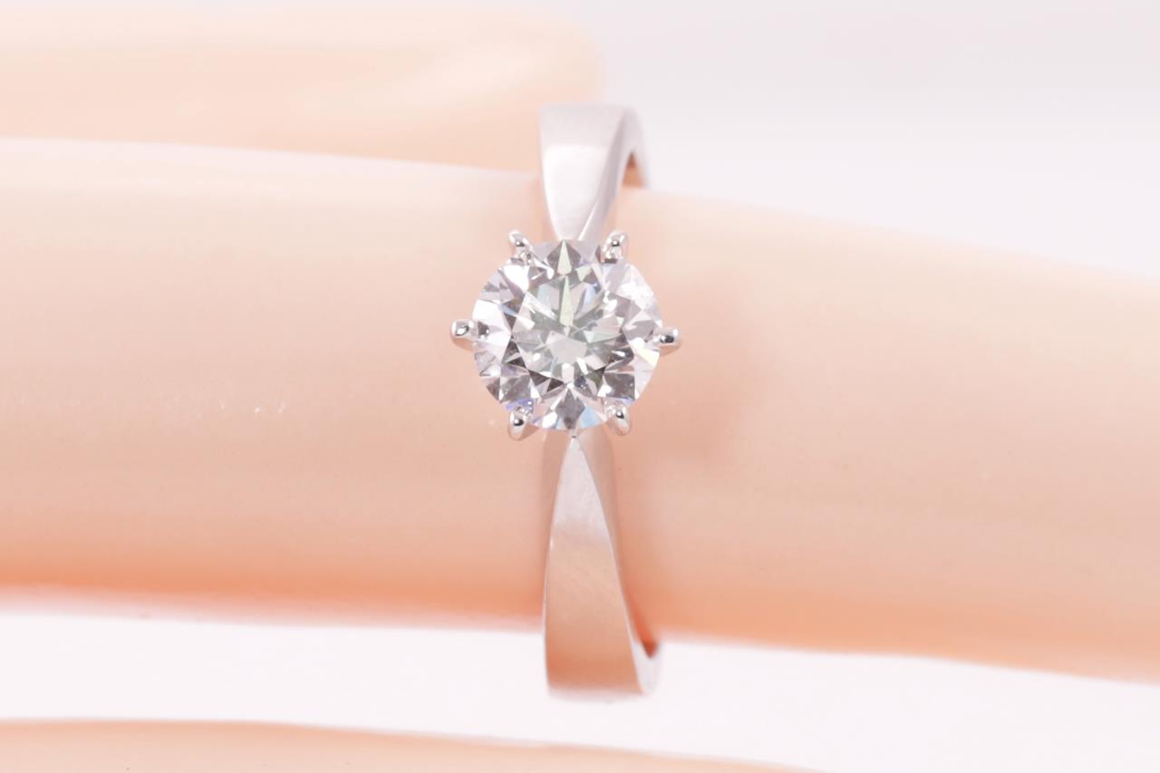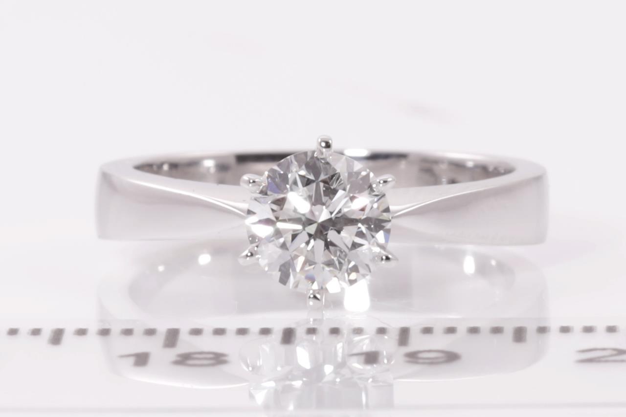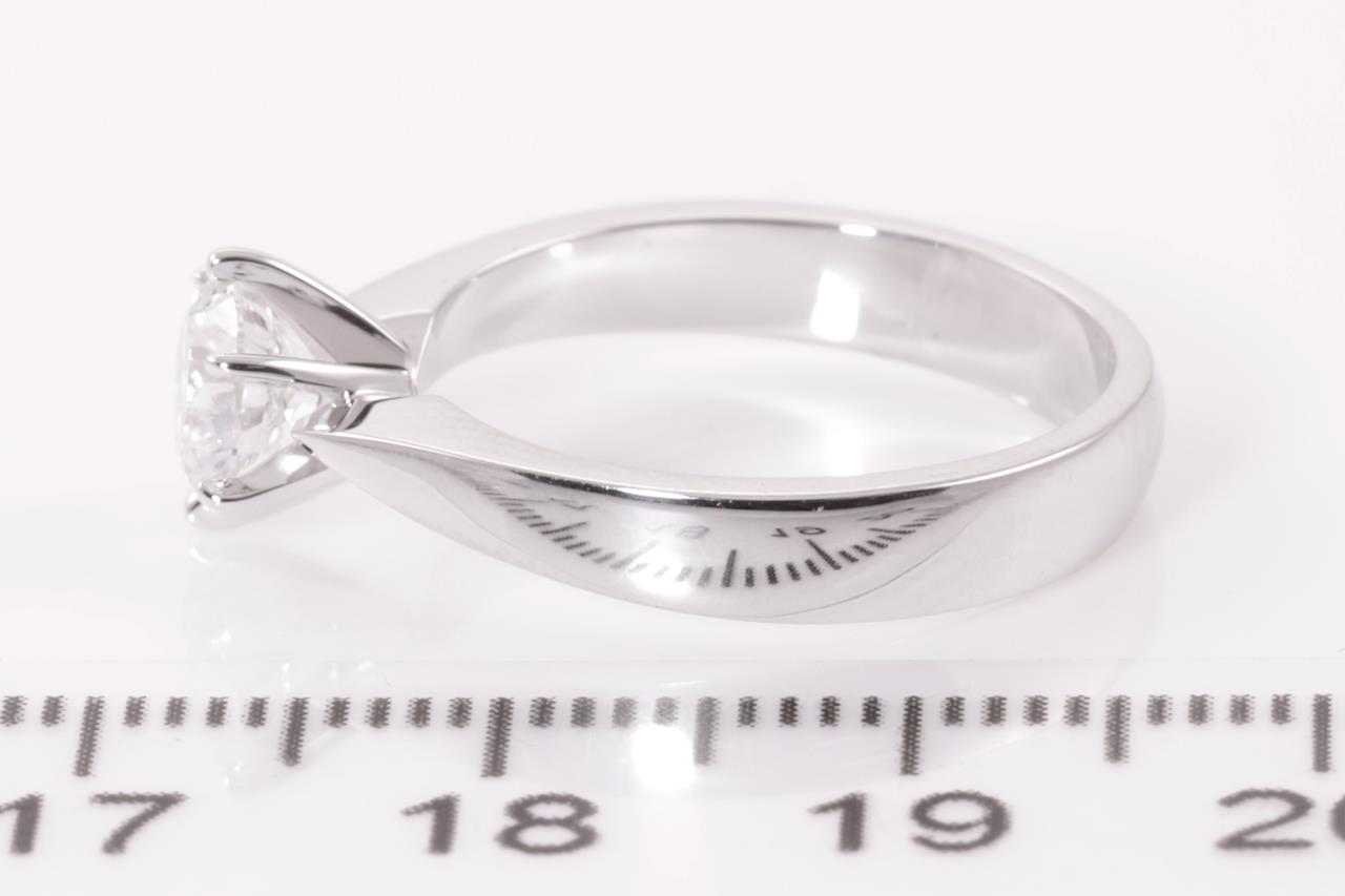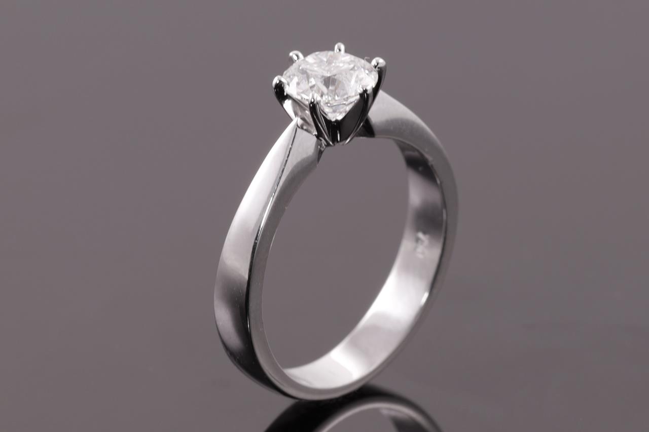 Diamond solitaire ring with a round brilliant cut Diamond of 1.00ct (with GIA report graded as D VS2 #5416030860). 18ct white gold. Ring size L. Weight: 5.3g. (New)