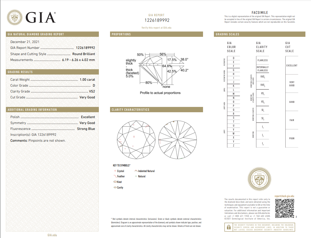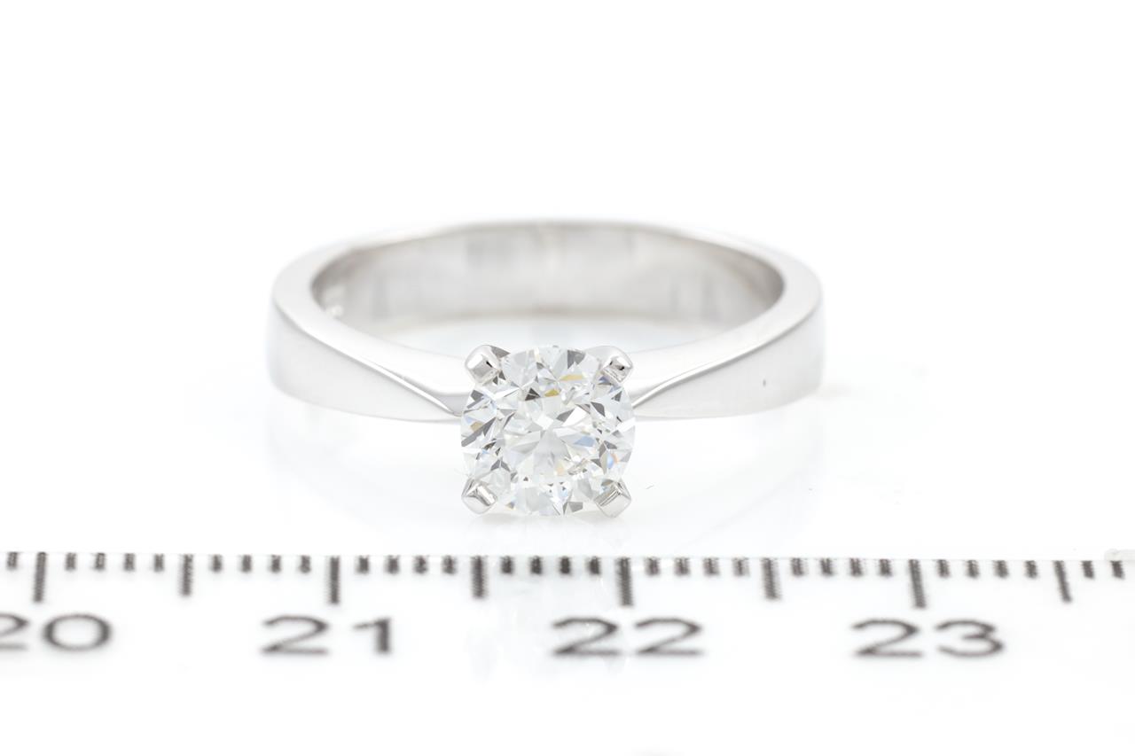Diamond solitaire ring with round brilliant cut Diamond of 1.00ct (with GIA report graded as D VS2 #1226189992). 18ct white gold. Ring size M. Weight 5.3g (New)