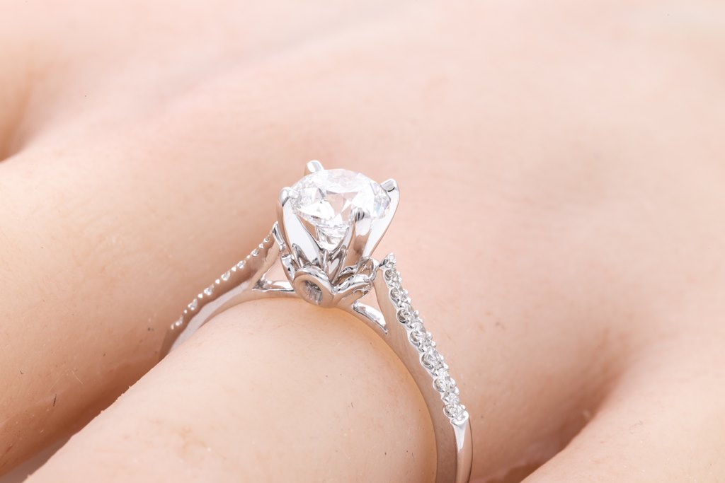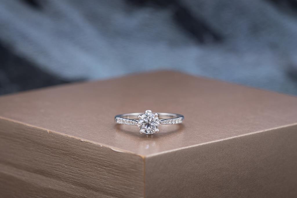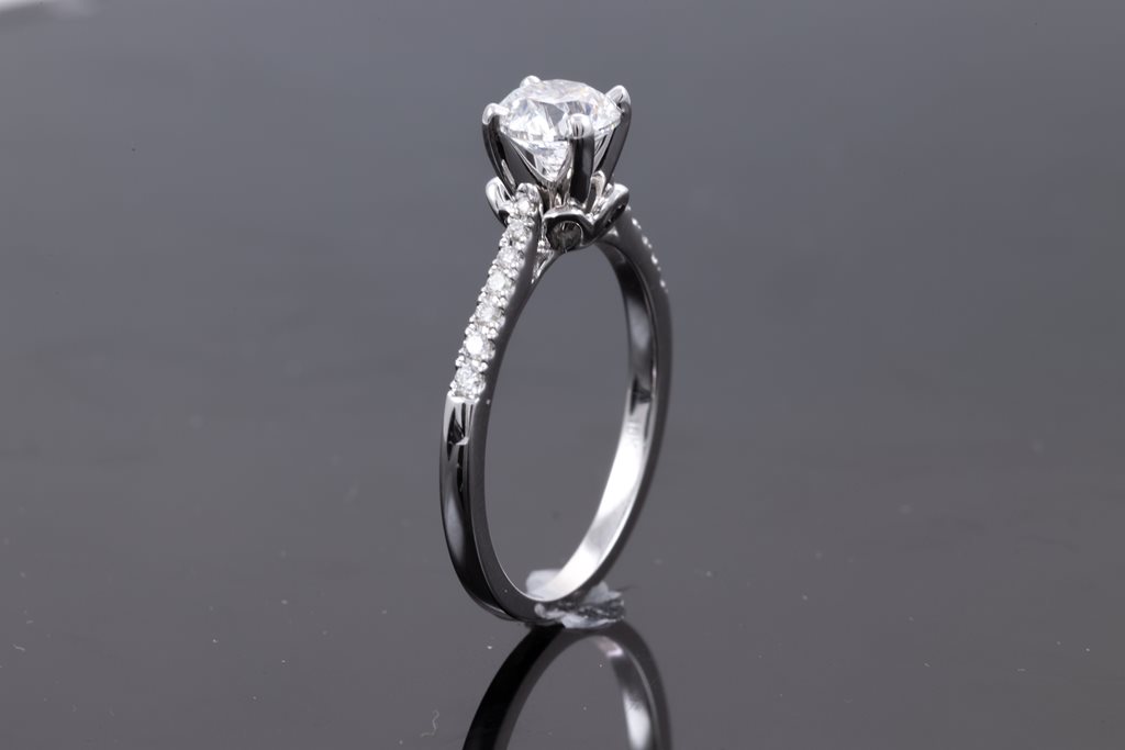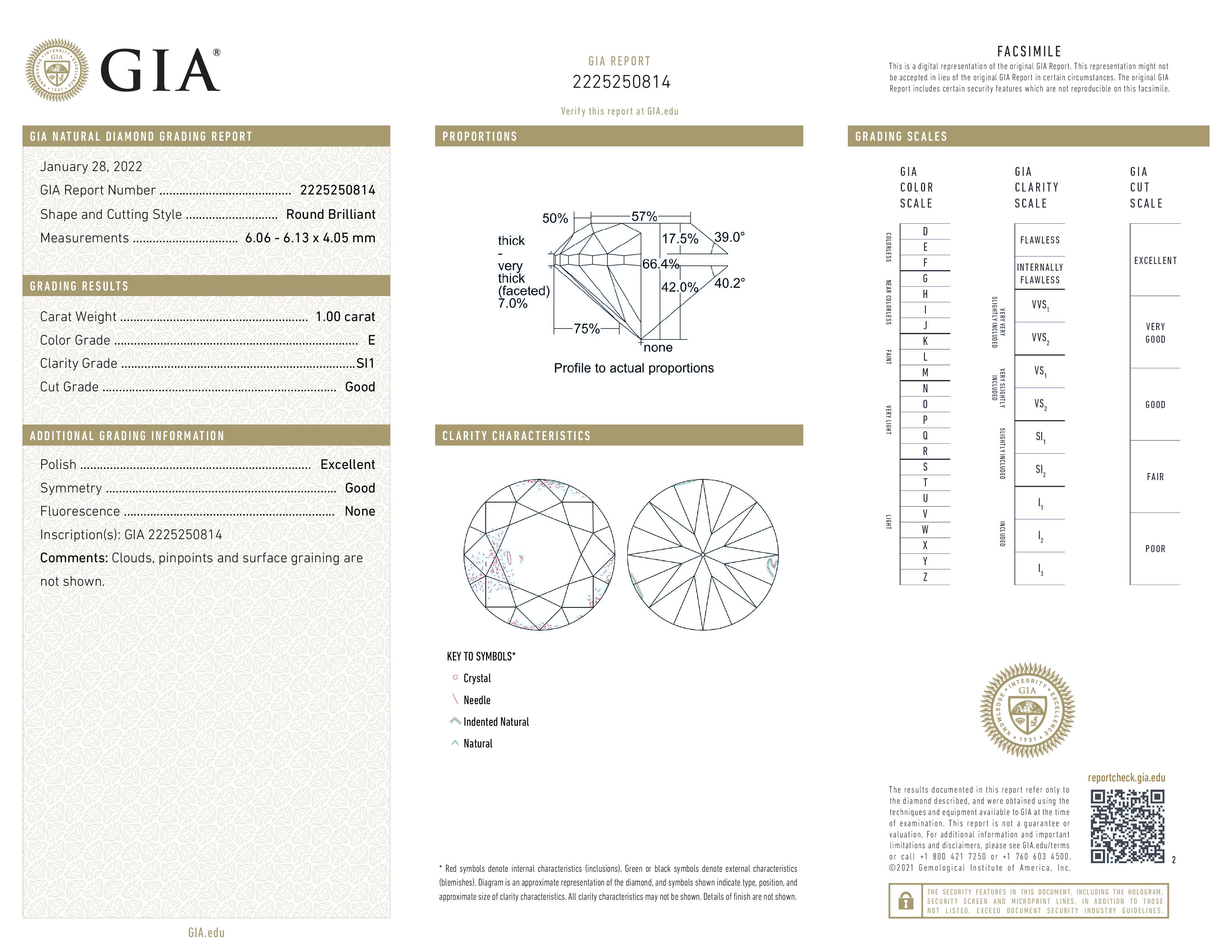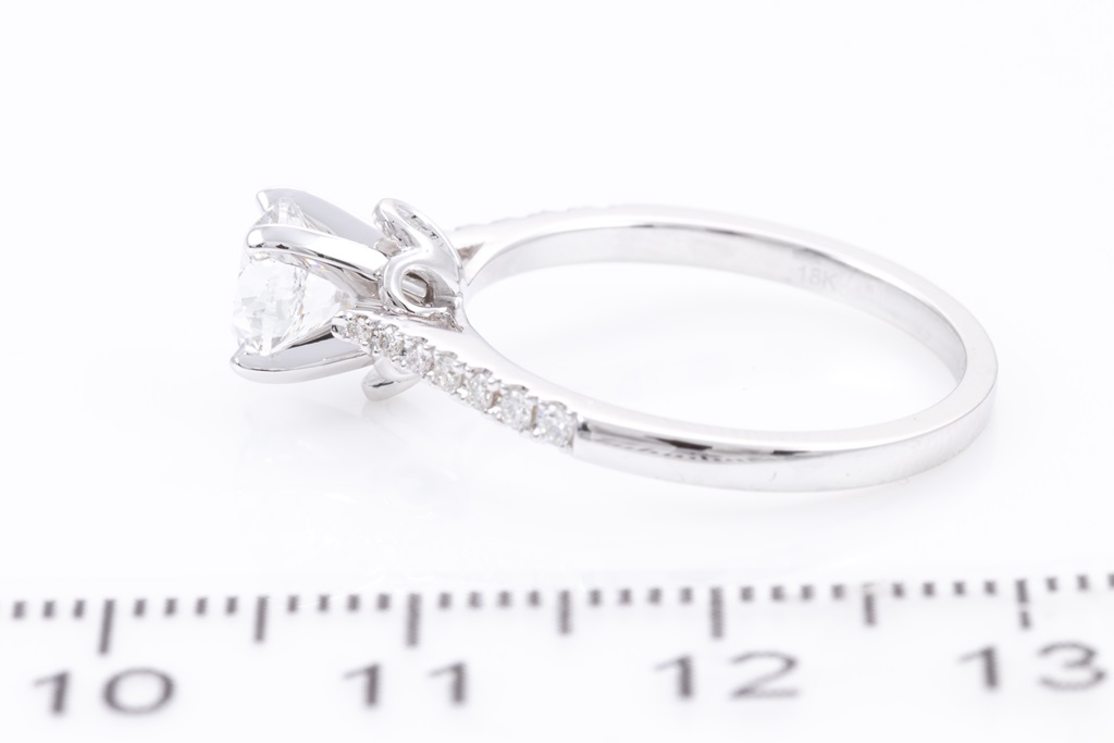 Diamond solitaire ring with round brilliant cut Diamond of 1.00ct (with GIA report graded as E SI1 #2225250814) and shoulder Diamonds totalling 0.13cts. 18ct white gold. Ring size N. Weight: 3.3g. (New)
