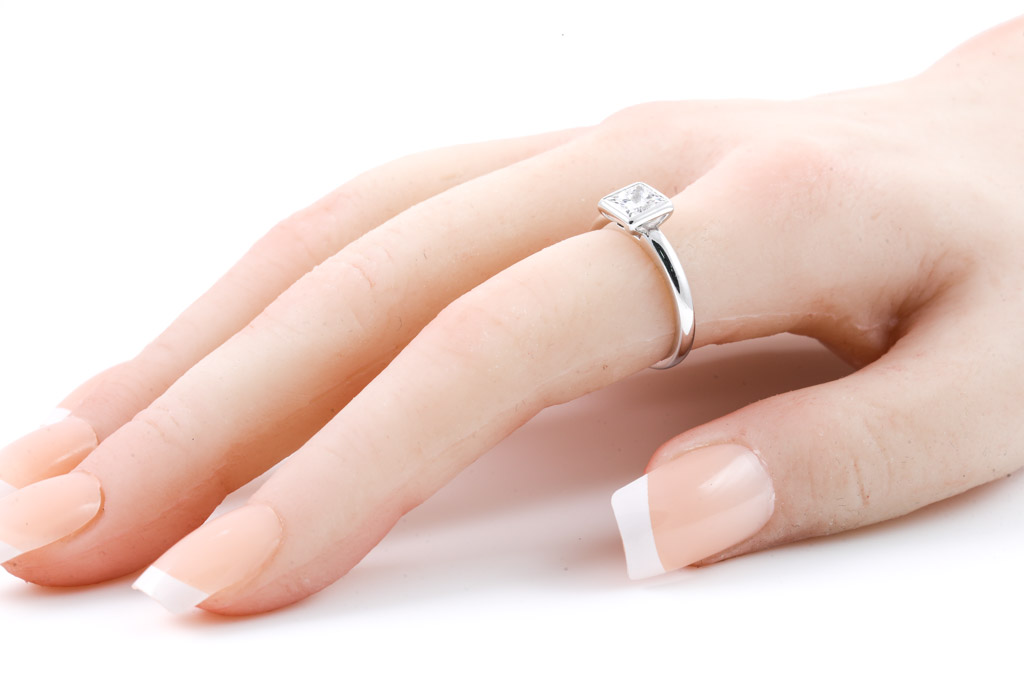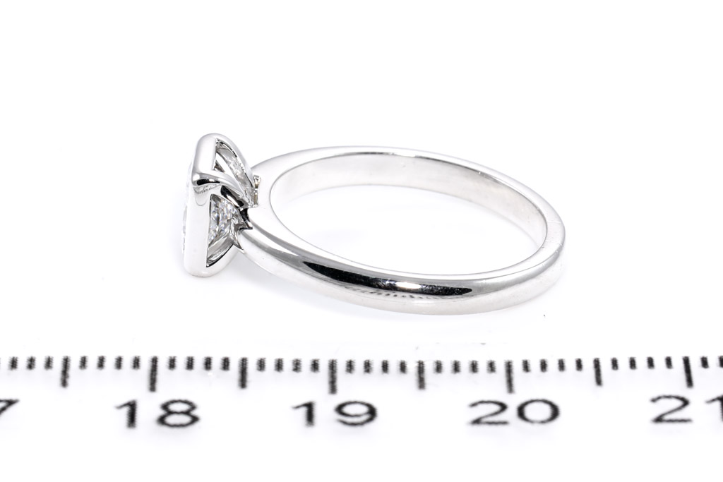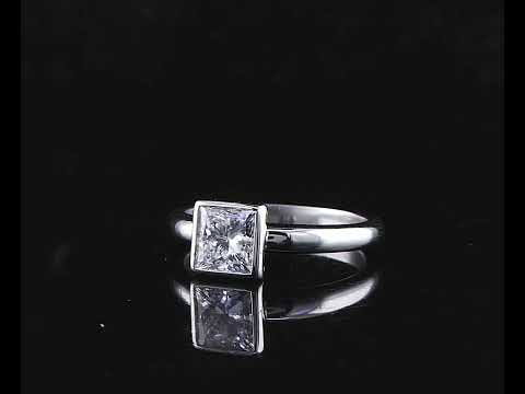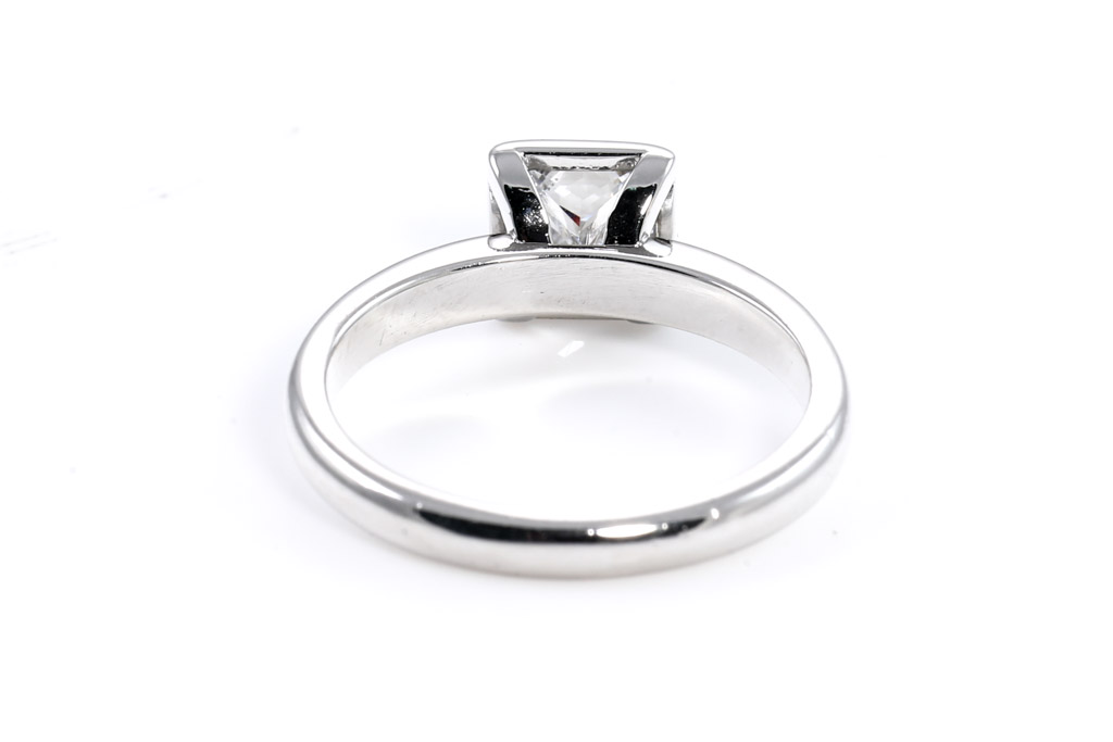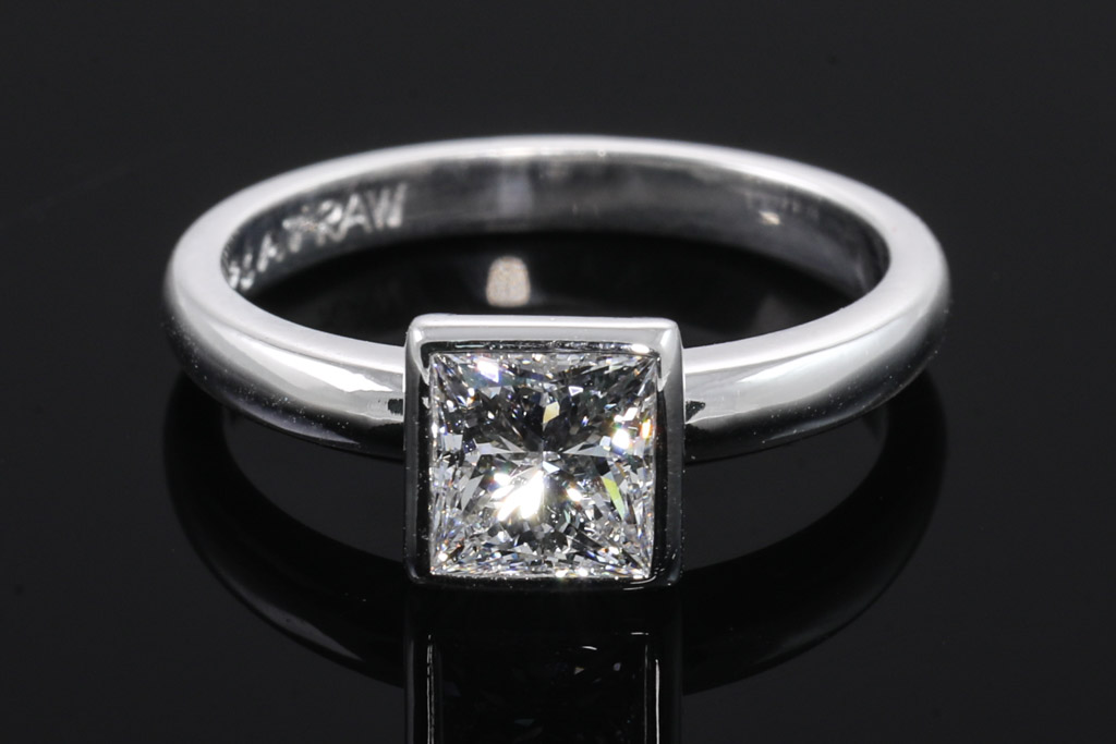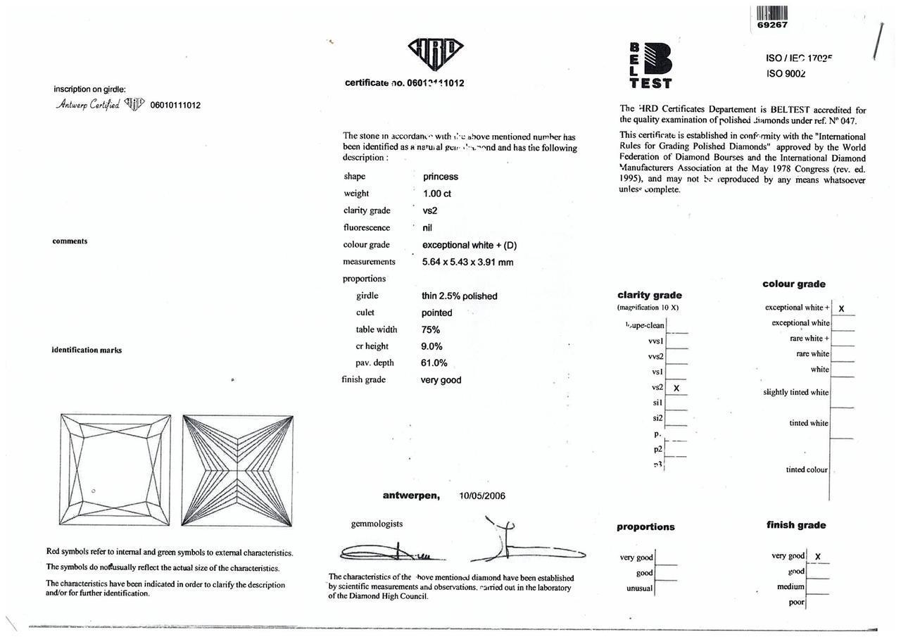 Diamond solitaire ring with princess cut Diamond of 1.00ct (With copy of HRD report graded as D VS2 #06010111012). Platium. Ring size: K - ring resize is not recommended. Weight: 5.3g. (pre-owned)