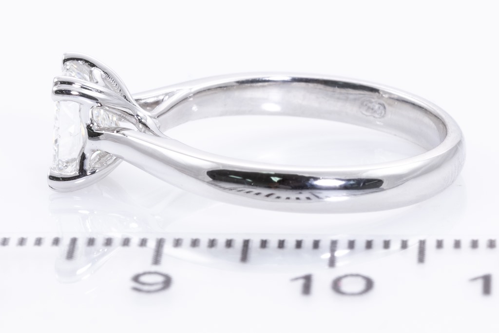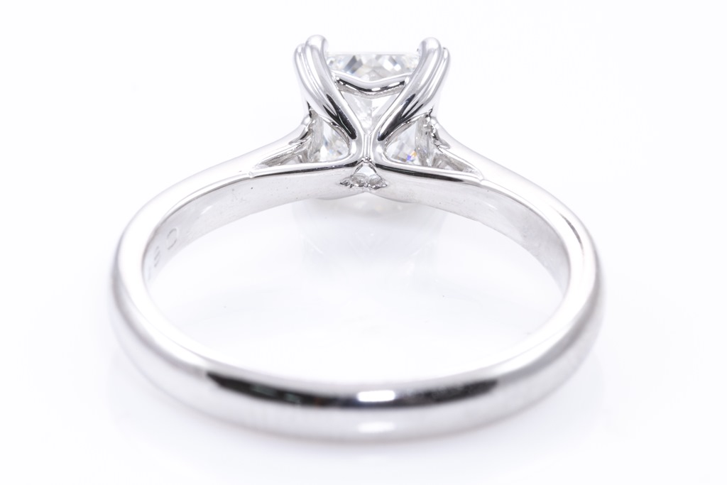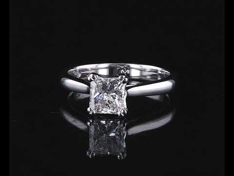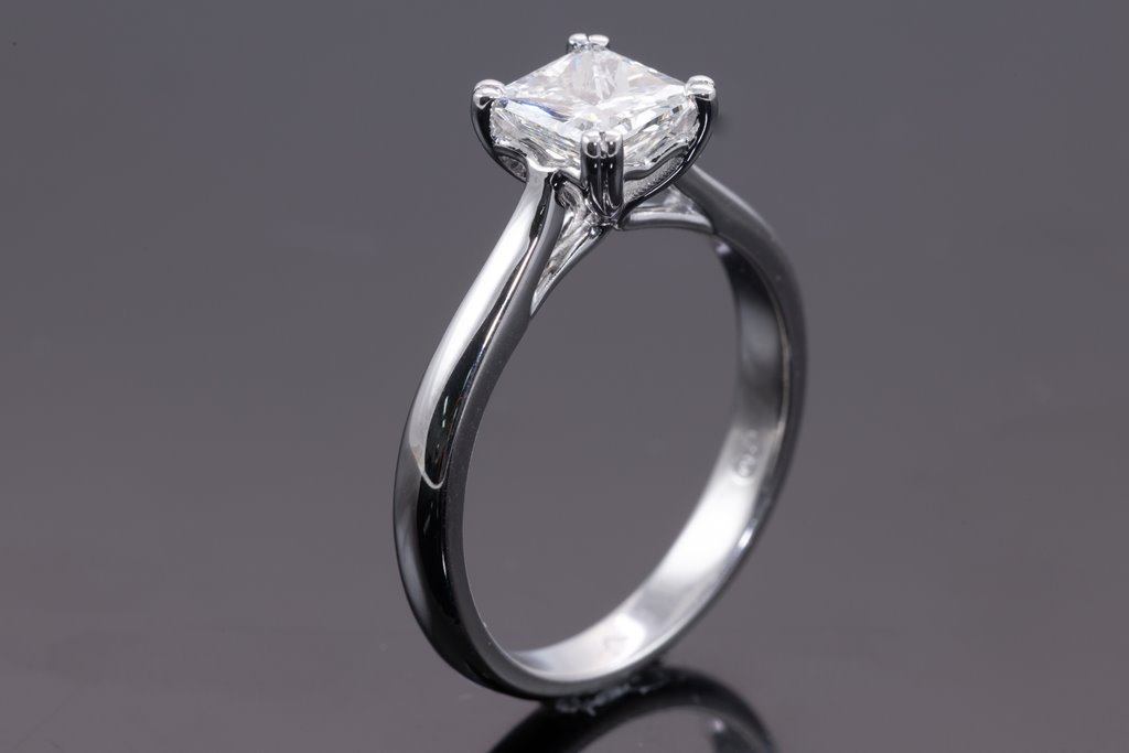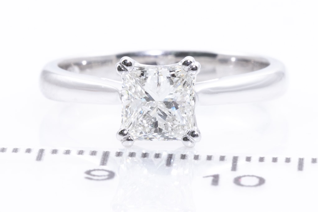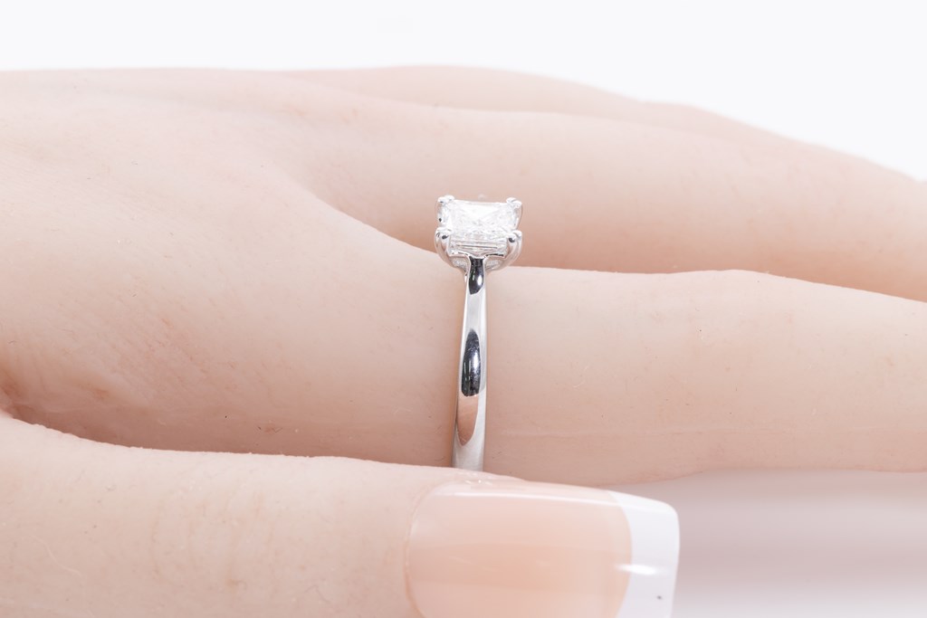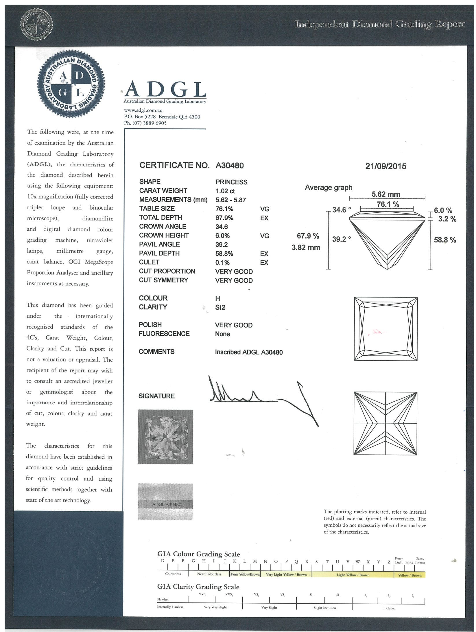 Diamond Solitaire ring with princess cut Diamond of 1.00ct (with ADGL certification #A30480 grading H SI2). 18ct white gold. Ring size M. Weight 4.0g. (As New)