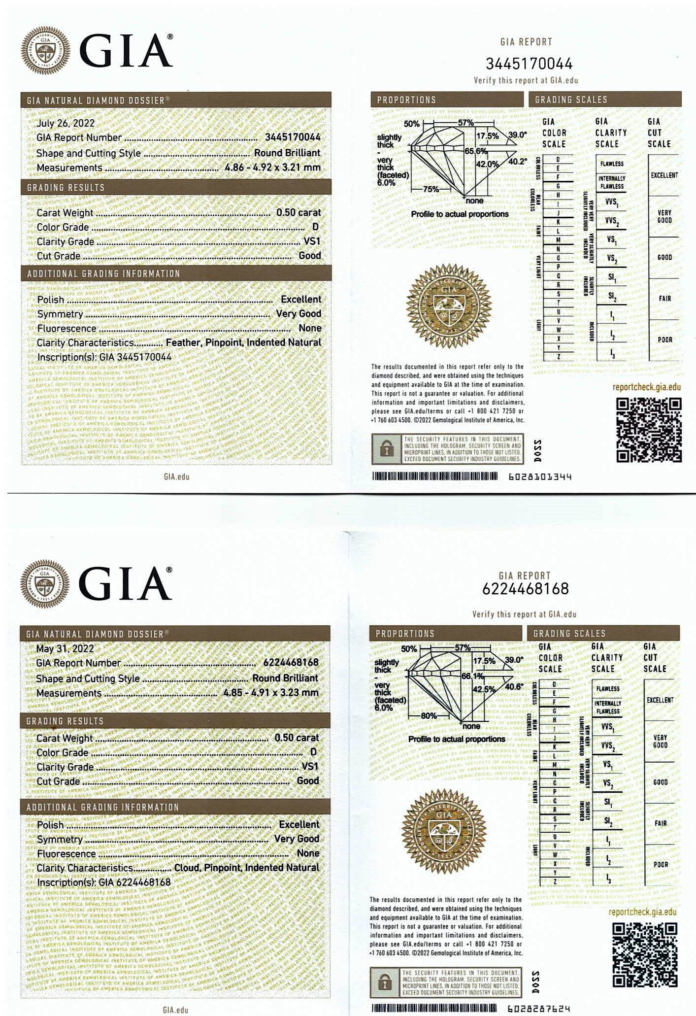 Diamond stud earrings with 2 round brilliant cut Diamonds totalling 1.00cts (both with GIA summary reports graded as D VS1 #16224468168, 3445170044). 18ct yellow gold. Weight: 1.2g. (New)