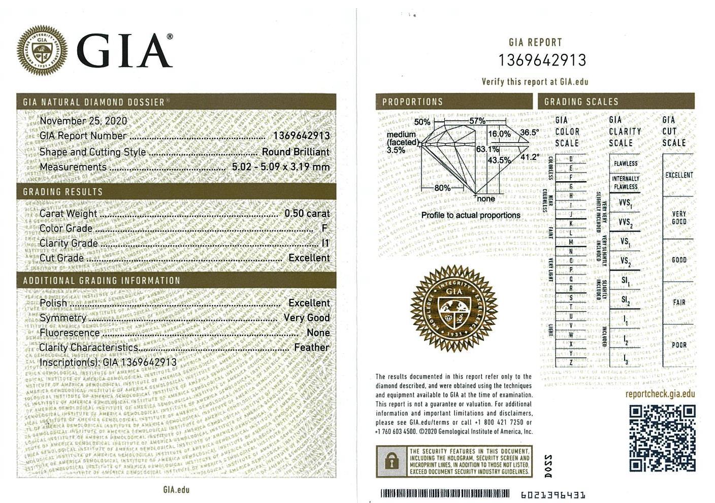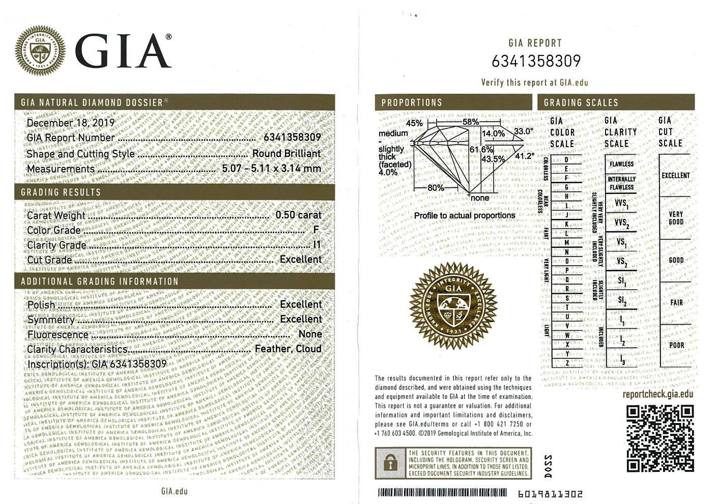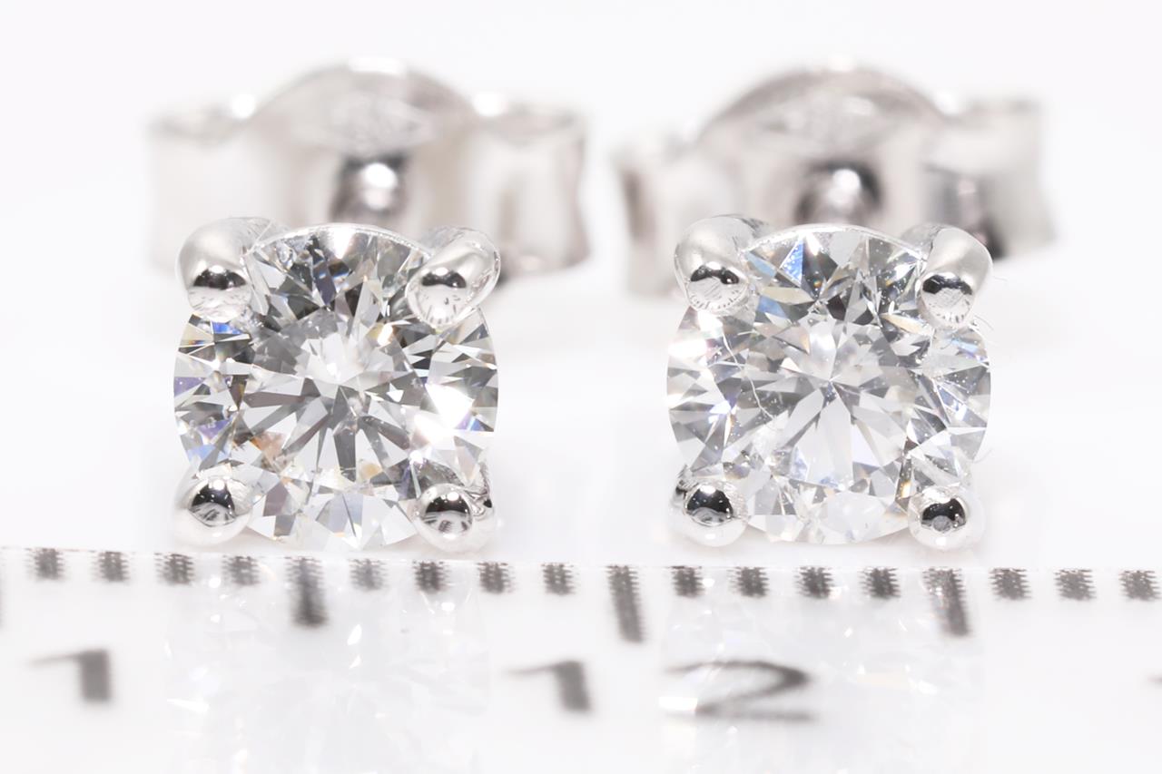 Diamond stud earring with 2 Round Brilliant Cut Diamonds totalling 1.00cts (with GIA report both graded as F P1 #1369642913, 6341358309). 18ct white gold. Weight: 2.3g (New)