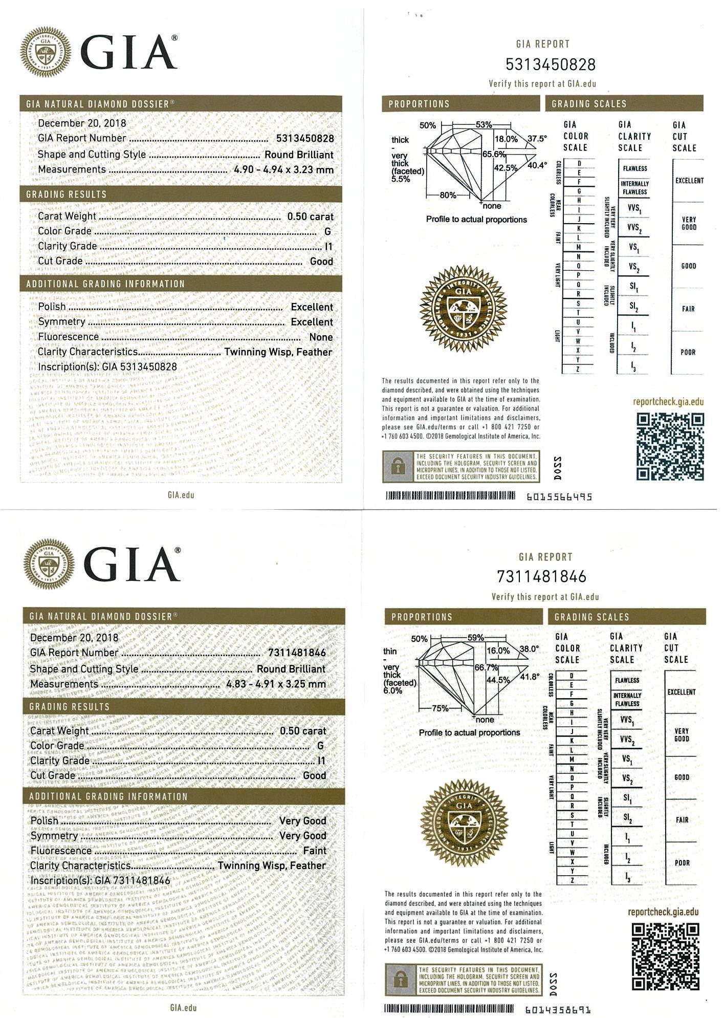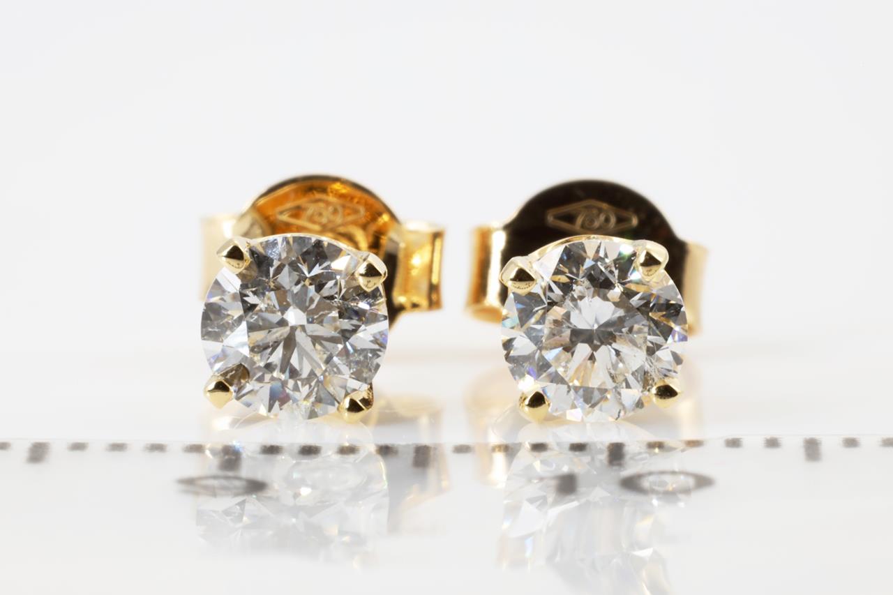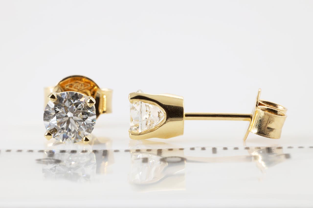 Diamond stud earrings with 2 round brilliant cut Diamonds totalling 1.00cts (with GIA reports graded as G P1 #5313450828, 7311481846). 18ct yellow gold. Weight: 1.7g. (New).