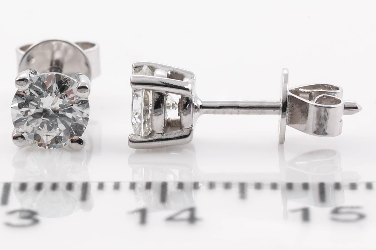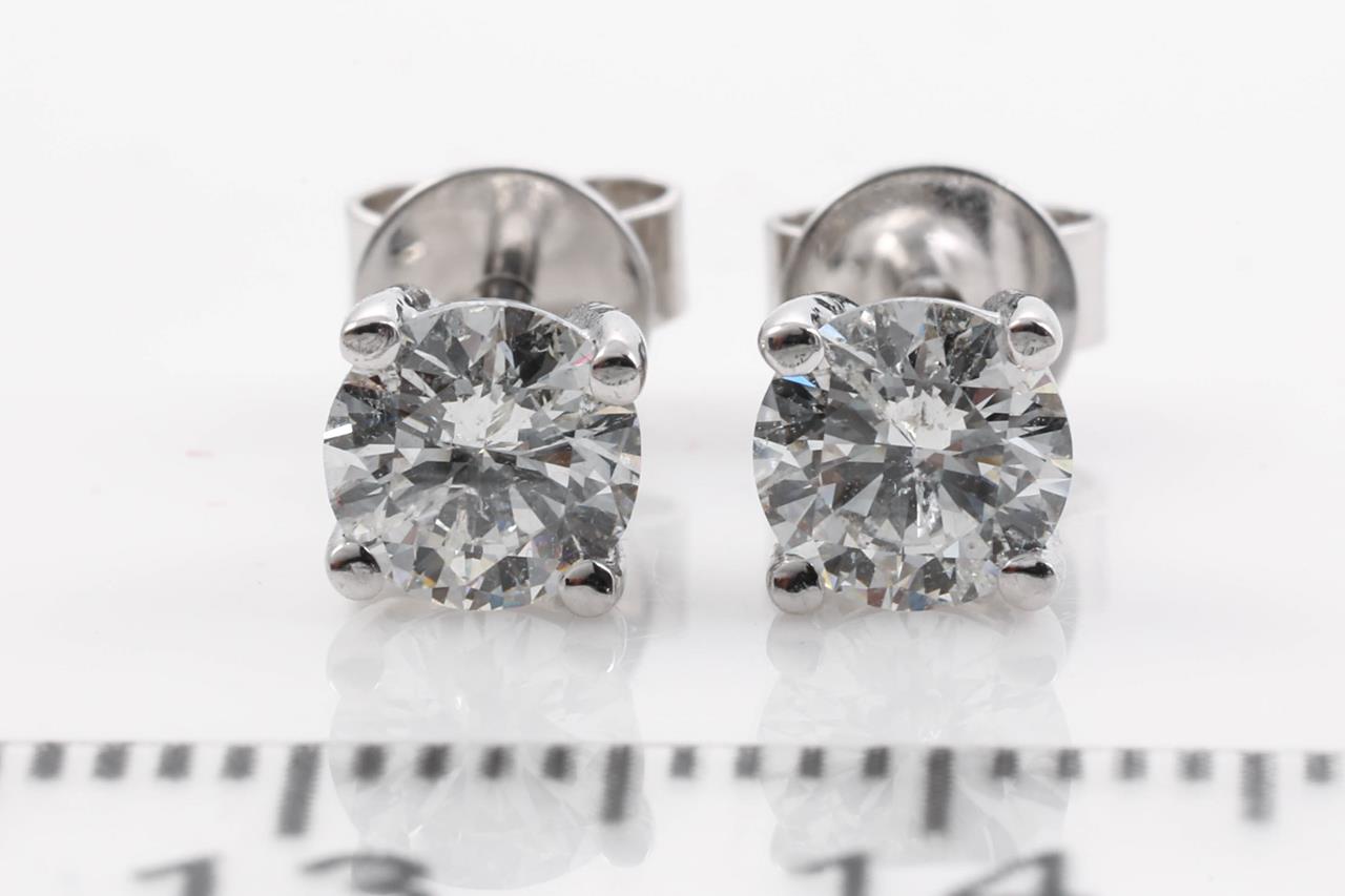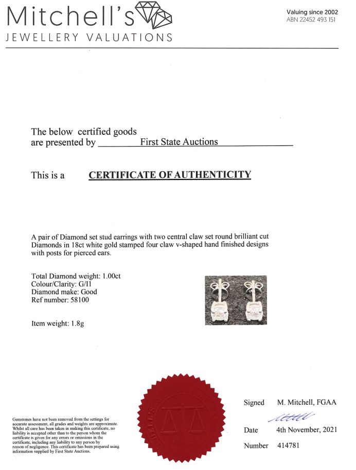Diamond stud earrings with 2 round brilliant cut Diamonds totalling 1.00cts (Estimated grading: G P1). 18ct white gold. With certificate #414781. Weight: 1.8g. (New).