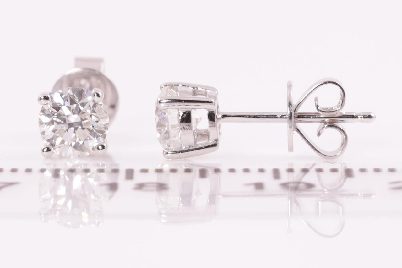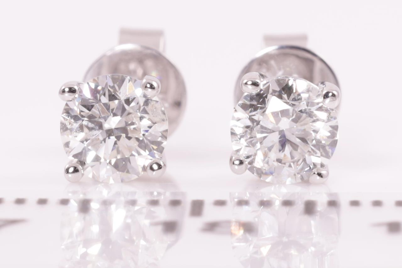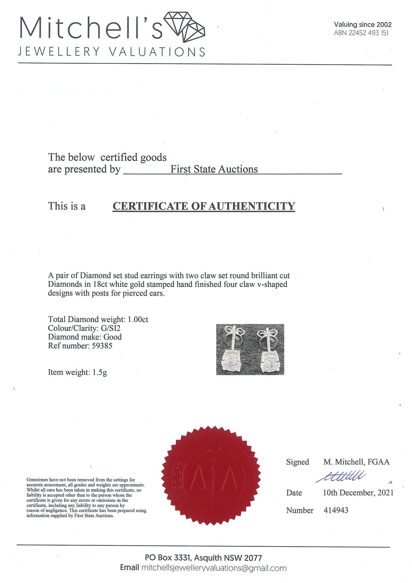 Diamond stud earrings with 2 round brilliant cut Diamonds totalling 1.00cts (Estimated grading: G SI2). 18ct white gold. Weight: 1.5g. With certificate #414943. (New).