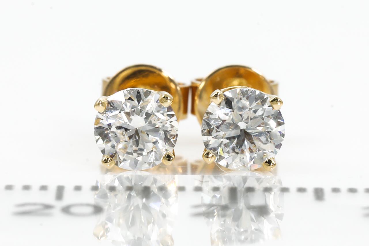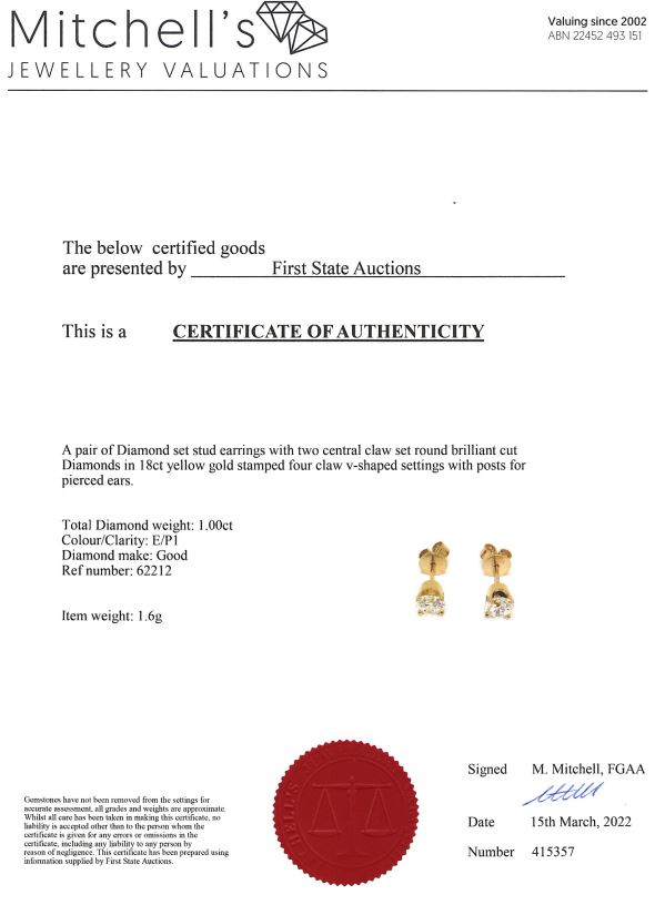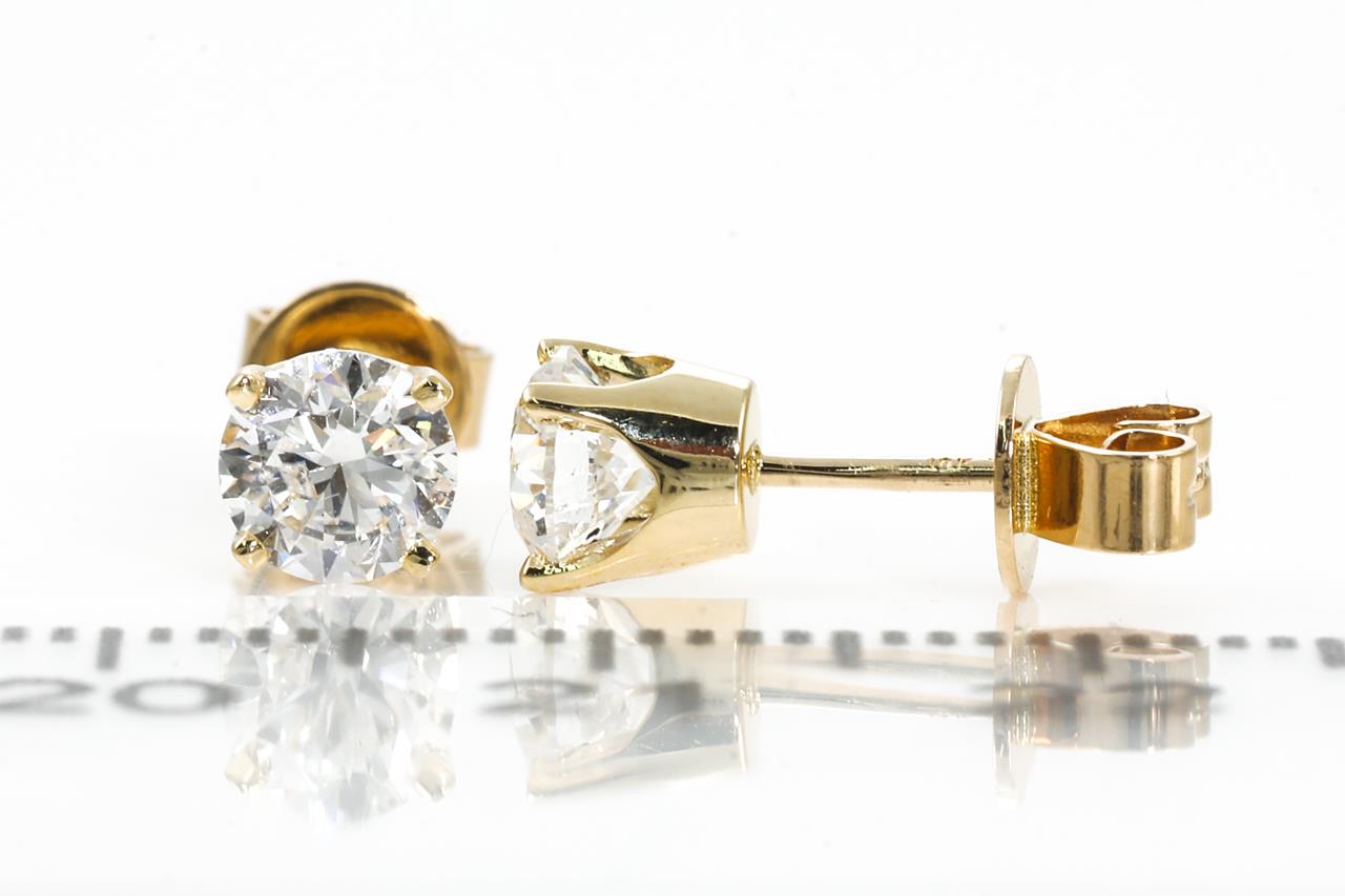 Diamond stud earrings with 2 round brilliant cut Diamonds totalling 1.00cts (Estimated grading: E P1). 18ct yellow gold. Weight: 1.6g. With certificate #415357. (New)