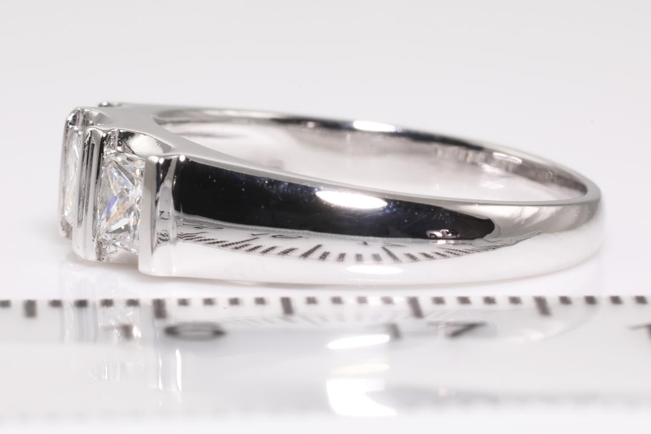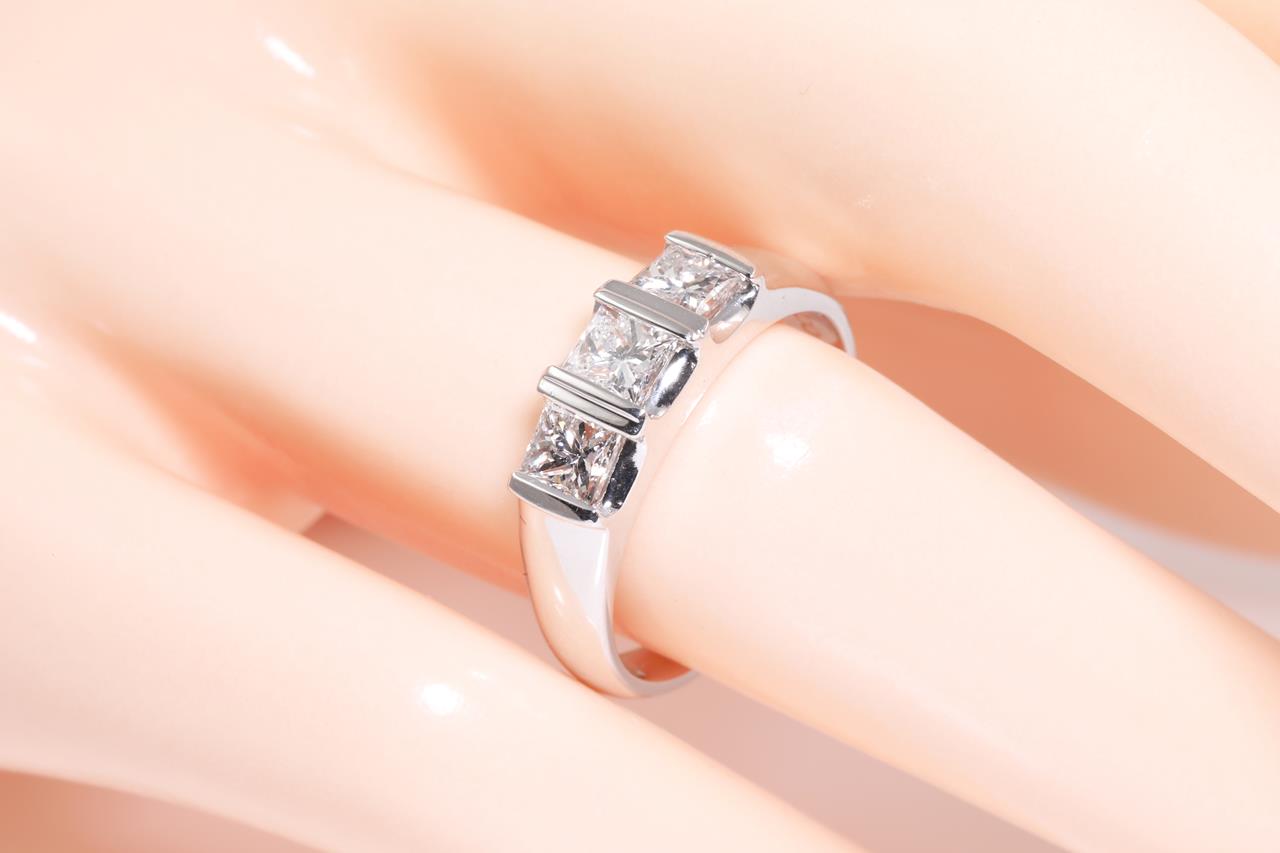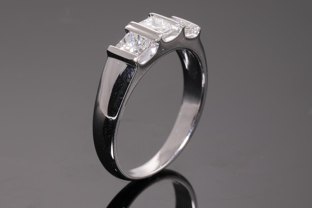 Diamond trilogy ring with 3 princess cut Diamond totalling 1.00cts (Estimated grading: H SI-P1). Platinum. Ring size N - cannot be resized up, down by ring clip only. Weight: 6.3g. (Pre-owned)