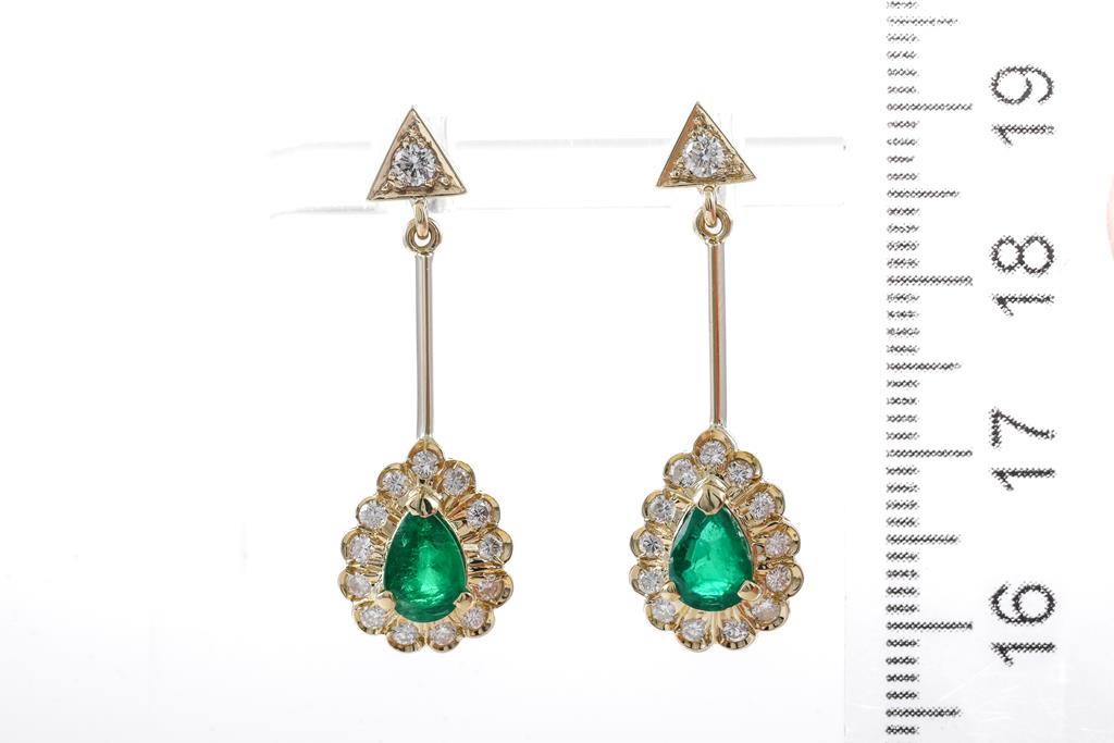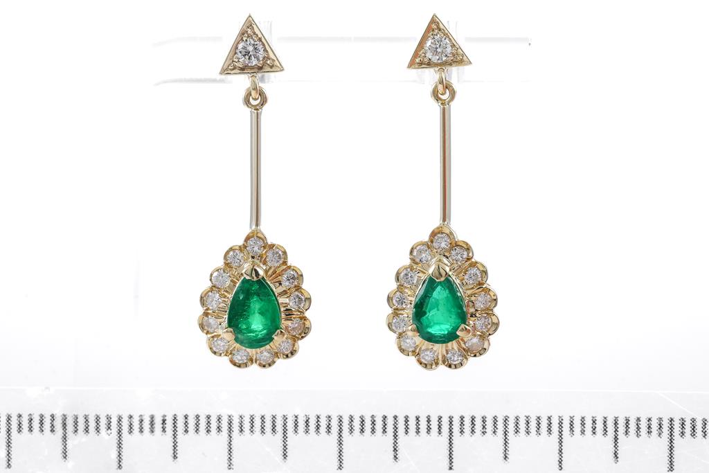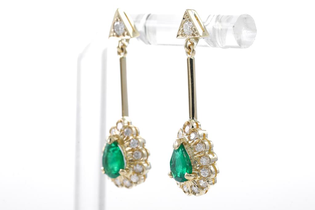 Emerald and Diamond earrings with pear shape Emerald totalling approximately 1.00cts and round Diamonds totalling approximately 0.43cts (Estimated Grading: H SI-P1). 18ct yellow gold with silicon backs. Weight: 4.6g. (Pre-owned)