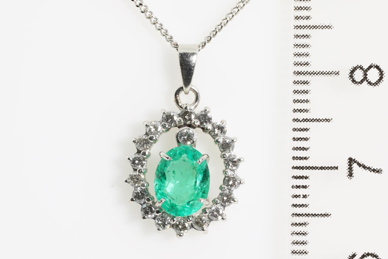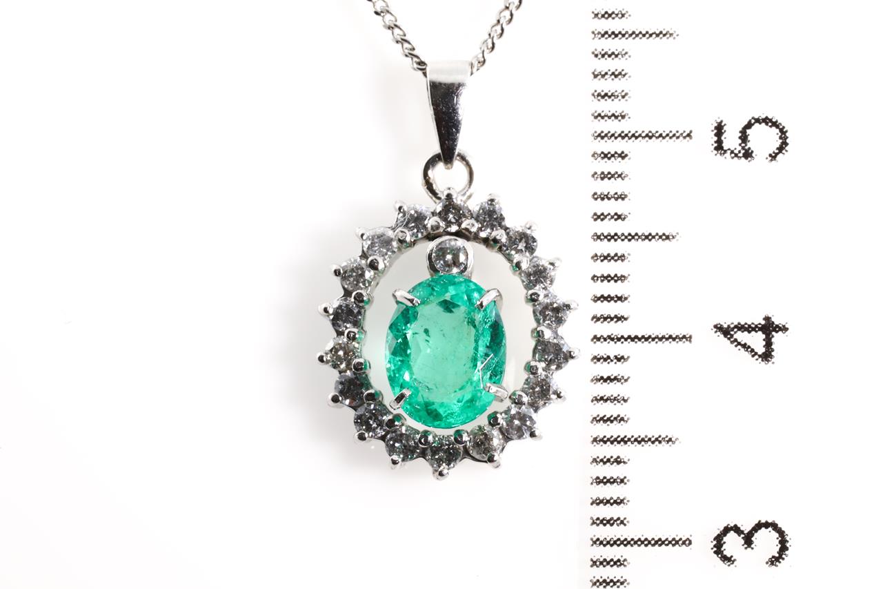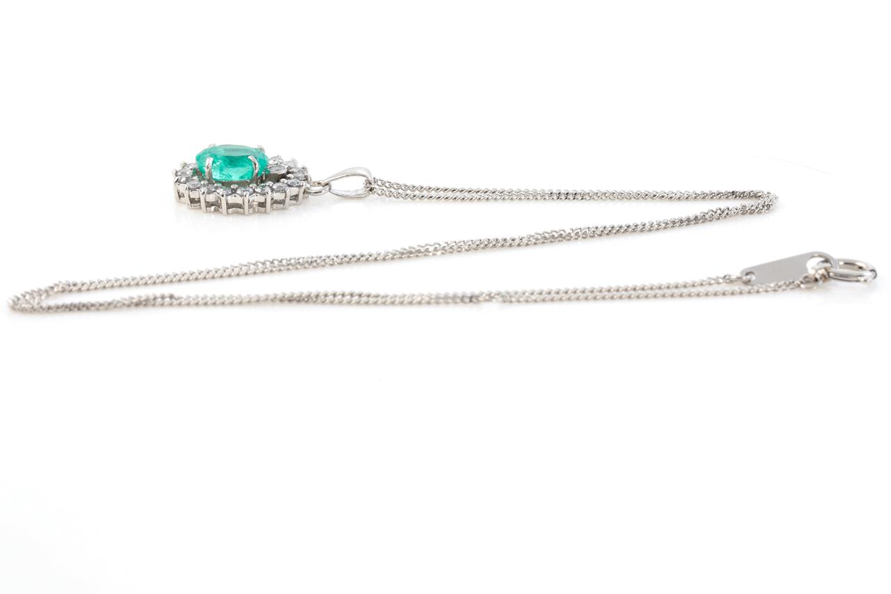 Emerald and Diamond pendant with oval shape Emerald of 1.00ct and Diamonds totalling 0.35cts (Estimated grading: G-H P1-2). Platinum with 41cm platinum chain. Weight: 4.90g (Pre-owned).