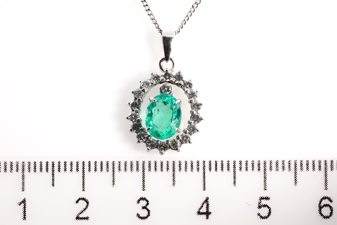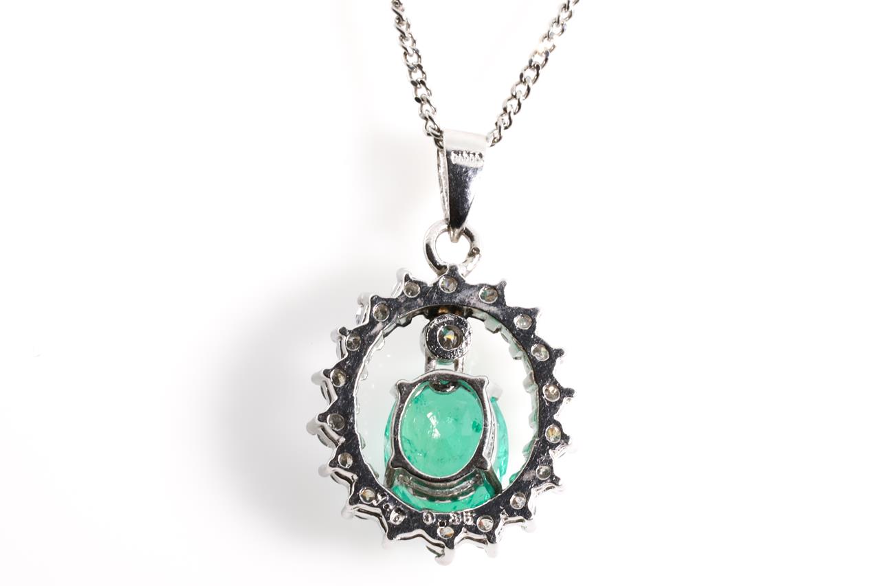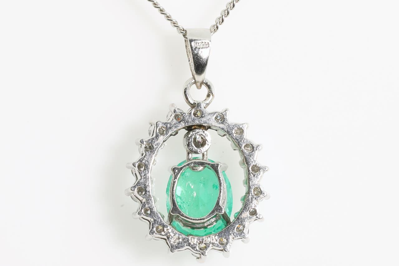 Emerald and Diamond pendant with oval shape Emerald of 1.00ct and Diamonds totalling 0.35cts (Estimated grading: G-H P1-2). Platinum with 41cm platinum chain. Weight: 4.90g (Pre-owned).