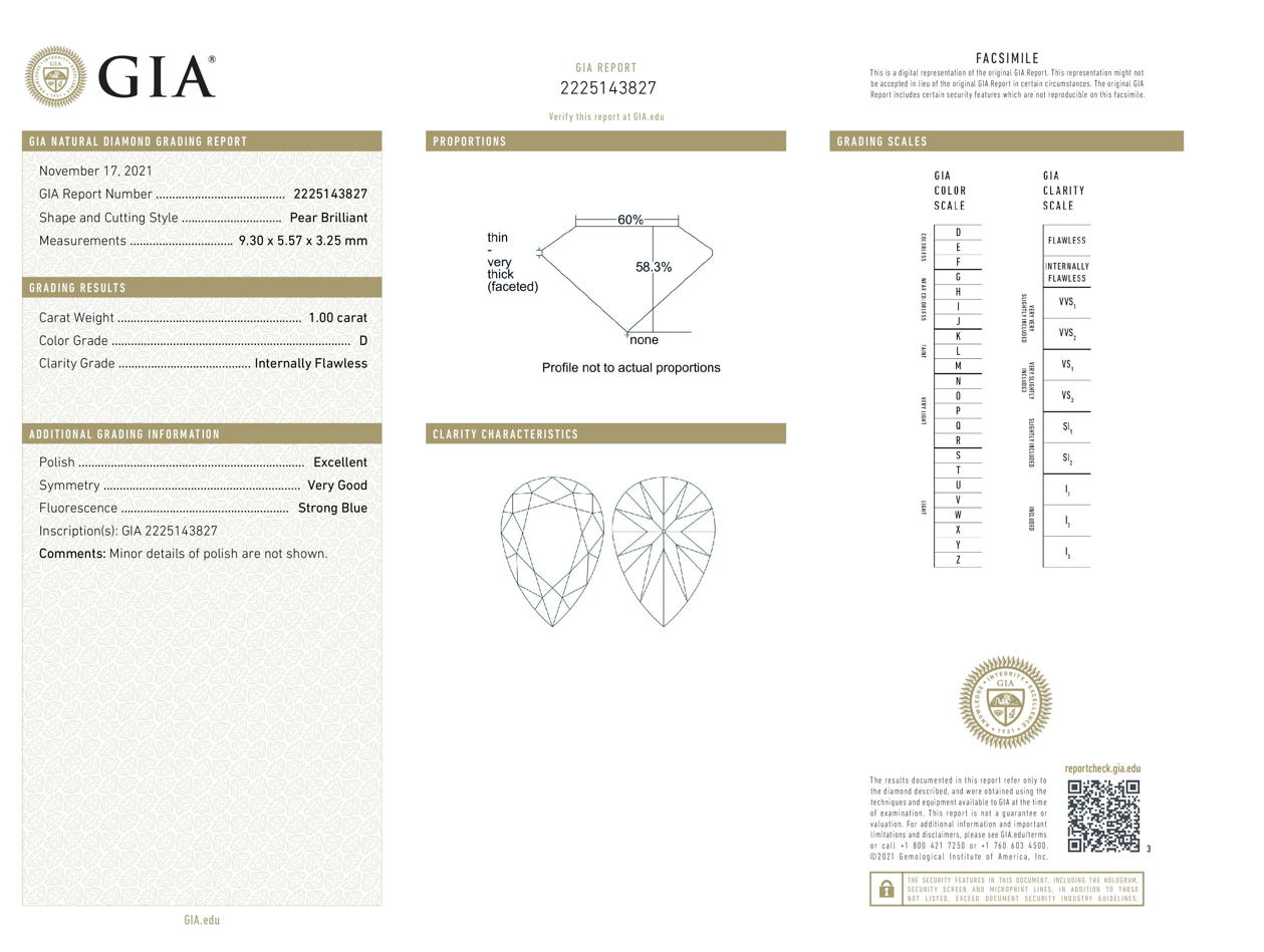 A loose Pear shape Diamond of 1.00ct (with GIA report graded as D IF #2225143827). (New)