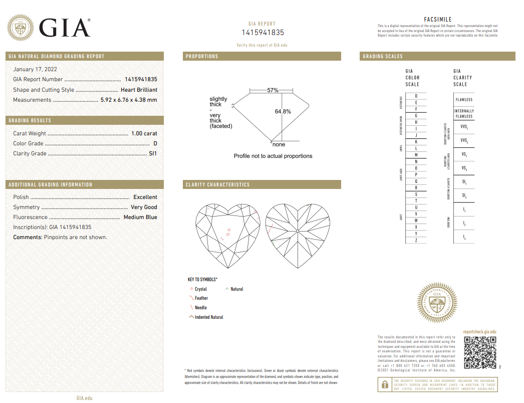 A loose heart brillliant cut Diamond of 1.00ct (with GIA report graded as D SI1 #1415941835). (New)