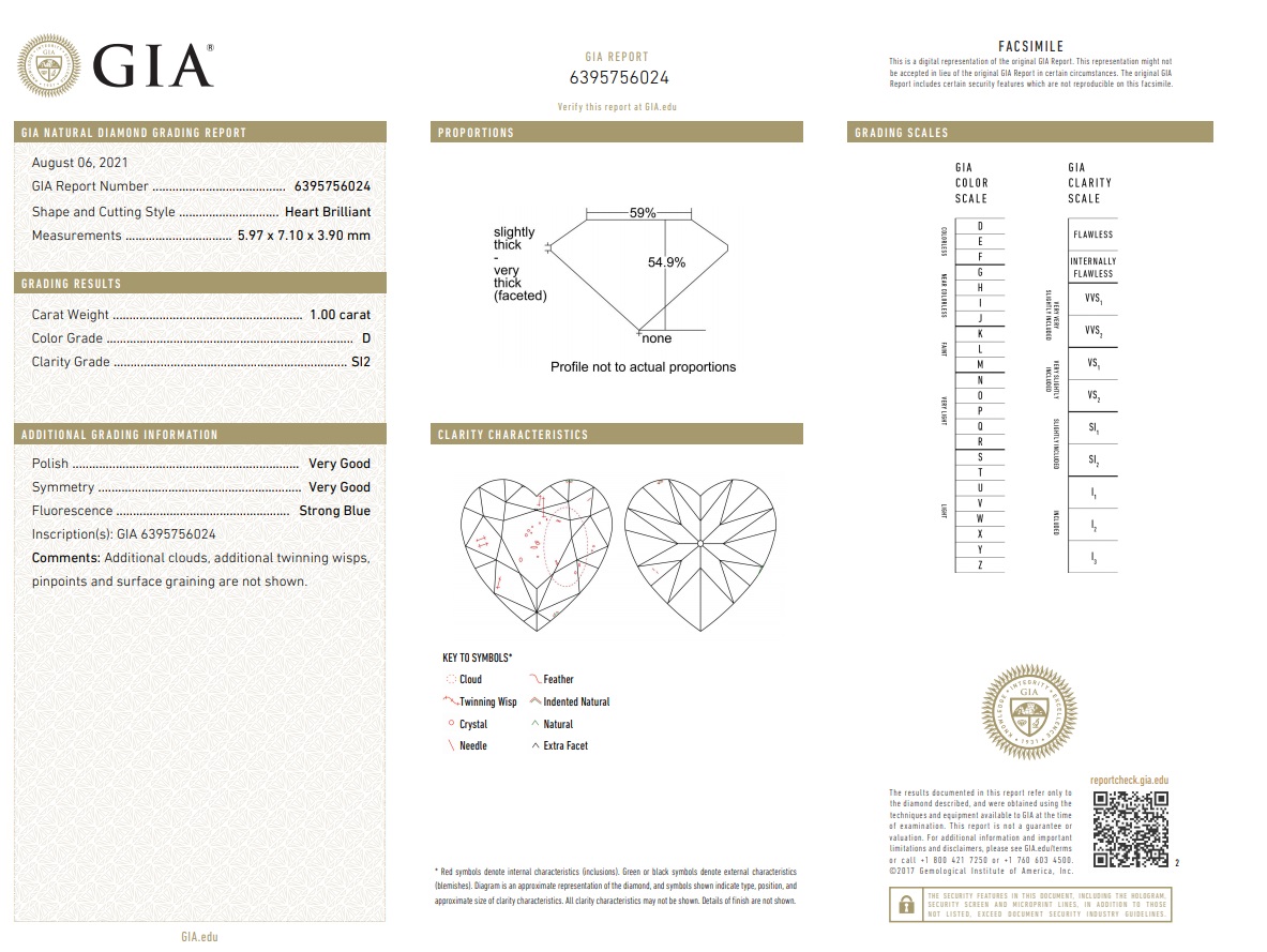 A loose heart shape Diamond of 1.00ct (With GIA summary report graded as D SI2 #6395756024). (New)