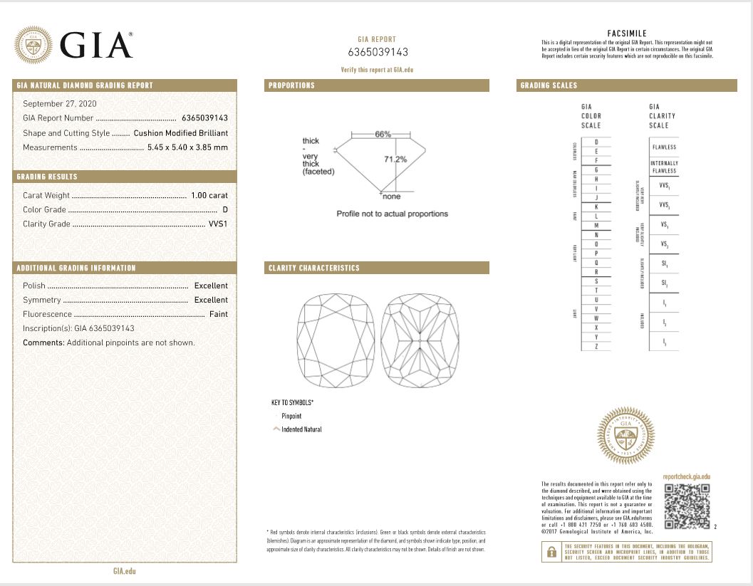 A loose Cushion Cut Diamond of 1.00ct (with GIA report graded as D VVS1 #6365039143). (New)