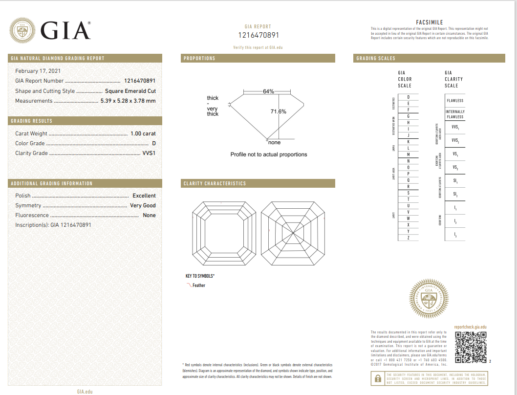 A loose square Emerald Cut Diamond of 1.00ct (with GIA report graded as D VVS1 #1216470891). (New)