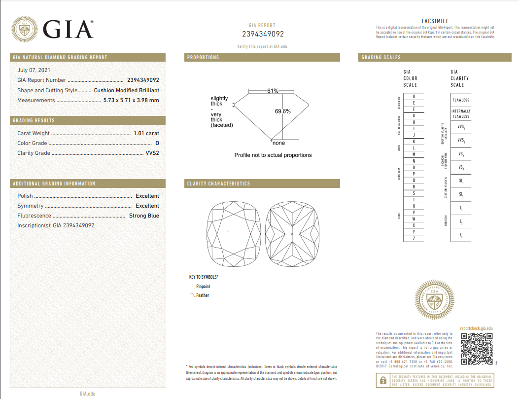 A loose Cushion cut Diamond of 1.00ct (With GIA report graded as D VVS2 #2394349092). (New)
