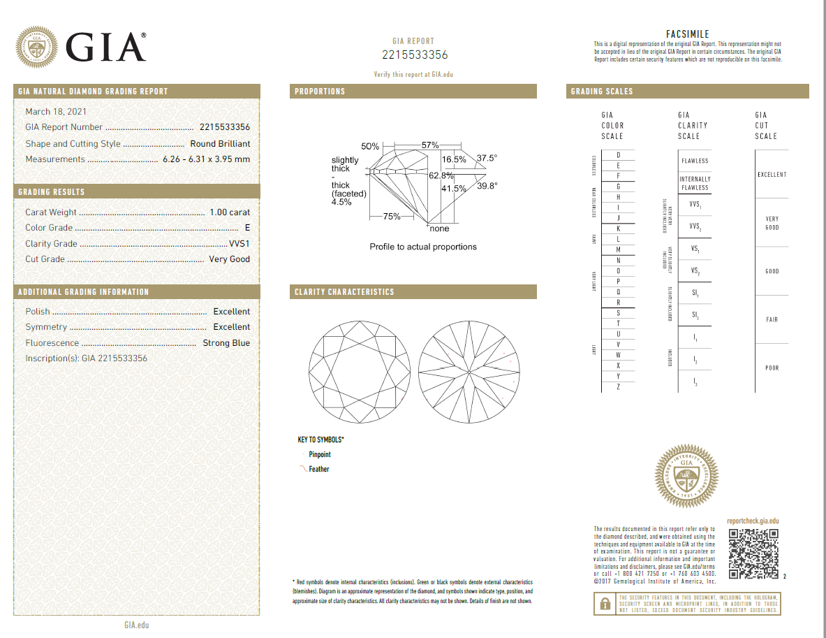 A loose round brilliant cut Diamond of 1.00ct (with GIA report graded as E VVS1 #2215533356). (New)