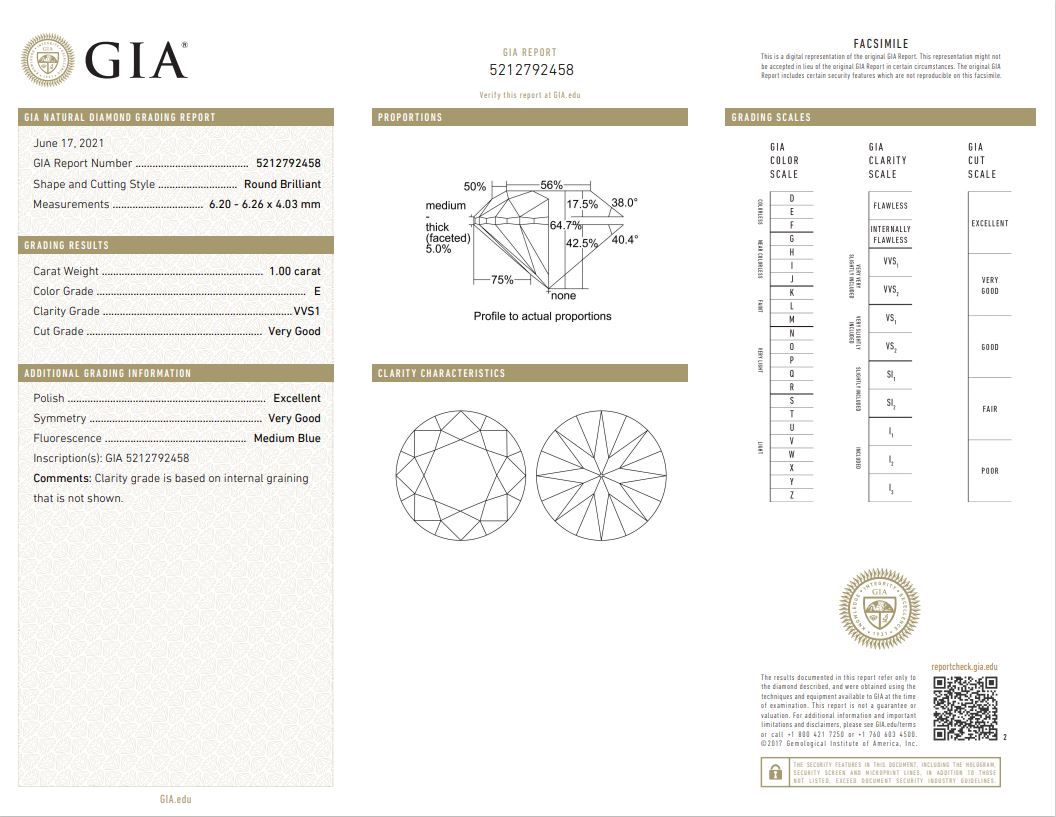 A loose Round brilliant cut Diamond of 1.00ct (with GIA report graded as E VVS1 #5212792458). (New)