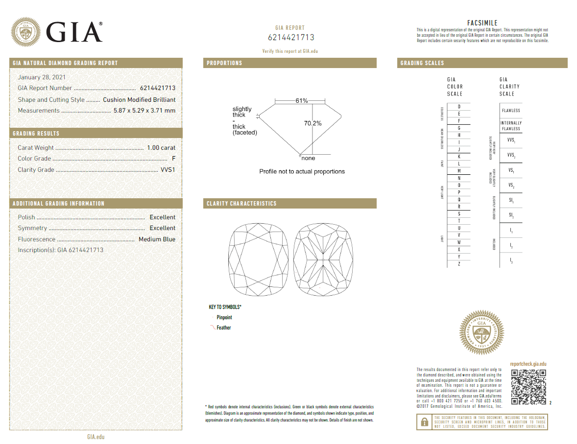 A loose cushion cut Diamond of 1.00ct (with GIA report graded as F VVS1 # 6214421713). (New)
