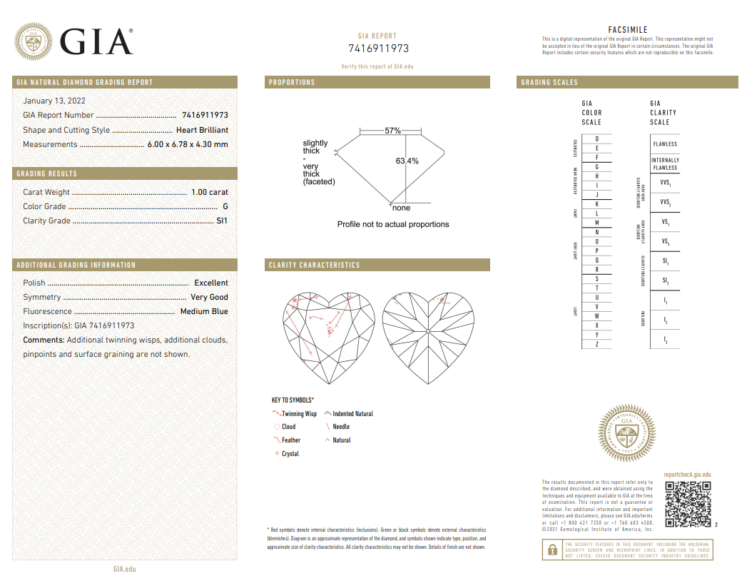 A loose heart shaped Diamond of 1.00ct (with GIA report graded as G SI1#7416911973). (New)