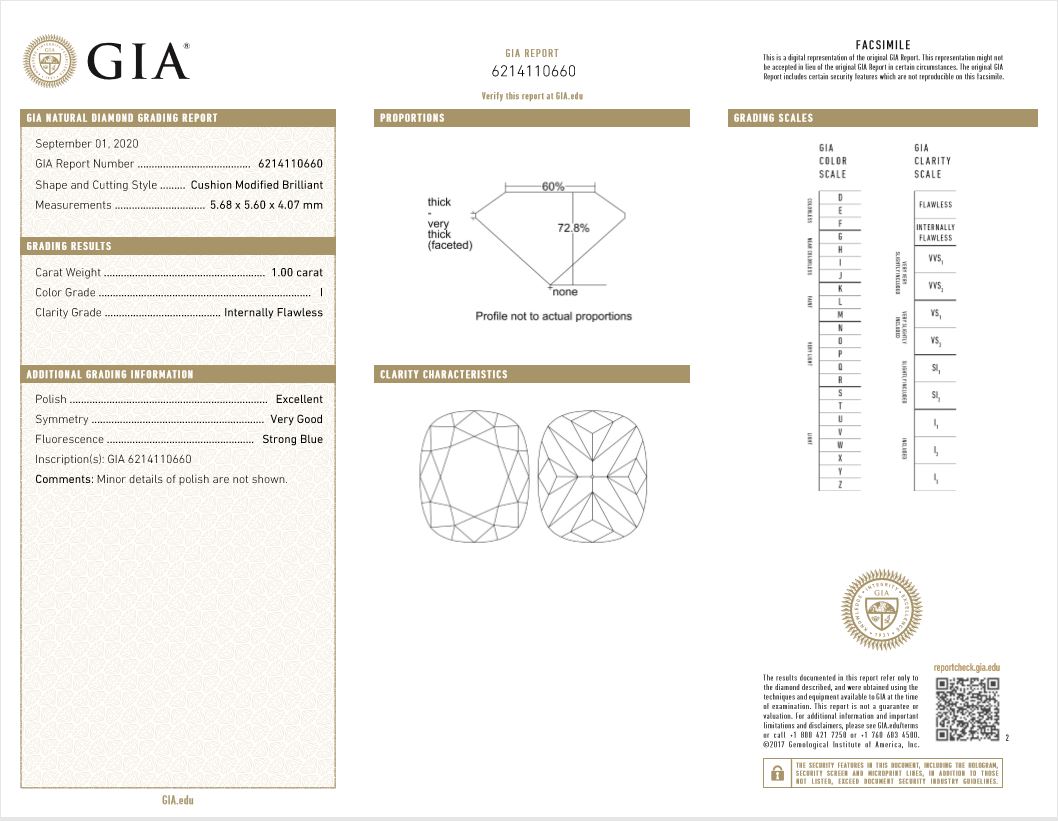 A loose Cushion Cut Diamond of 1.00ct (with GIA report graded as I IF #6214110660). (New)